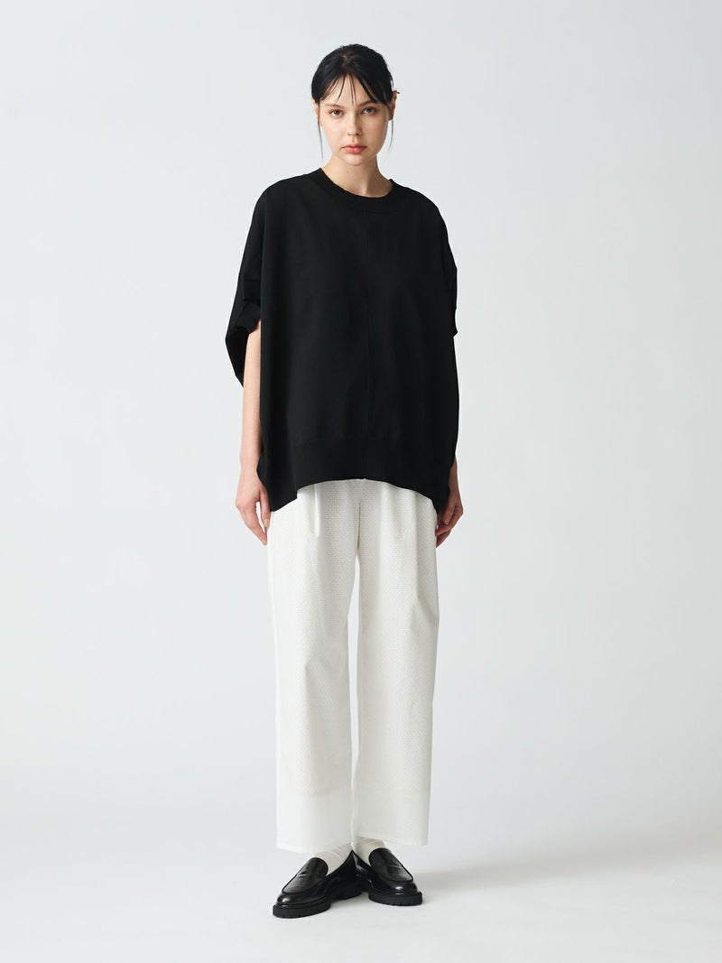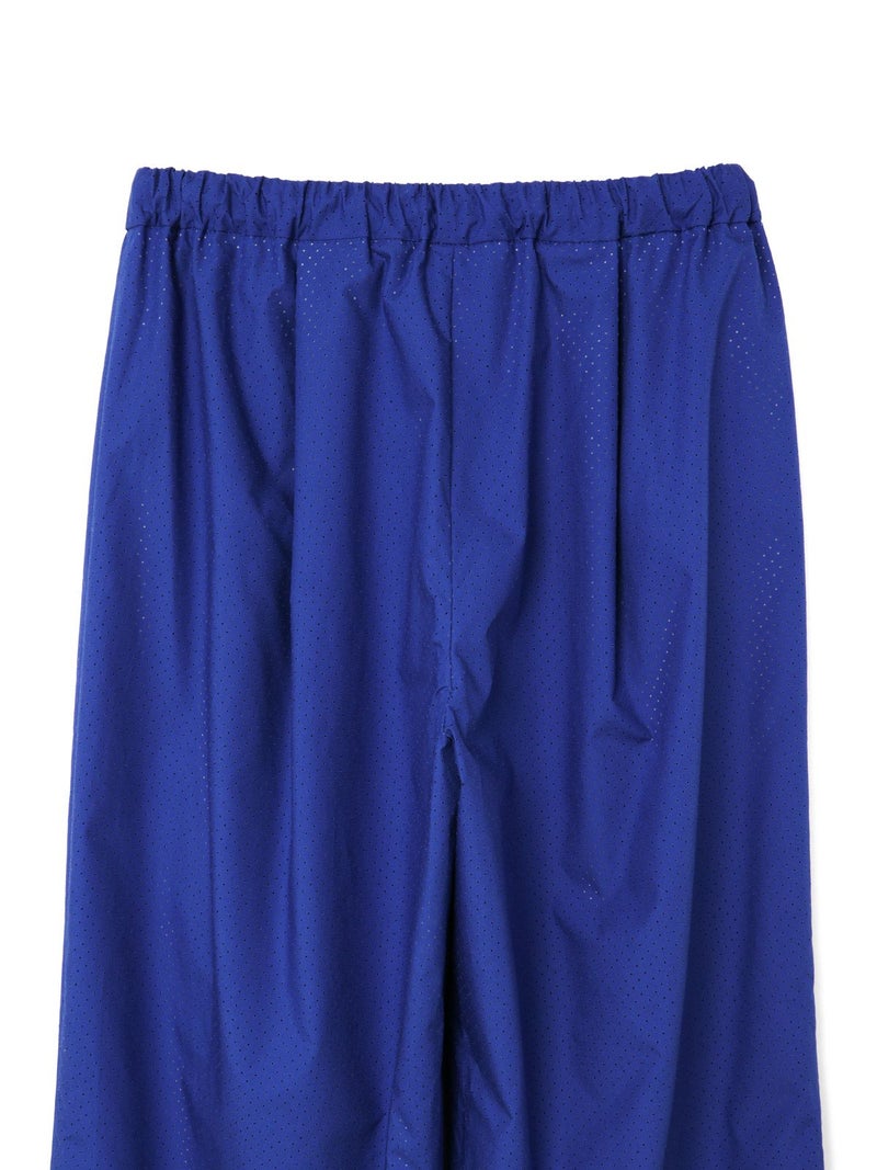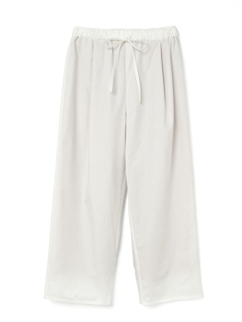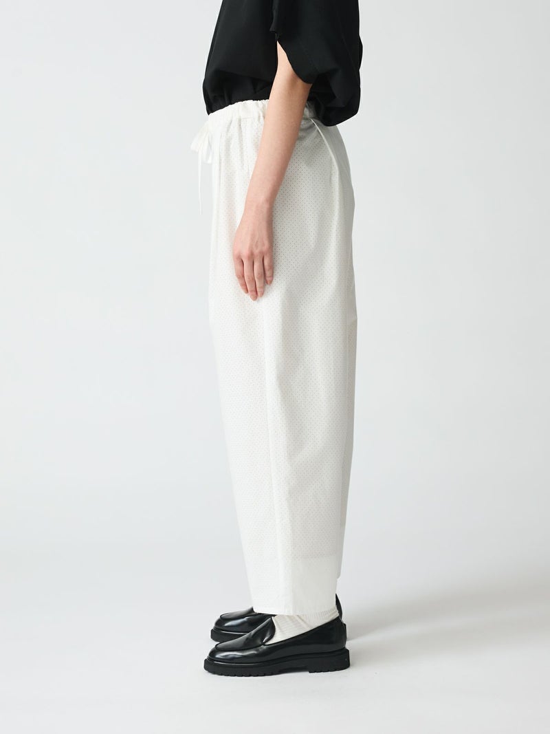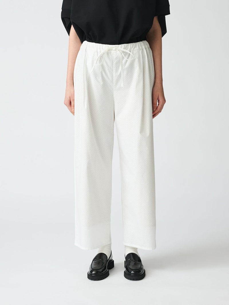 50タイプライターにパンチング加工を施したパンチングイージーパンツです。mizuiro indオリジナル素材を使用した爽やかな1枚です。オフホワイトはベージュの裏地付きなので透け感を気にせず着用していただけます。ウエストはリラックス感のあるゴム使用に調整紐付き。1-230072/パンチングワイドシャツも展開。シンプルで上品なイージーパンツです。