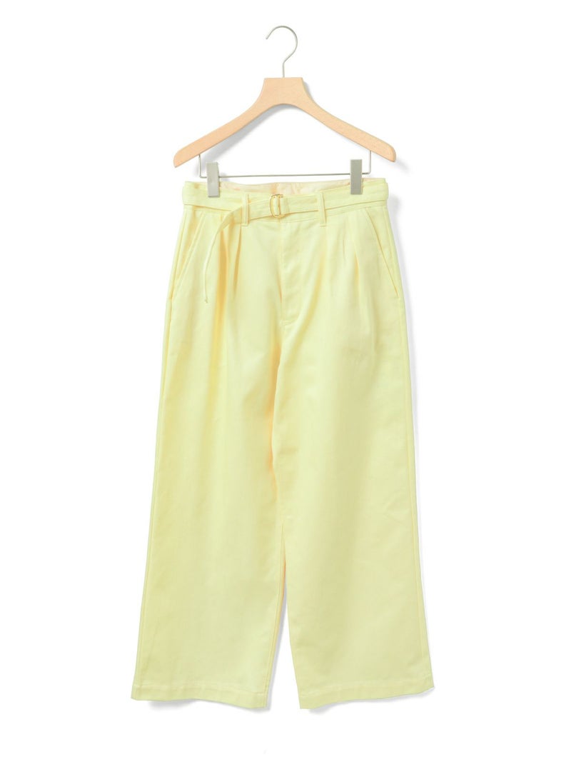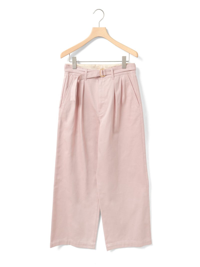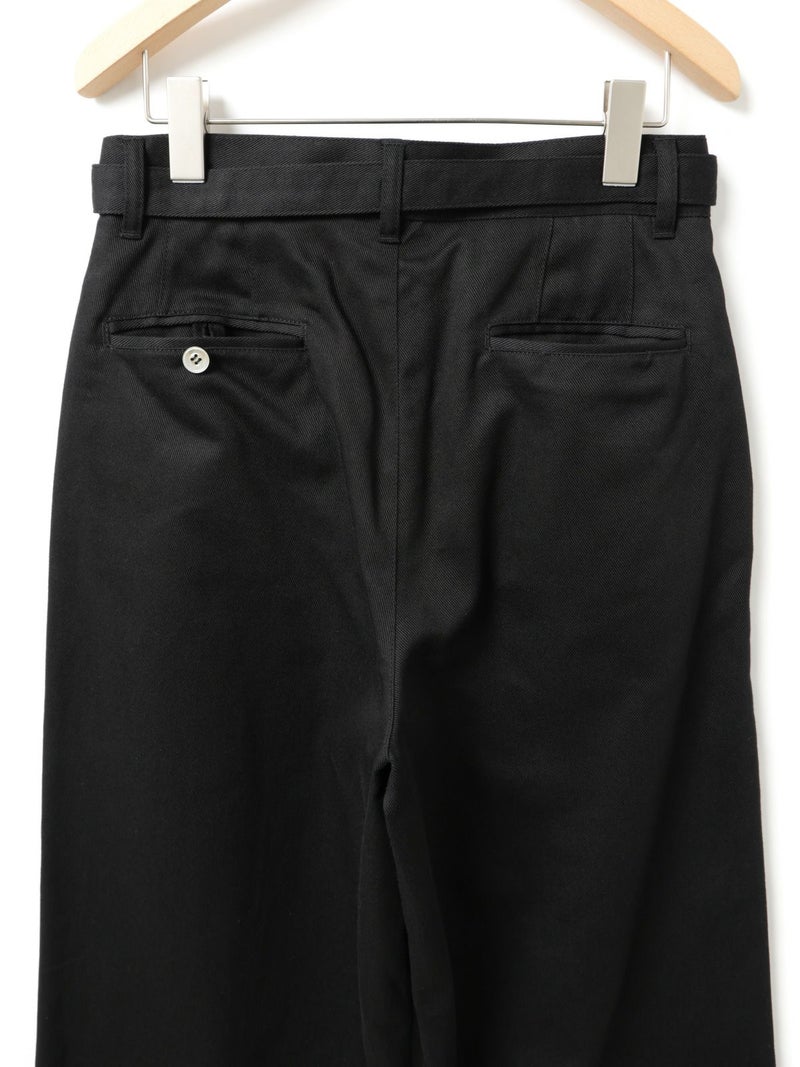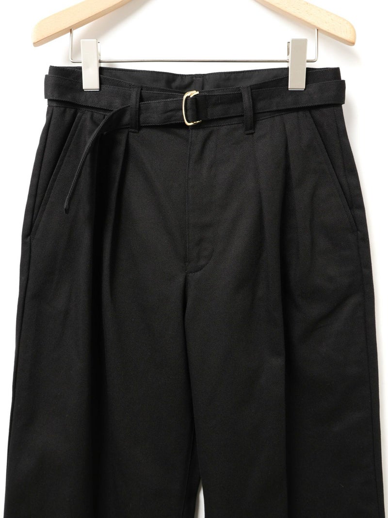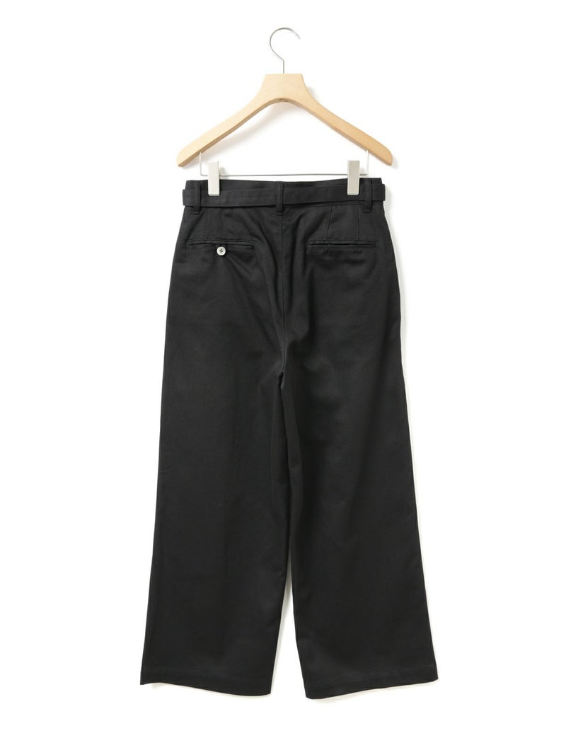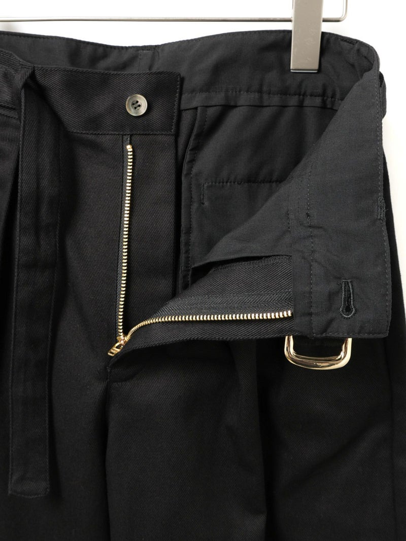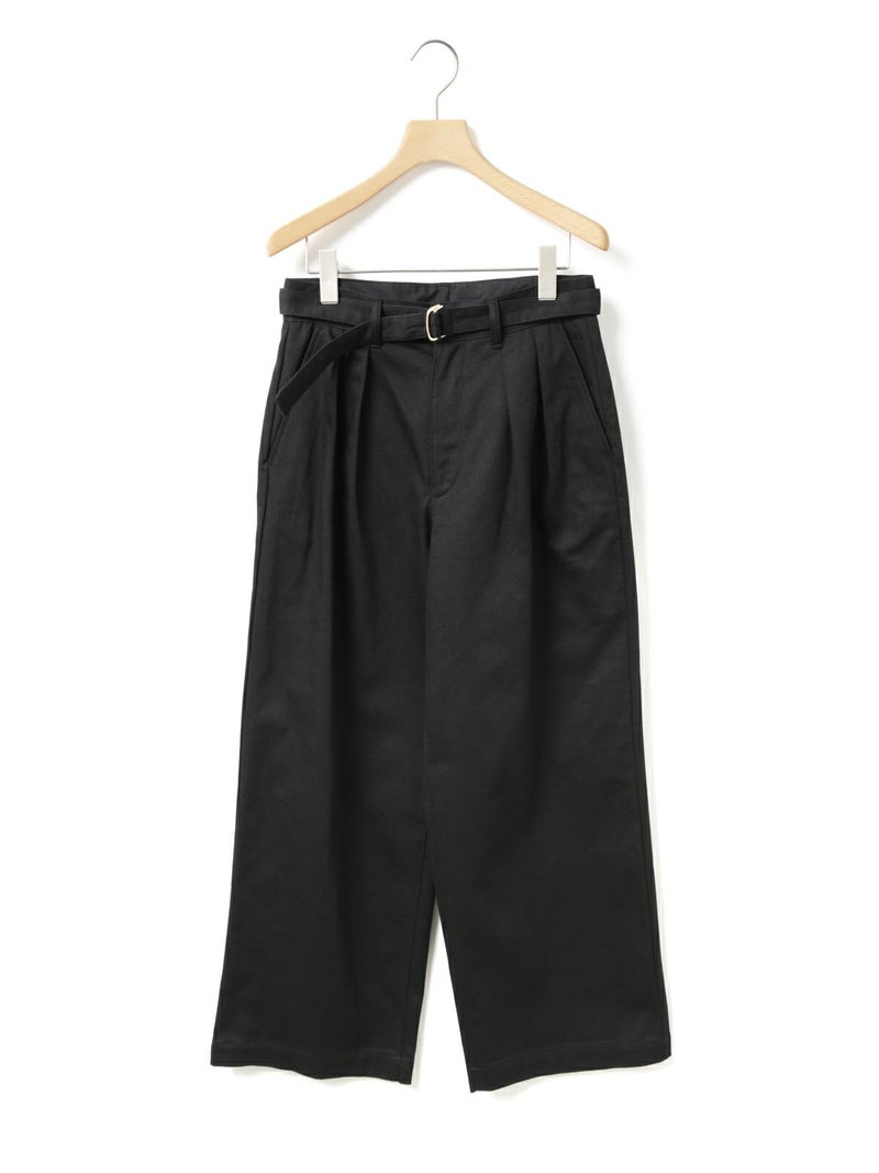ヴィンテージのパンツから着想を得たドリルツータックトラウザーズです。強い撚りを持つ太い糸で織られた厚手で丈夫な生地が特徴のドリル生地を使用。ゴールドのバックルがポイント。程よくゆとりのあるサイズ感で大変穿きやすい1枚。色によって白シャツ・白Tに合わせて今っぽく、黒はフリルシャツなどに合わせてもMARMARMARっぽい着こなしを演出していただけます。ベルトは取り外し可能です。