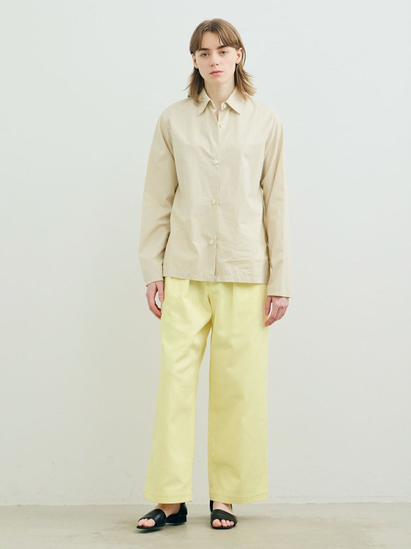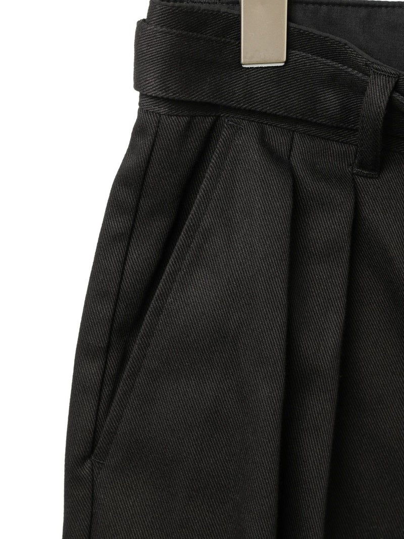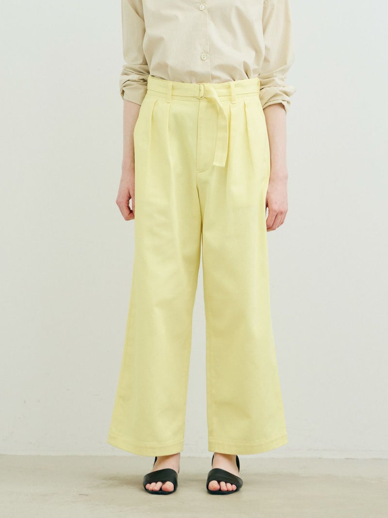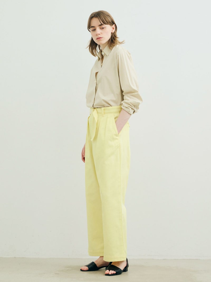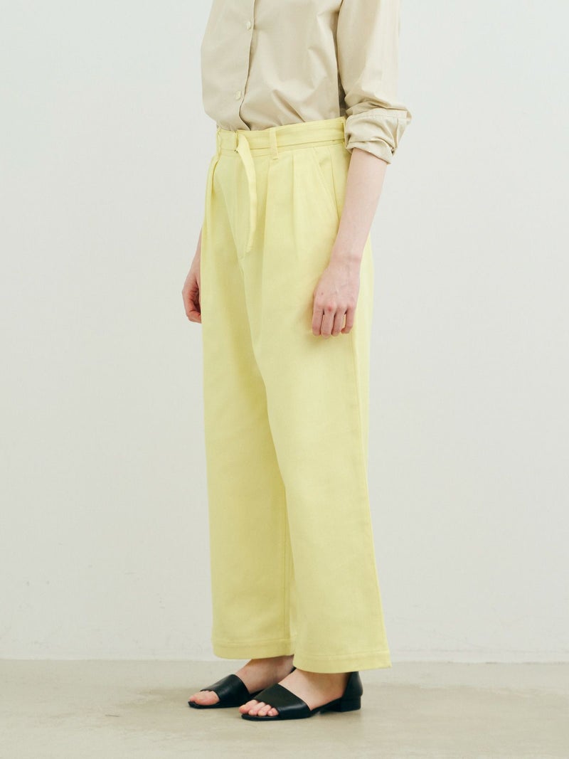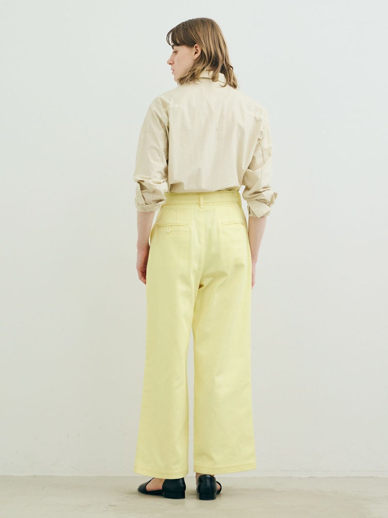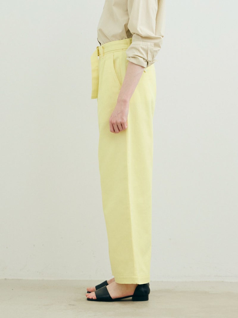 ヴィンテージのパンツから着想を得たドリルツータックトラウザーズです。強い撚りを持つ太い糸で織られた厚手で丈夫な生地が特徴のドリル生地を使用。ゴールドのバックルがポイント。程よくゆとりのあるサイズ感で大変穿きやすい1枚。色によって白シャツ・白Tに合わせて今っぽく、黒はフリルシャツなどに合わせてもMARMARMARっぽい着こなしを演出していただけます。ベルトは取り外し可能です。