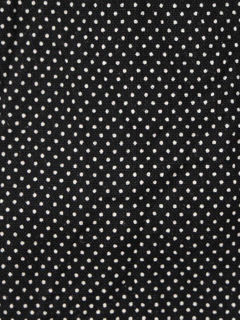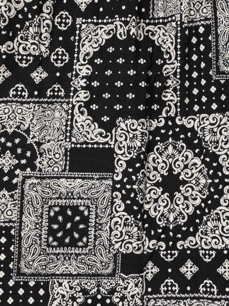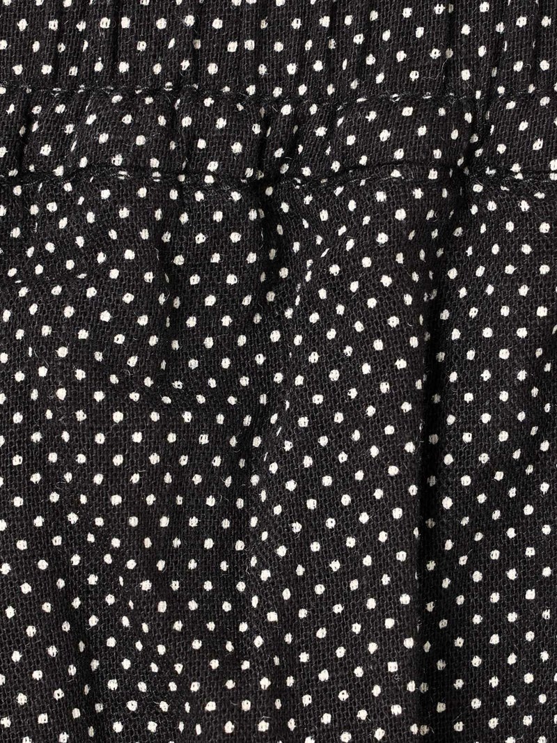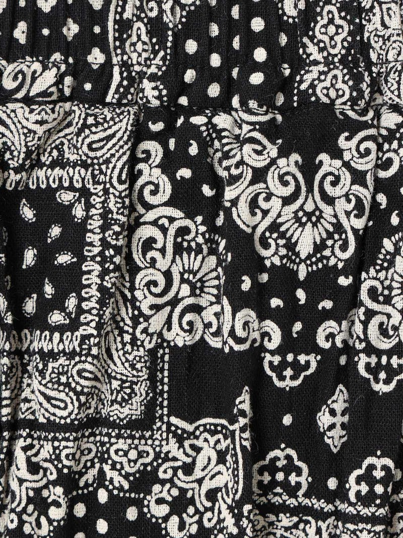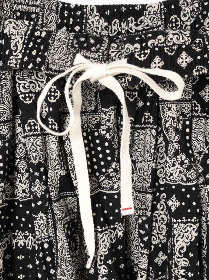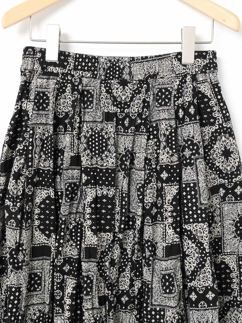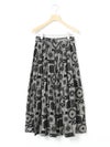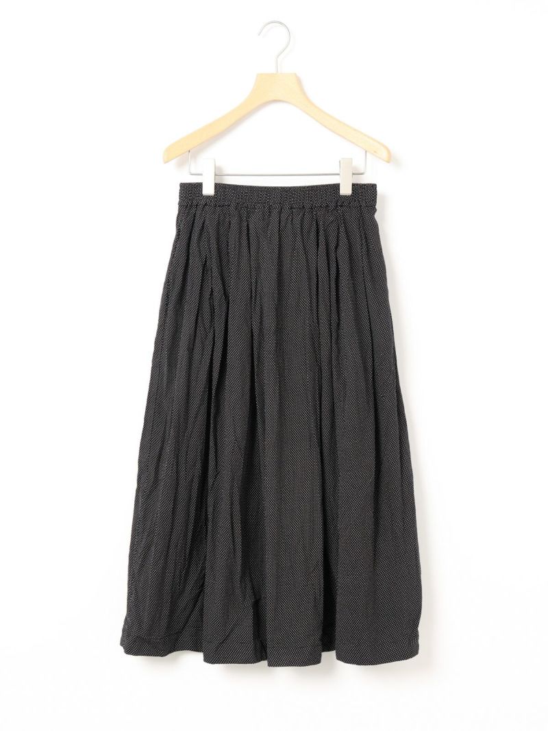 シルエットにこだわったシンプルなスカート、タックボリュームコクーンスカートです。ブラックのみのワントーンに絞りピンドット柄とバンダナ柄の2柄で展開しました。丸みを帯びたボリュームシルエットがポイント。ミドル丈なので身長を問わず着用可能。トップスインのコーデはもちろん、短丈やコンパクトなトップスとさらっと合わせてもサマになるのでこれからの季節に活躍するアイテム。少し薄手でフォークロア調のインド素材を使用。シワ感を残した洗い仕上げも雰囲気が良く魅力的です。ウエストに通したキナリの紐と紐端に効かせた赤のステッチでカジュアル感と元気な印象を加えブランドらしいポイントに。ウエストはゴム使用なので気軽にコーディネートができる1枚です。同型2-860042(無地)も展開。