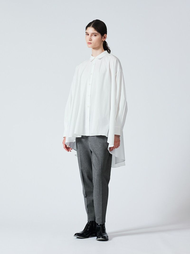カットポンチ素材を使用したストレッチ性のあるなめらかな肌触りが特徴のジャージーセンタープレスパンツ。着心地もよく型崩れも少なくお洗濯もしやすいのもポイント。程よいパンツ幅でラフ過ぎずきちんと感を印象付けます。ウエストをゴム使用にしたリラックス感のあるデザインでmizuiro indらしい着こなしを表現します。同シリーズの3-210060/クルーネックコクーンプルオーバーとのセットアップがおすすめで、秋の季節感を演出していただける1枚です。