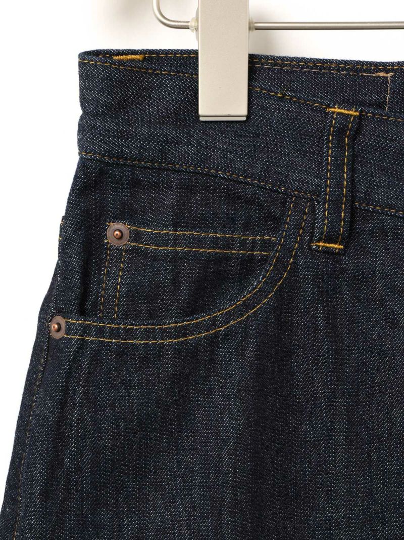 メンズっぽさのあるワイドシルエットが特徴のワイドデニムです。腰の位置を2wayで設定しています。ウエスト寸は腰で留まるくらいのゆとりが少しあるサイズ設定。ローウエストでメンズのデニムを穿いているようなダボっとさが魅力です。股上を長く設定しており、ベルトで留めてハイウエストで着ることができ、ハイウエストで着た時はローウエストとはまた違ったシルエットになり今季らしいハイウエストシルエットを表現。ハイウエストで着用したときにワンクッションあるくらいの着丈設定ですので、お好みでロールアップや丈バランスを楽しんでいただけます。10OZ デニムを使用(※定番デニムよりやや薄い生地感となっています)