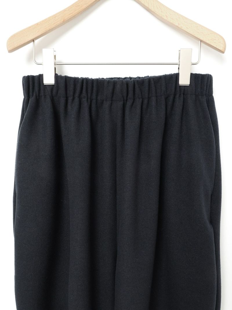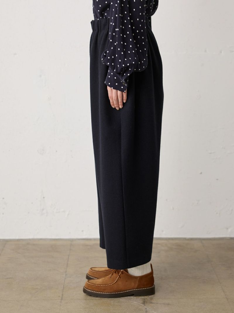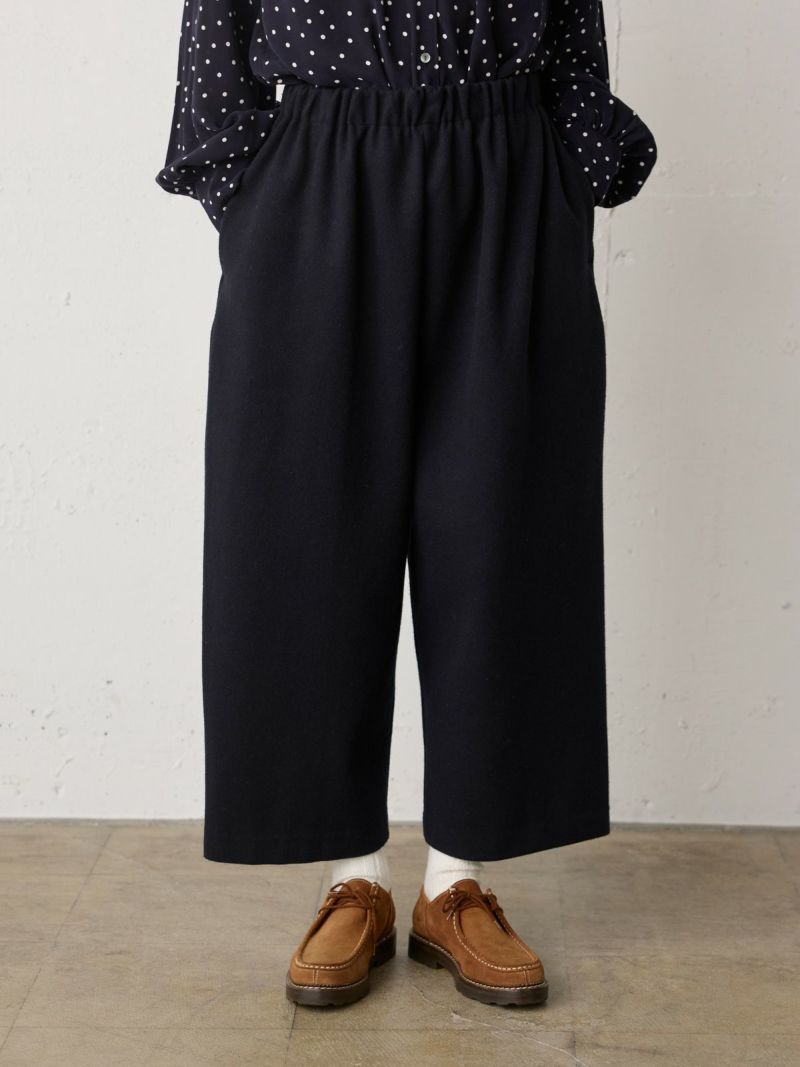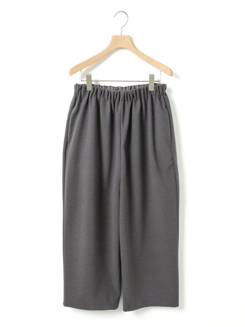 ウールフラノタッチのリサイクルポリエステル素材を使用したイージークロップドパンツが再入荷しました。裏なしでもチクチクしなく吸湿発熱の機能もある素材なので寒い季節に最適で温かさを体感していただけます。ウエストはリラックス感のあるゴム使用。クロップド丈なのでブーツ合わせもオススメ。見た目にも温かさを感じとっていただける1枚です。同シリーズのアイテムとセットアップでの着用もおすすめです。同シリーズ 4-760014/ショートパンツや4-770024/ノーカラージャケット、4-710017/ベストも展開。
