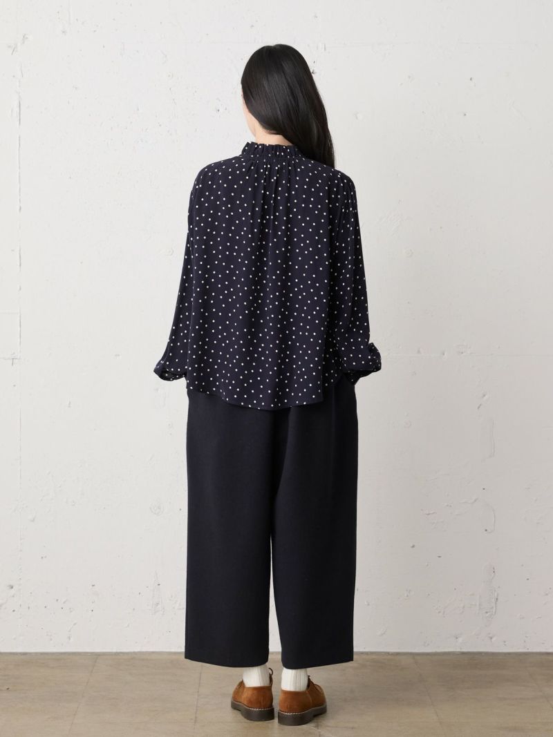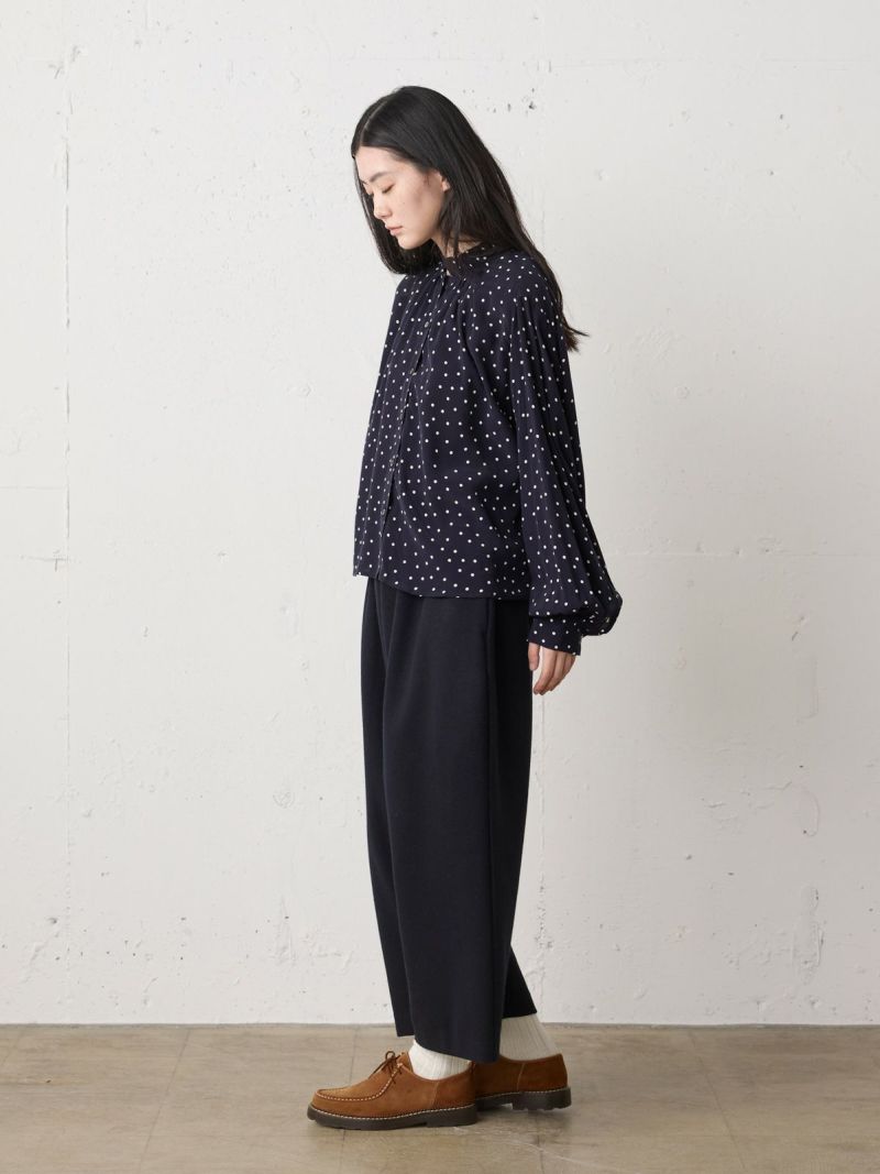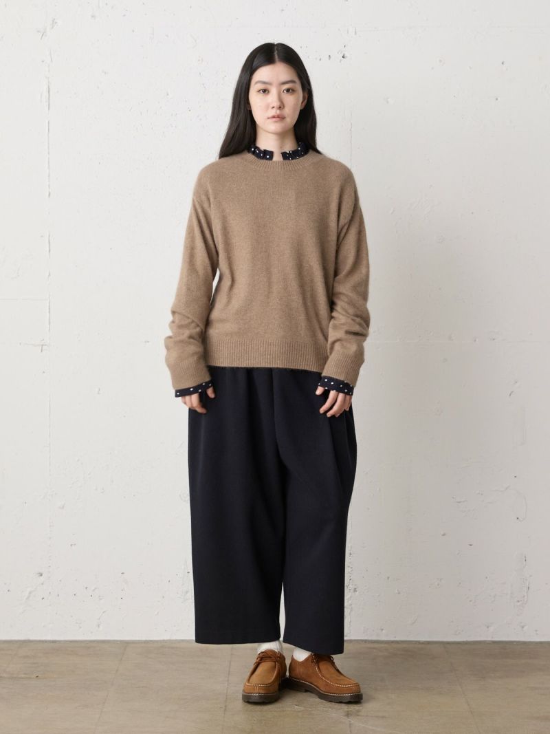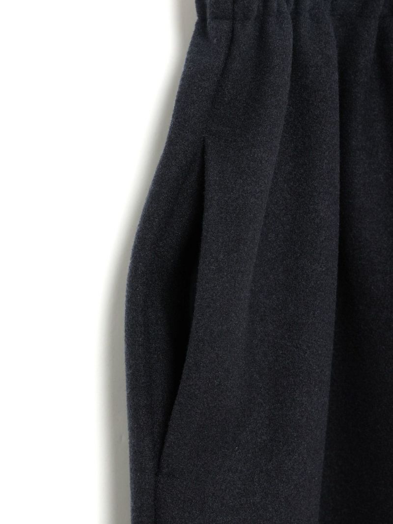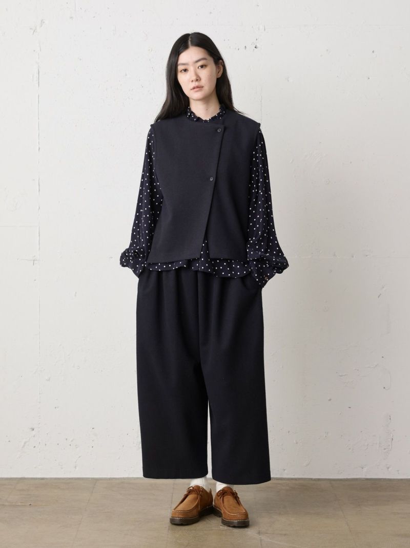 ウールフラノタッチのリサイクルポリエステル素材を使用したイージークロップドパンツが再入荷しました。裏なしでもチクチクしなく吸湿発熱の機能もある素材なので寒い季節に最適で温かさを体感していただけます。ウエストはリラックス感のあるゴム使用。クロップド丈なのでブーツ合わせもオススメ。見た目にも温かさを感じとっていただける1枚です。同シリーズのアイテムとセットアップでの着用もおすすめです。同シリーズ 4-760014/ショートパンツや4-770024/ノーカラージャケット、4-710017/ベストも展開。