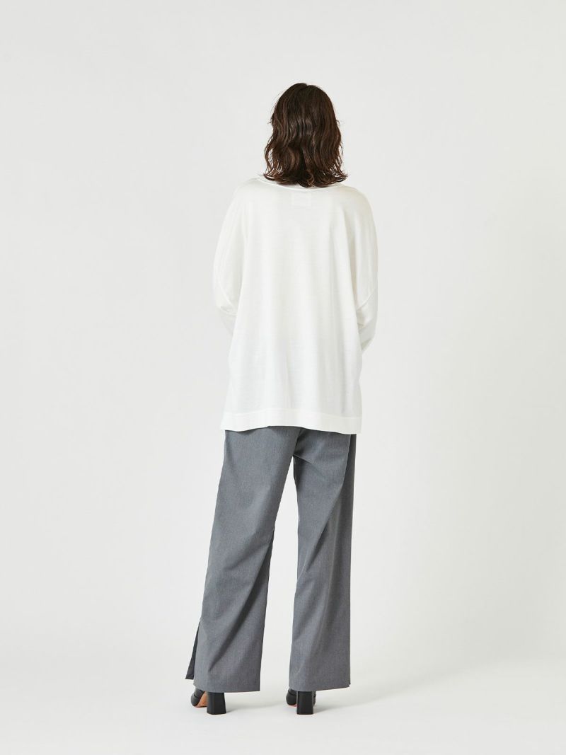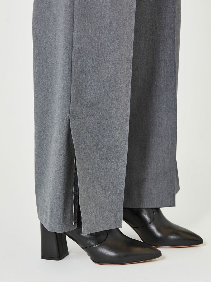 ピンタックのセンタープリーツパンツ。ストーレートのかっこいいシルエットで足長効果のある1枚。カジュアル感もある裾スリットを施したジップ付き。動きやすいストレッチのきいたパンツは、リラックス感のあるウエストのデザインに仕上げたことでよりらくに穿きやすさ抜群です。