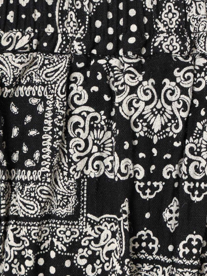 シルエットにこだわったシンプルなスカート、タックボリュームコクーンスカートです。ブラックのみのワントーンに絞りピンドット柄とバンダナ柄の2柄で展開しました。丸みを帯びたボリュームシルエットがポイント。ミドル丈なので身長を問わず着用可能。トップスインのコーデはもちろん、短丈やコンパクトなトップスとさらっと合わせてもサマになるのでこれからの季節に活躍するアイテム。少し薄手でフォークロア調のインド素材を使用。シワ感を残した洗い仕上げも雰囲気が良く魅力的です。ウエストに通したキナリの紐と紐端に効かせた赤のステッチでカジュアル感と元気な印象を加えブランドらしいポイントに。ウエストはゴム使用なので気軽にコーディネートができる1枚です。同型2-860042(無地)も展開。