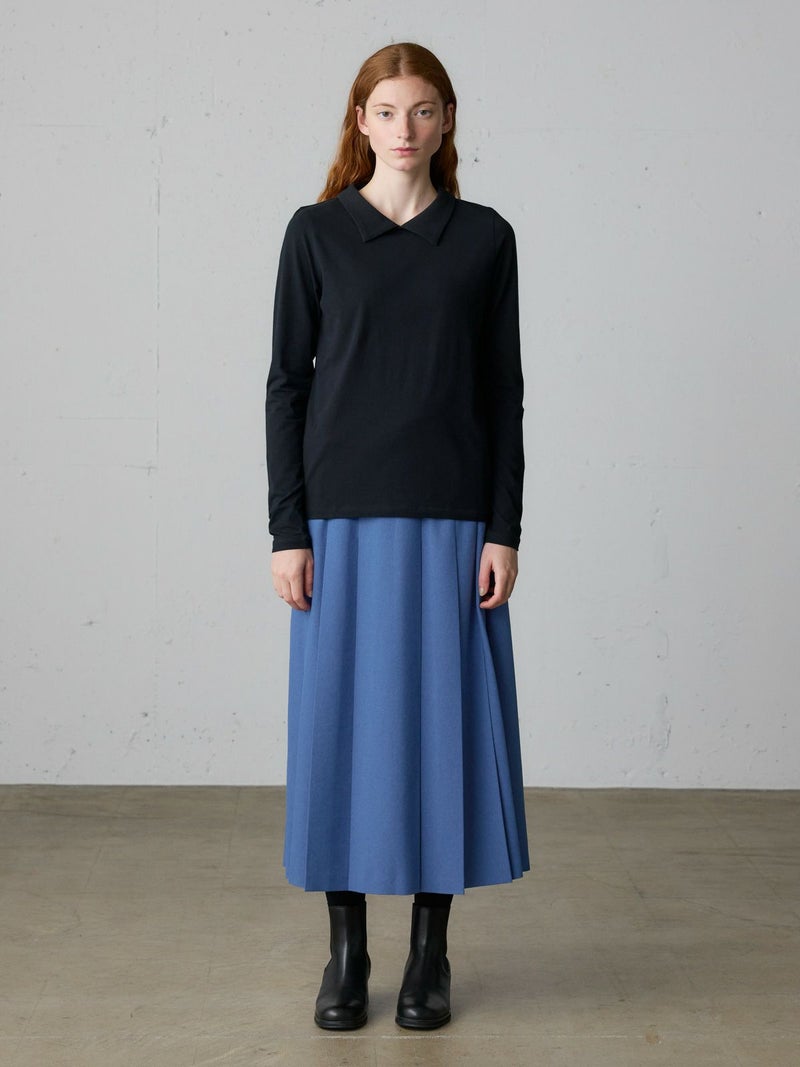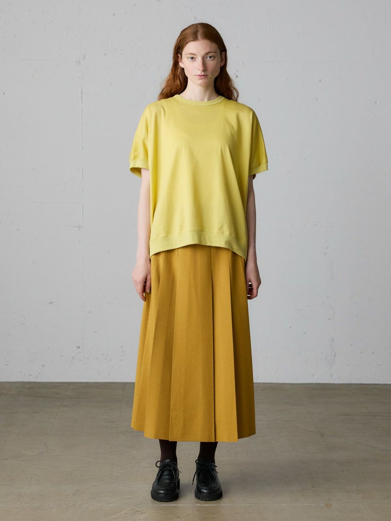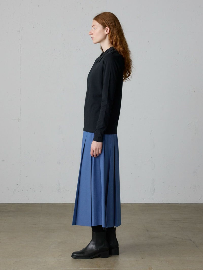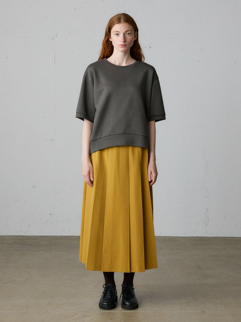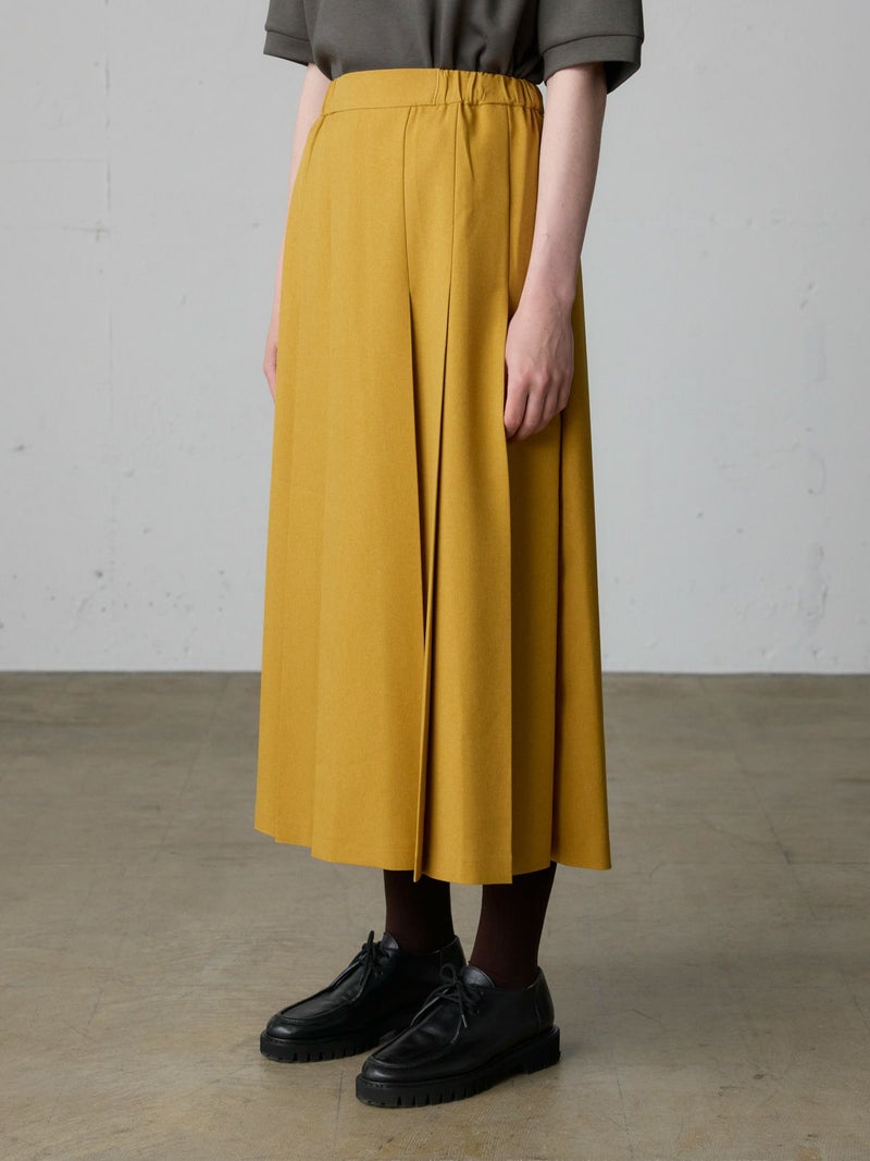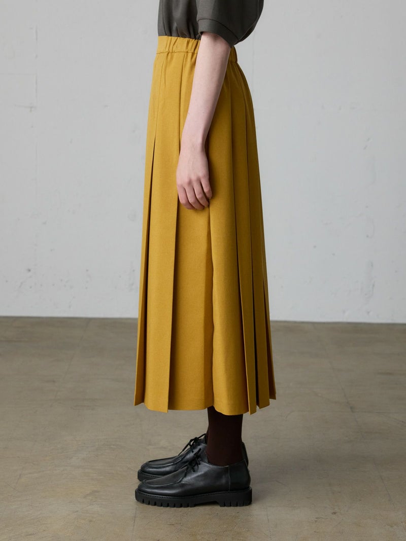 リサイクルポリエステルを使用したタックプリーツスカートです。MidiUmiの実績のあるデザインで今季も再入荷アイテムとなっています。梳毛ライクで落ち感のある生地が特徴。フロント面はフラットなデザインなのでシャツをインにしてもウエスト周りがスッキリとした印象です。サイドからバックにかけてゴム使用なので穿きやすいデザイン仕上げ。大きなプリーツが清楚な雰囲気を表現したトラッド感のあるスカートで、落ち着きのある大人の魅力を演出した1枚です。