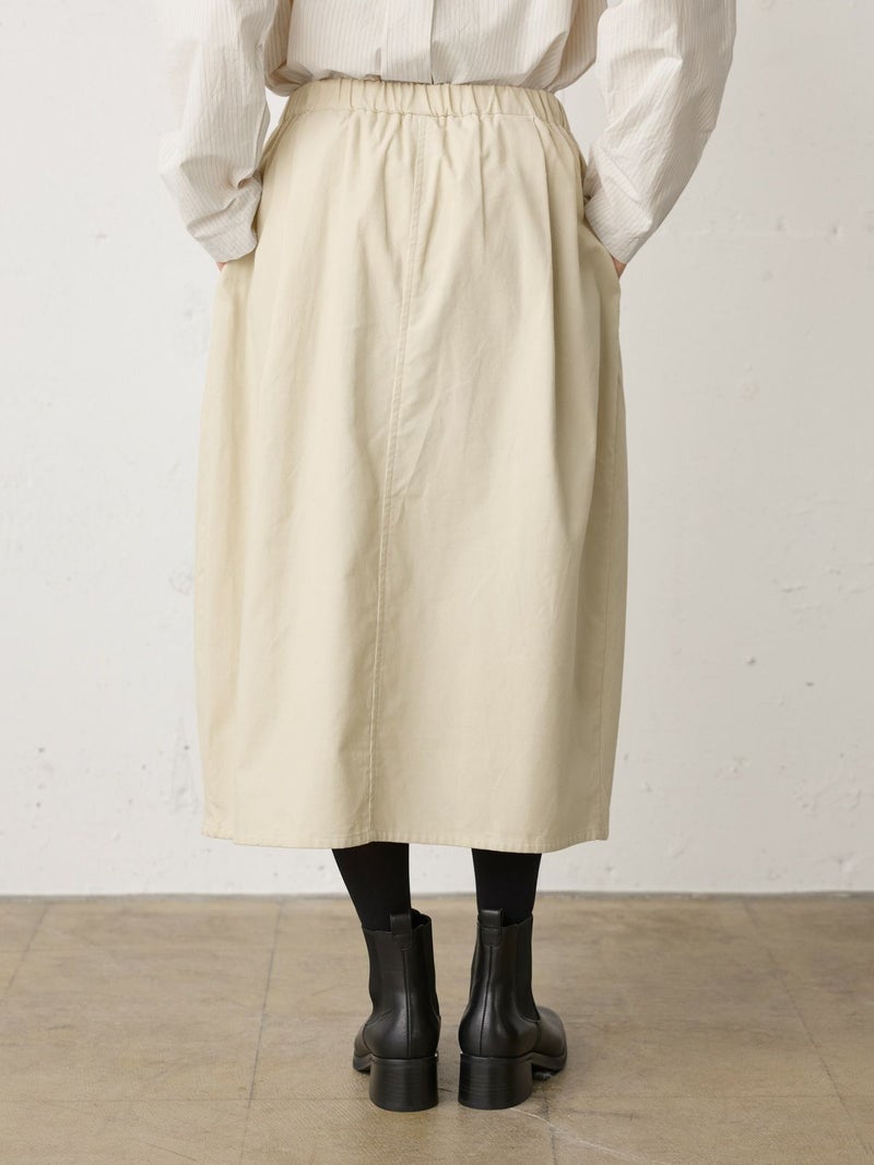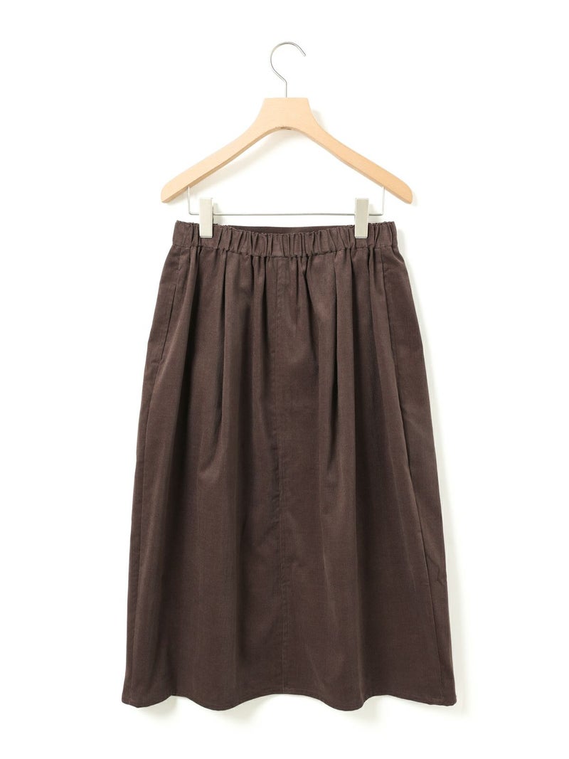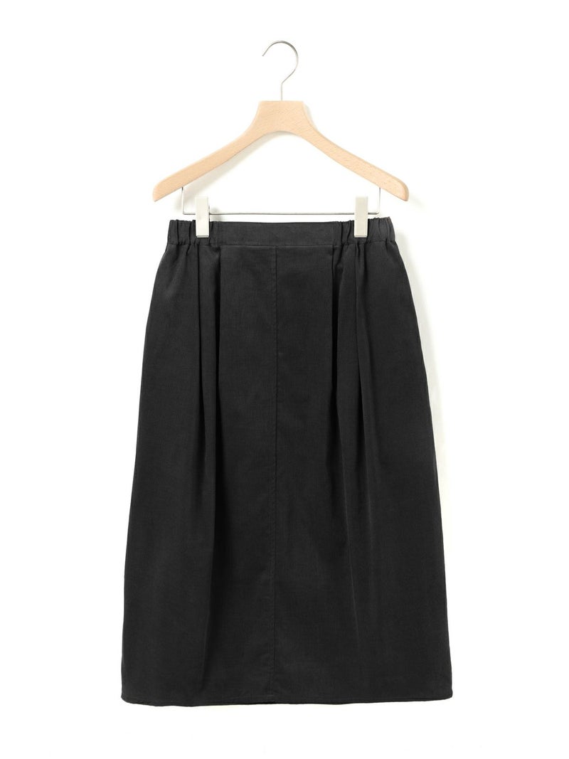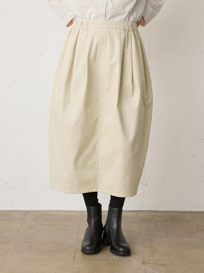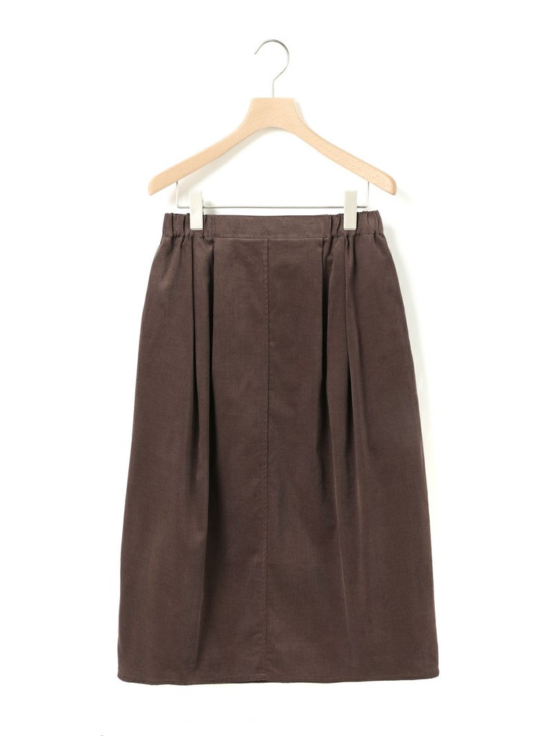 上品な細コールのコーデュロイ素材を使用したコーデュロイコクーンスカートです。タックの入ったコクーン型スカートで少し丸みのある立体感のあるシルエットと長すぎない着丈が特徴。微光沢で軽さもありカジュアルすぎない印象のボトムアイテムです。ウエストはリラックス感のあるゴム使用。膝下丈で穿きやすく足元のオシャレも楽しんでいただける1枚です。秋冬定番生地で温かみがあり長く愛用していただけます。
