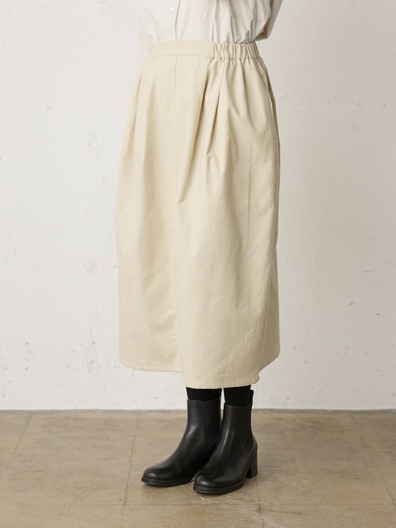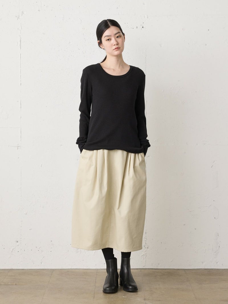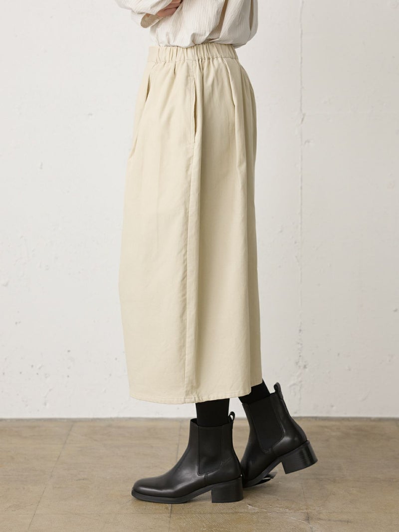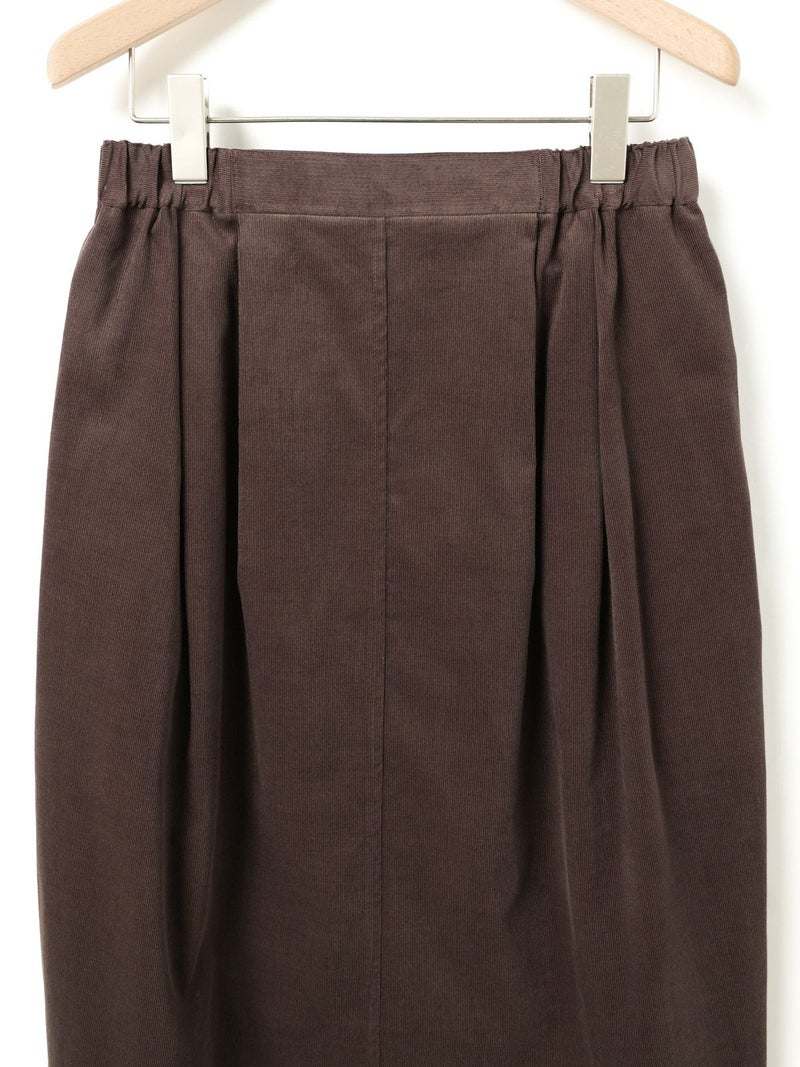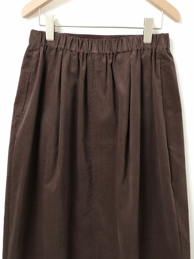上品な細コールのコーデュロイ素材を使用したコーデュロイコクーンスカートです。タックの入ったコクーン型スカートで少し丸みのある立体感のあるシルエットと長すぎない着丈が特徴。微光沢で軽さもありカジュアルすぎない印象のボトムアイテムです。ウエストはリラックス感のあるゴム使用。膝下丈で穿きやすく足元のオシャレも楽しんでいただける1枚です。秋冬定番生地で温かみがあり長く愛用していただけます。