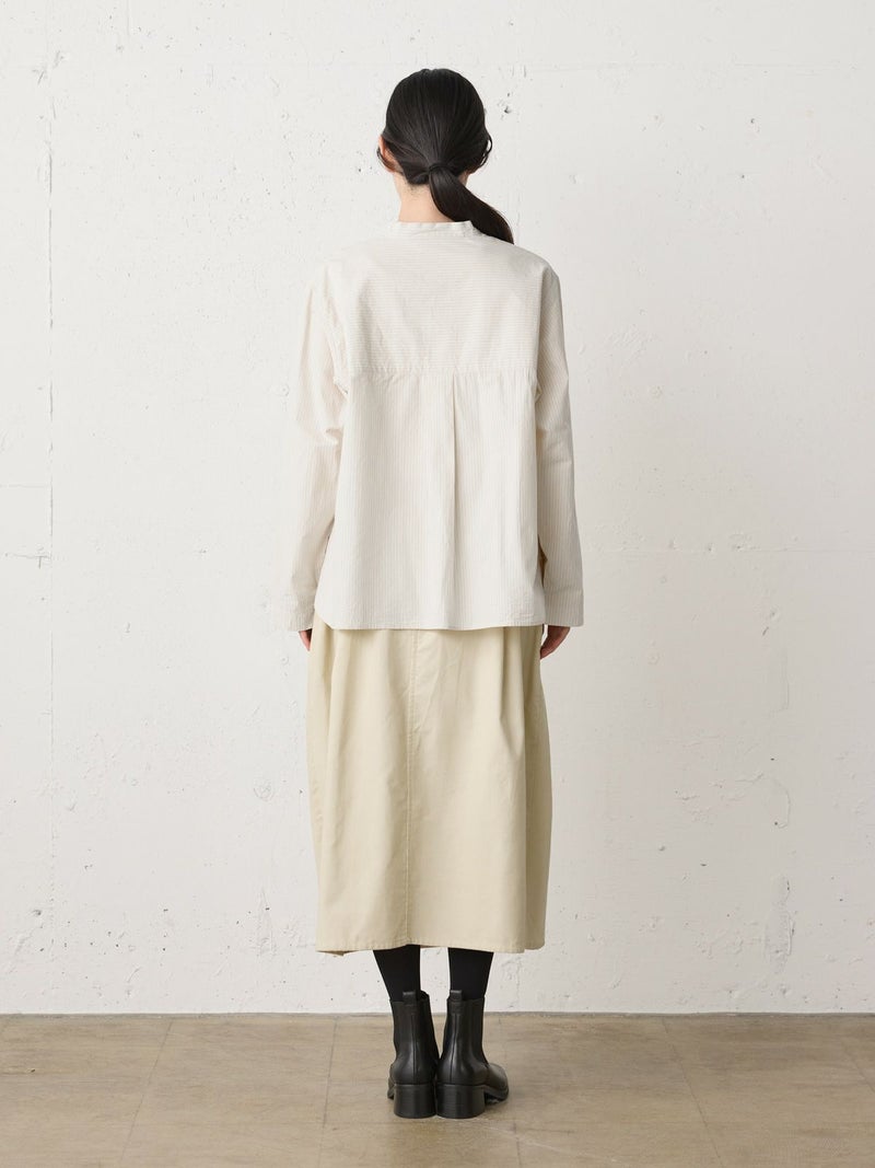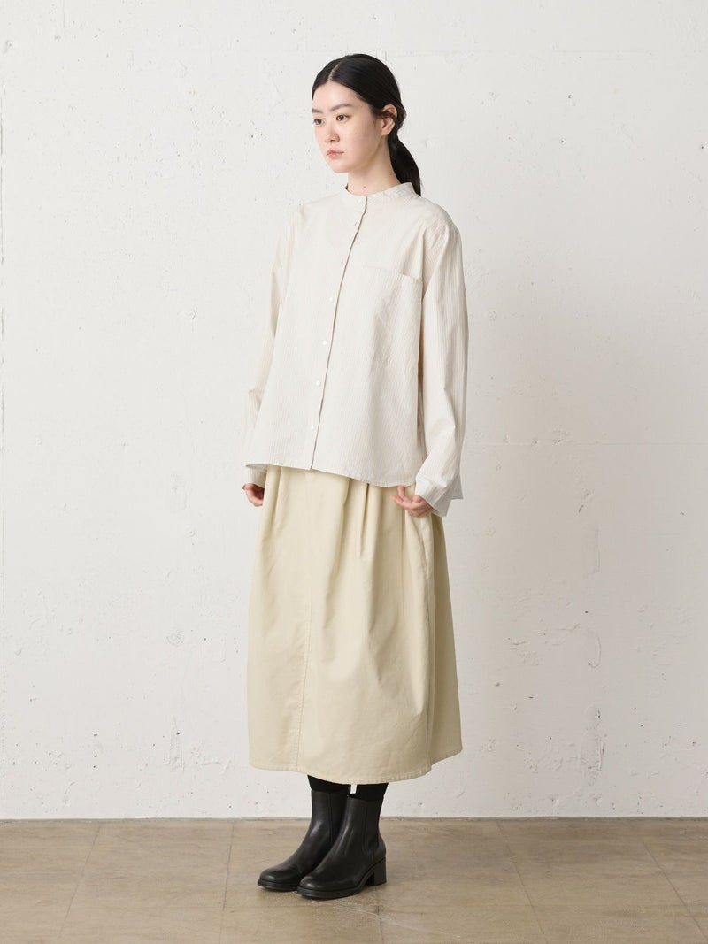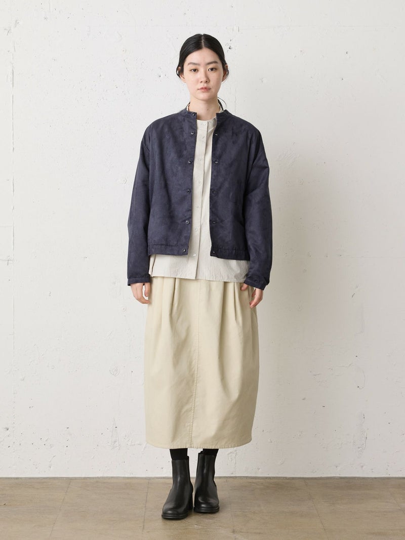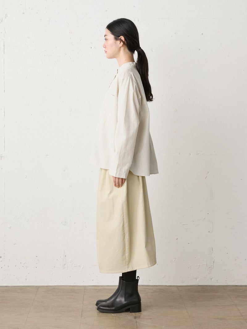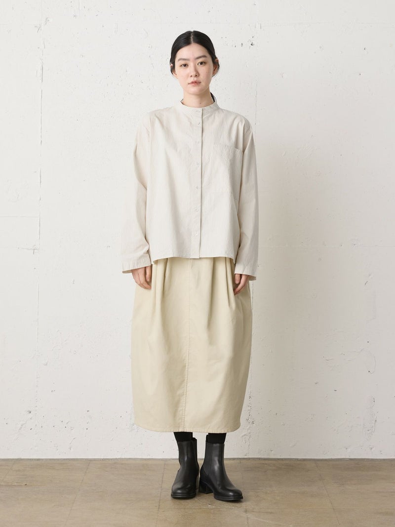 上品な細コールのコーデュロイ素材を使用したコーデュロイコクーンスカートです。タックの入ったコクーン型スカートで少し丸みのある立体感のあるシルエットと長すぎない着丈が特徴。微光沢で軽さもありカジュアルすぎない印象のボトムアイテムです。ウエストはリラックス感のあるゴム使用。膝下丈で穿きやすく足元のオシャレも楽しんでいただける1枚です。秋冬定番生地で温かみがあり長く愛用していただけます。