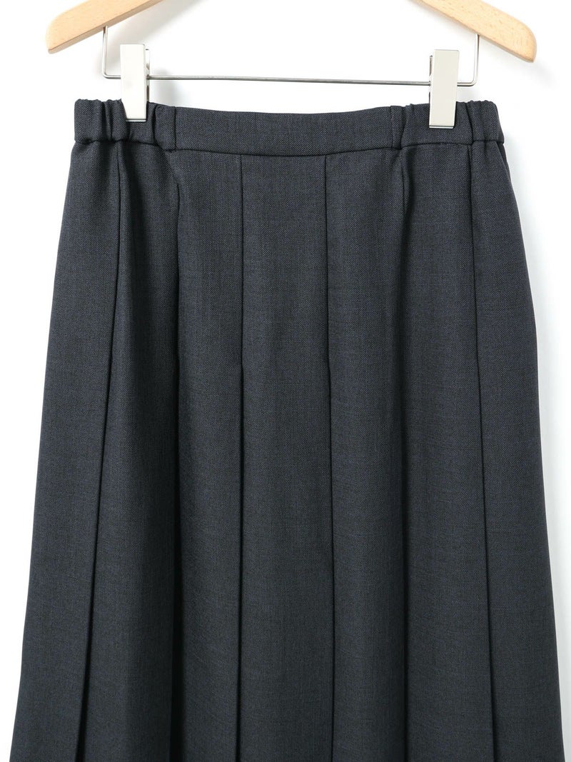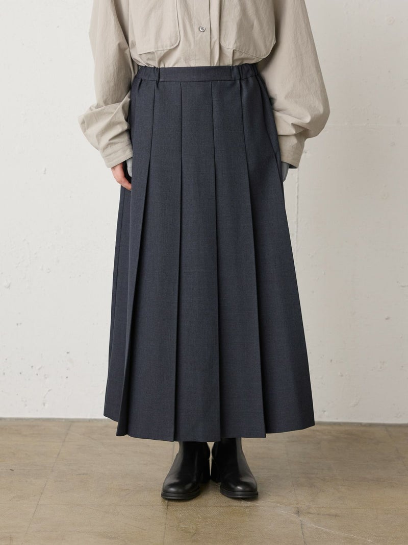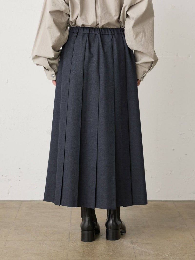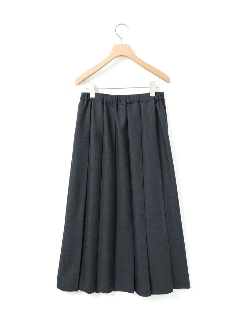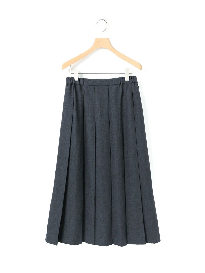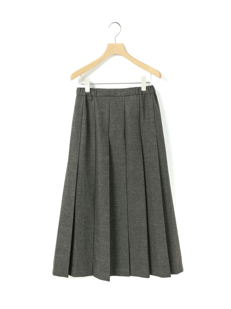 ウールツイード見えするポリエステル地を使用したプリーツスカートです。程よい厚みがあり、非常に落ち感のきれいな素材が特徴的。プリーツ幅太目の片ひだプリーツスカートを表現。長めの丈でウエストはリラックス感のあるゴム使用。ニットアイテムとも相性が良く、清楚で落着きのある女性らしい着こなしを演出します。MidiUmiで長く人気のお勧めの1枚です。