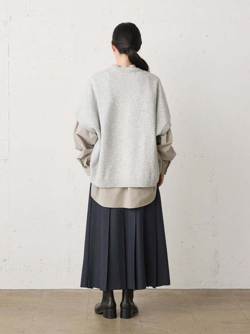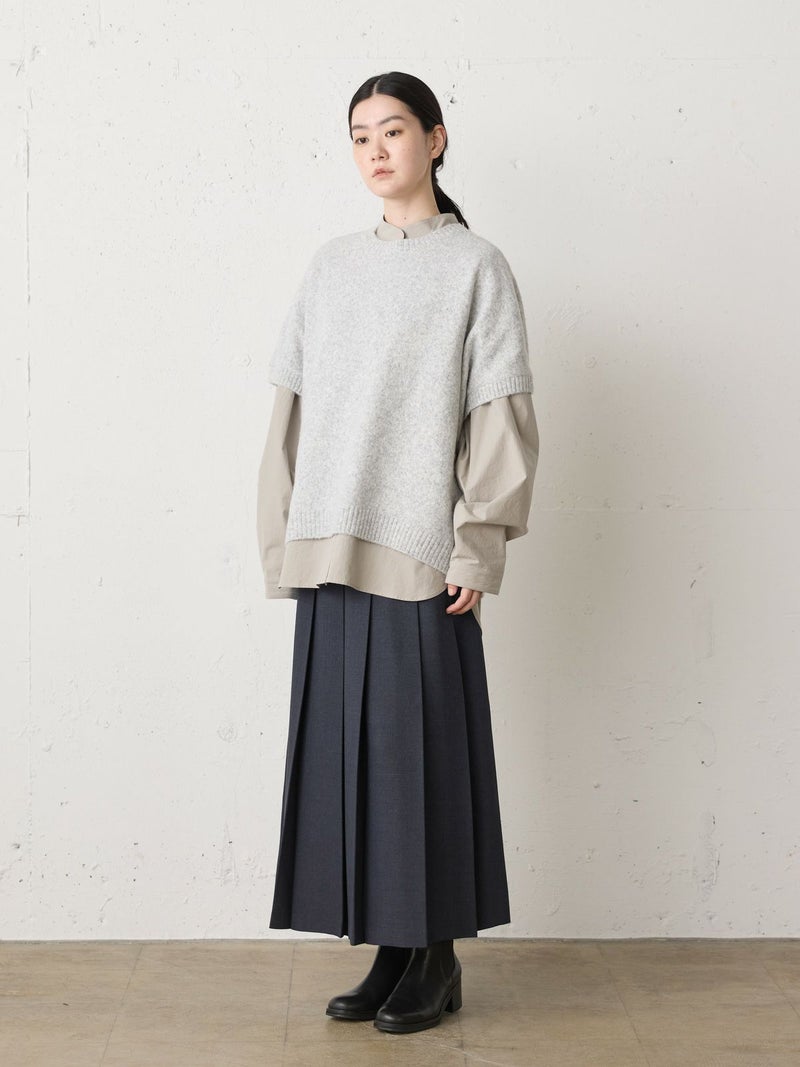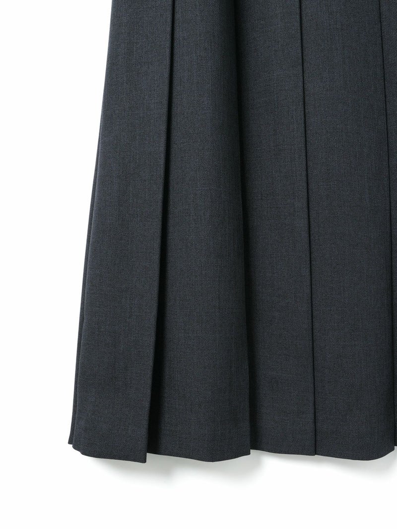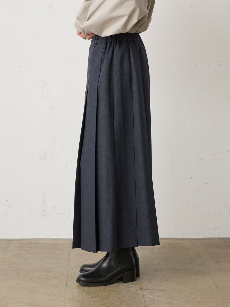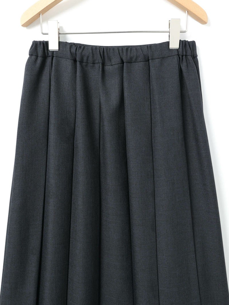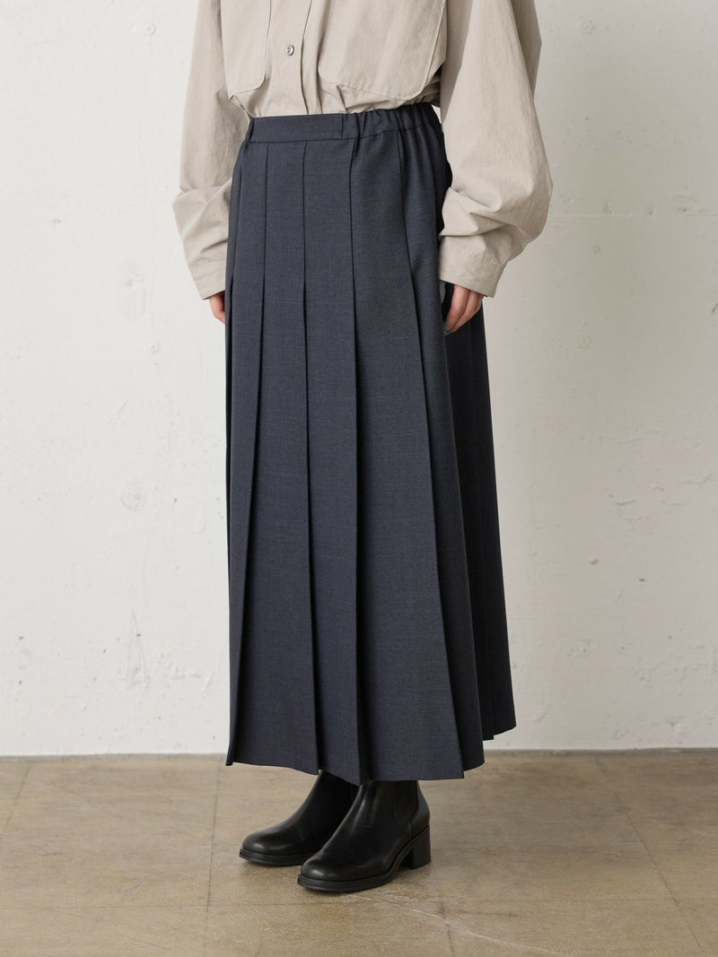 ウールツイード見えするポリエステル地を使用したプリーツスカートです。程よい厚みがあり、非常に落ち感のきれいな素材が特徴的。プリーツ幅太目の片ひだプリーツスカートを表現。長めの丈でウエストはリラックス感のあるゴム使用。ニットアイテムとも相性が良く、清楚で落着きのある女性らしい着こなしを演出します。MidiUmiで長く人気のお勧めの1枚です。