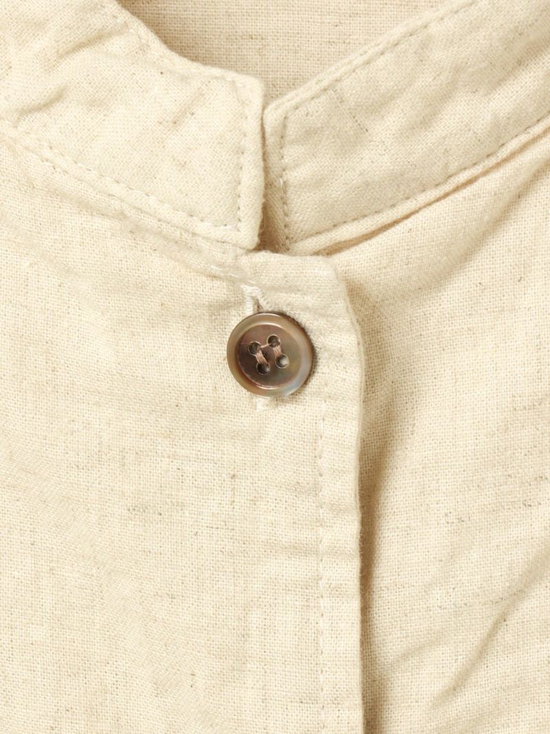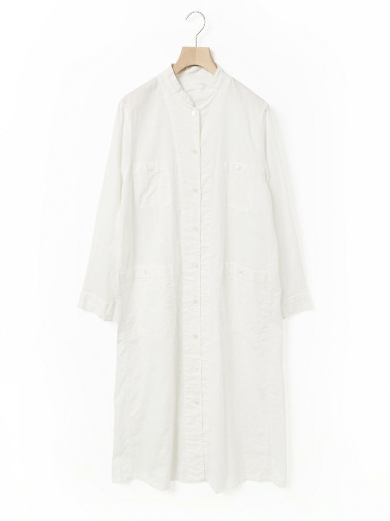 複数のポケットやスタンドの襟元など、ワークテイストでコートライクに羽織れるワンピースです。軽くてシャリ感のある綿麻素材が涼し気な雰囲気を演出します。洗い&タンブラーでクッタリとさせ、シワ感を残した風合いに仕上げているので気軽に着脱可能。ポケット口が垂れてだらしなく見えないように施された釦はデザインポイントにも。軽く見えるよう袖口はカフス仕様のシャツディティールに。第2~第3釦まで外して着用しても襟元が自然に折り返るようなパターン。様々な着こなしが楽しめるアイテムです。