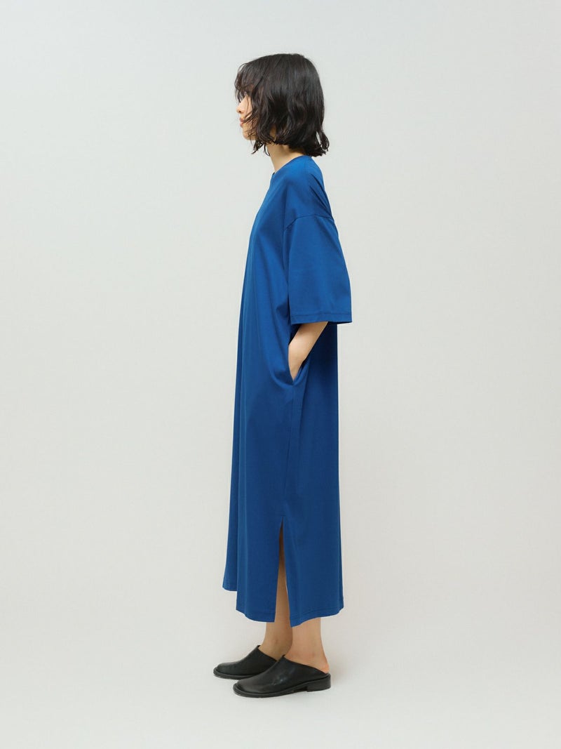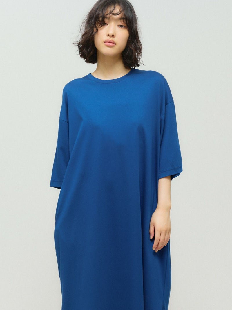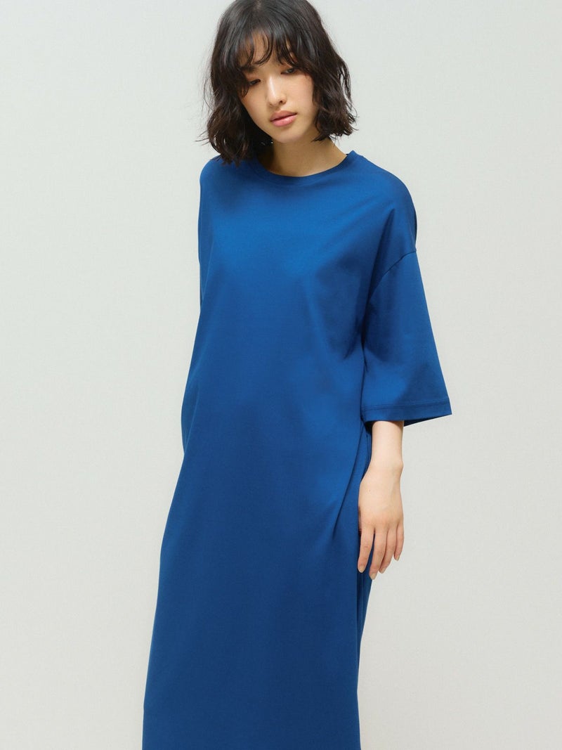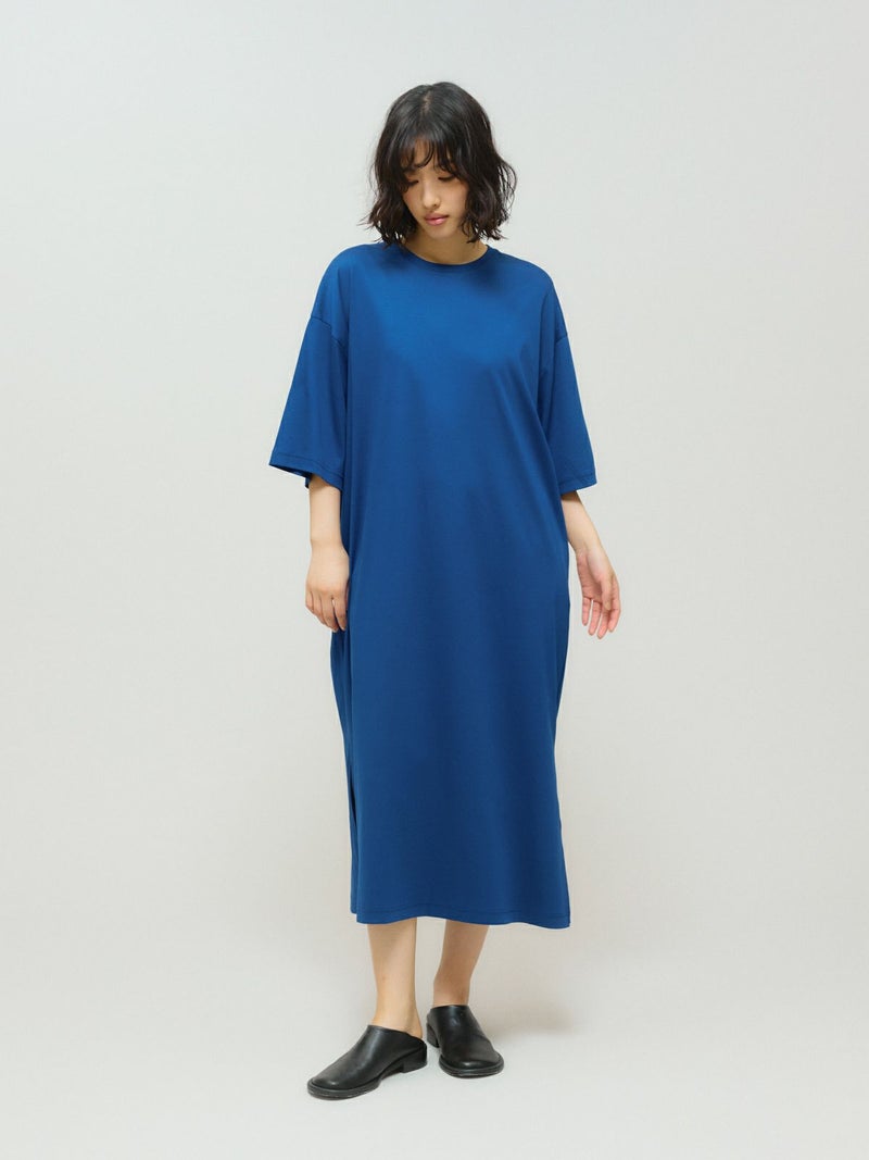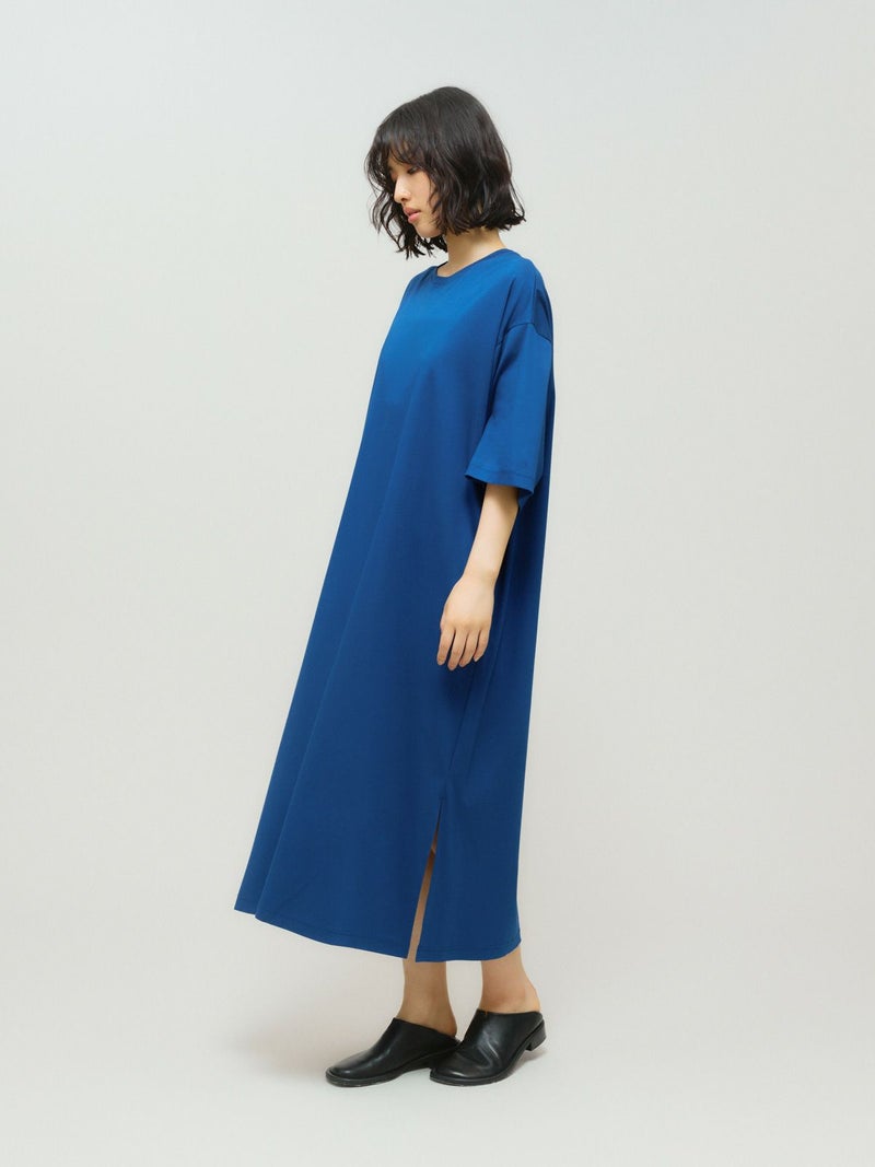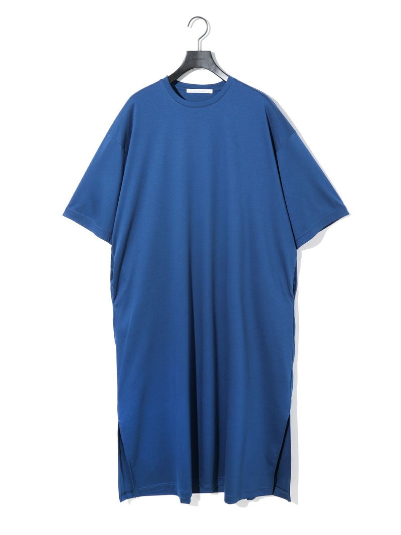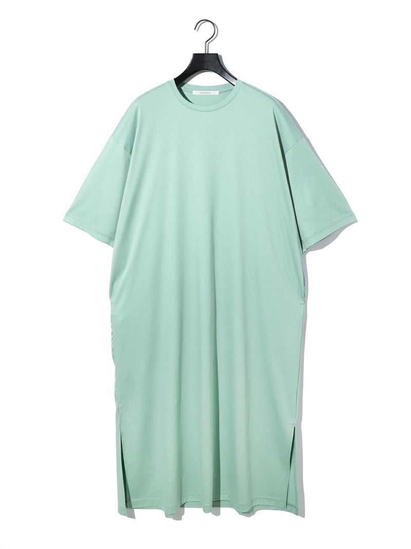 シンプルなデザインに仕上げたリラックススリットワンピースです。スムースジャージのカットソー素材で光沢と落ち感のある1枚。ボトムも合わせやすいのでラフに重ね着を楽しんでいただけます。長めの半袖丈、サイドスリットの入った裾、オーバーサイズのTシャツのようなベーシックなワンピースです。