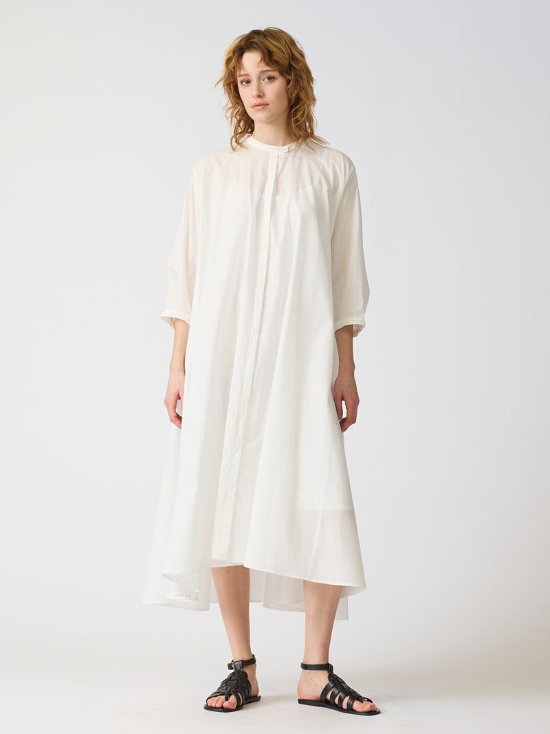 mizuiro indの定番ワンピースでもあるスタンドカラーフレアロングワンピースです。60ローンのコットン生地を使用した柔らかな1枚。透け感のある薄手の生地感は春を感じさせてくれる爽やかな雰囲気を演出しています。気温の変化によって袖をロールアップしてみたり、パンツやレギンスでレイヤードを楽しんでいただくのもおすすめです。裾は前後差を付け足元を軽くデザインしています。シンプルな中に魅力の詰まったワンピースとなっています。豊富な色展開のワンピースなのでこの春、お好みのカラーを探してみてはいかがですか。