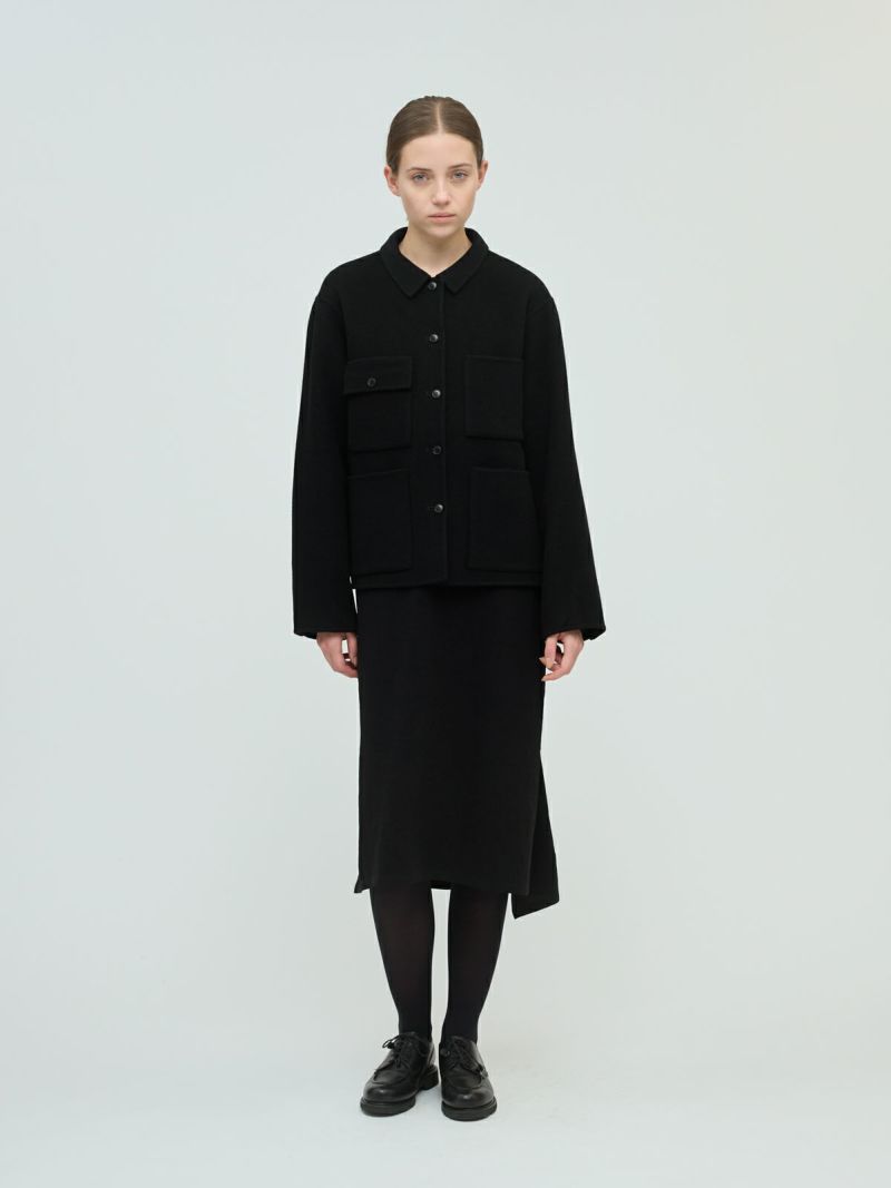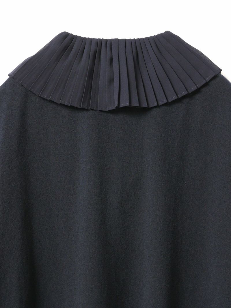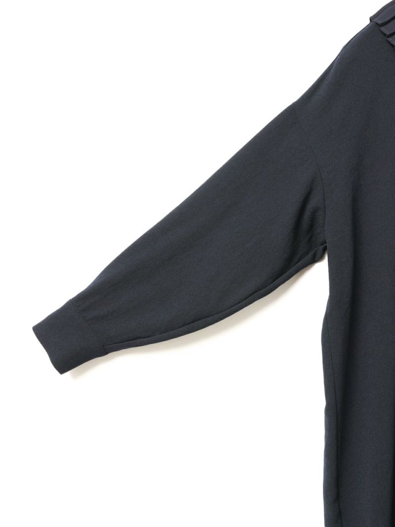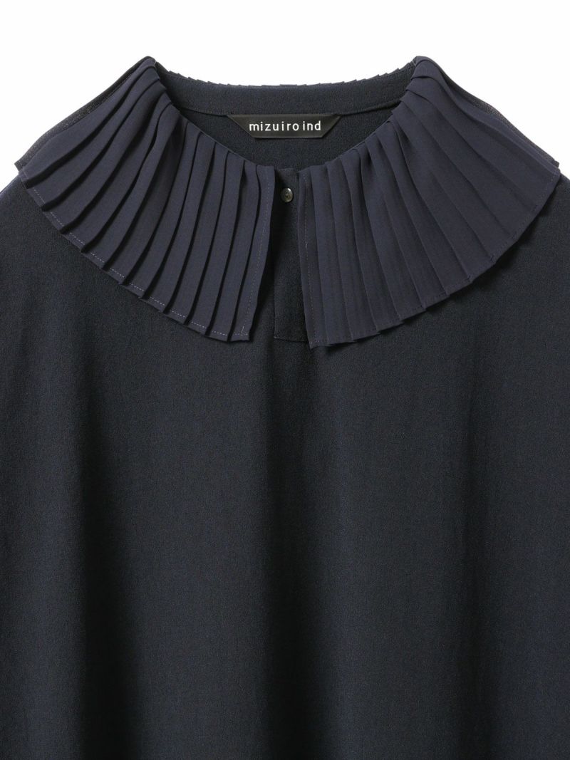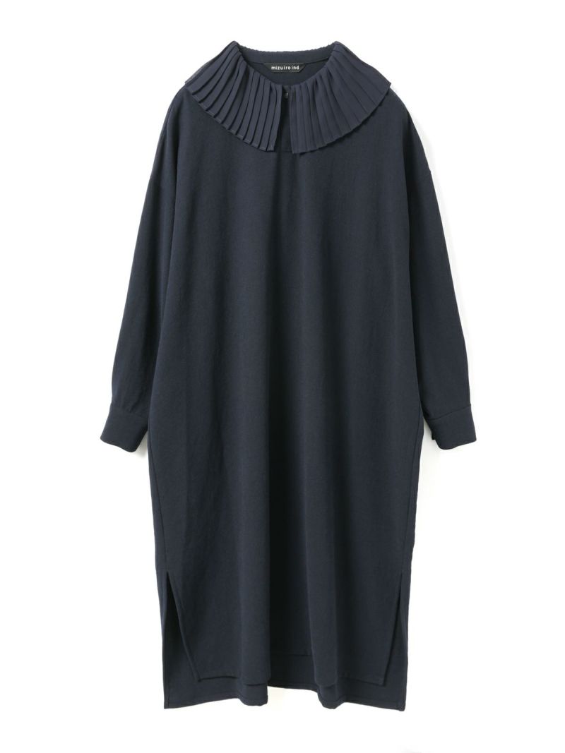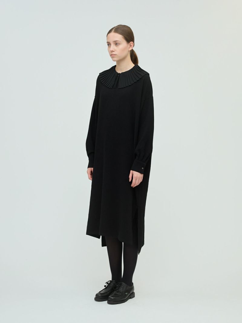 プリーツカラーの襟元が印象的なプリーツカラーワンピースです。モードな着こなしもエレガントな雰囲気も持ち合わせた上品な1枚です。襟元は隠れボタンのポロシャツタイプで着脱のしやすいデザイン。若干の前後差が付いておりサイドスリットが入っています。すっきりとしたワントーンのシックなデザインなので、オケージョン対応にもお勧め。プリーツカラーを出して重ね着をすると華やかな印象になり素敵です。同シリーズ3-230085/プリーツカラーシャツプルオーバーも展開。