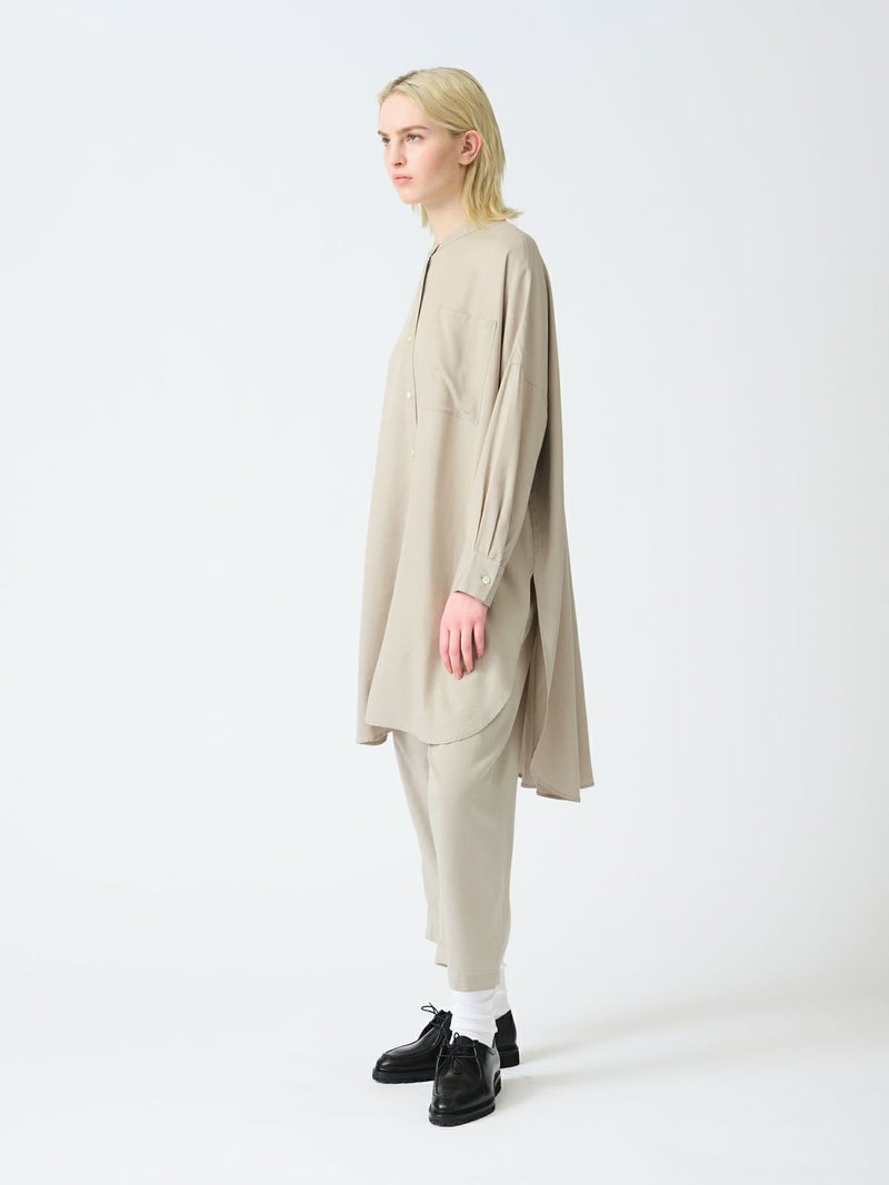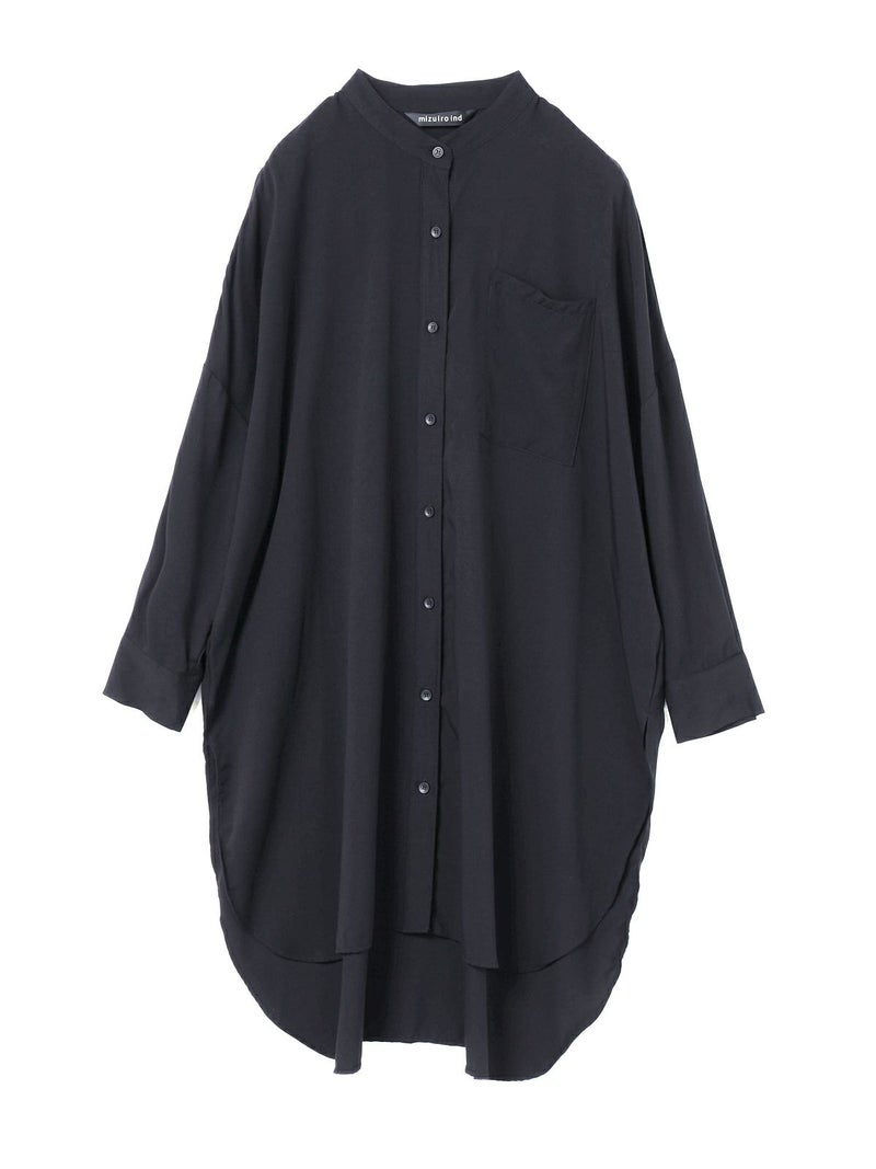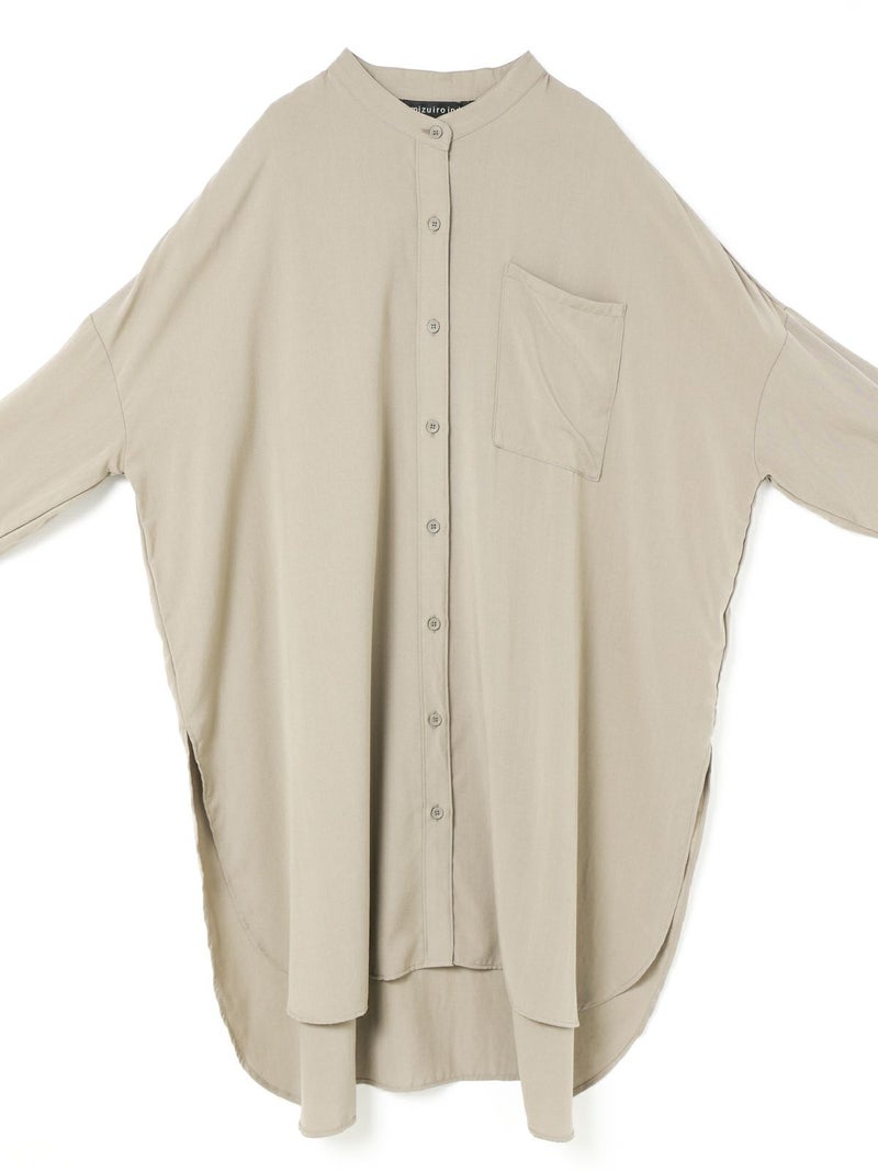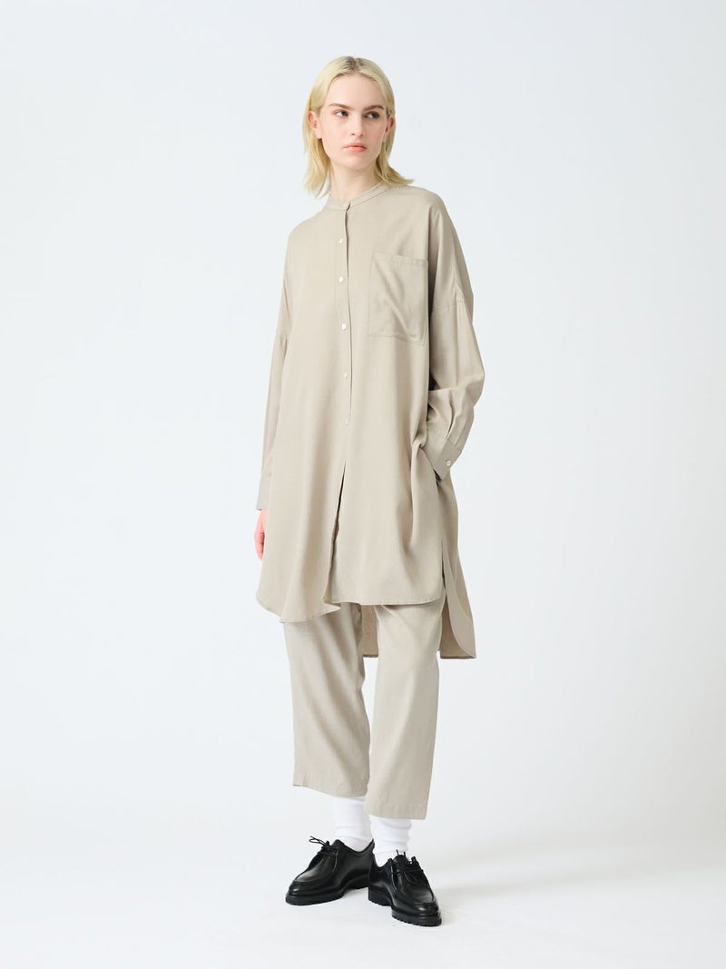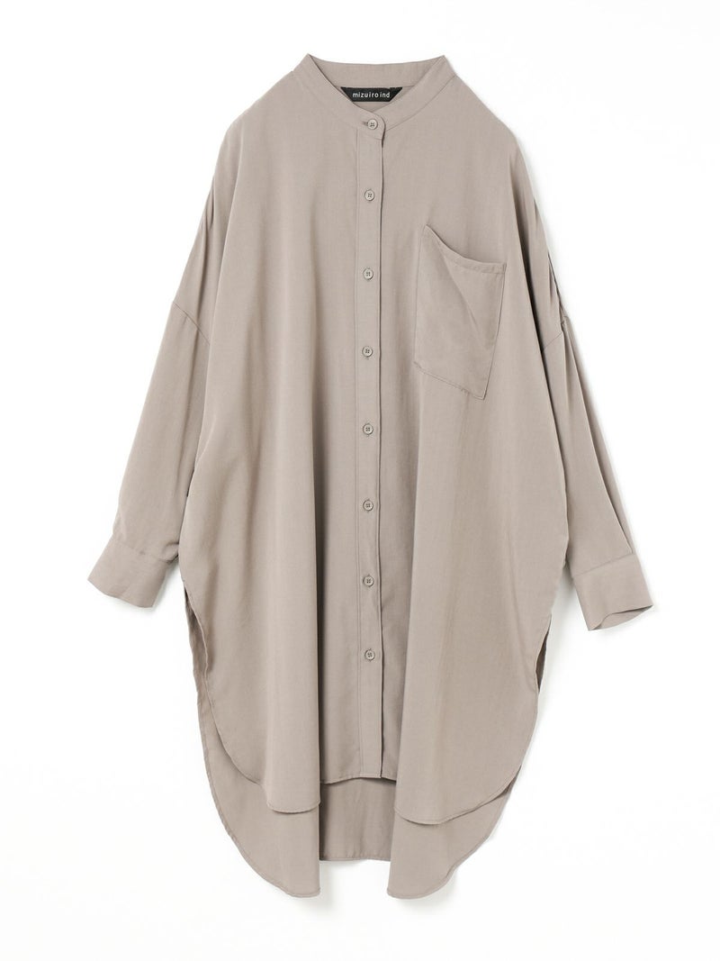 mizuiro indのロングセラーアイテムでもあるバンドカラーロングシャツです。今年の春もお勧めのアイテムとして再入荷いたしました。シワになりにくく手触りのよい風合いと上品な落ち感が特徴のTRツイルを使用。サラッとした肌触りの良い生地感を体感でき、シックな大人の雰囲気を演出します。サイドスリットが大きく入っており動きのあるデザイン。フロントボタンを外して羽織で着こなしても素敵です。相性のよい1-269062(T/Rタックイージーパンツ)とセットアップでコーディネートしてモード感溢れるかっこ良さを表現できる1枚です。