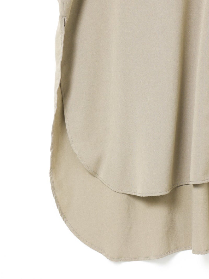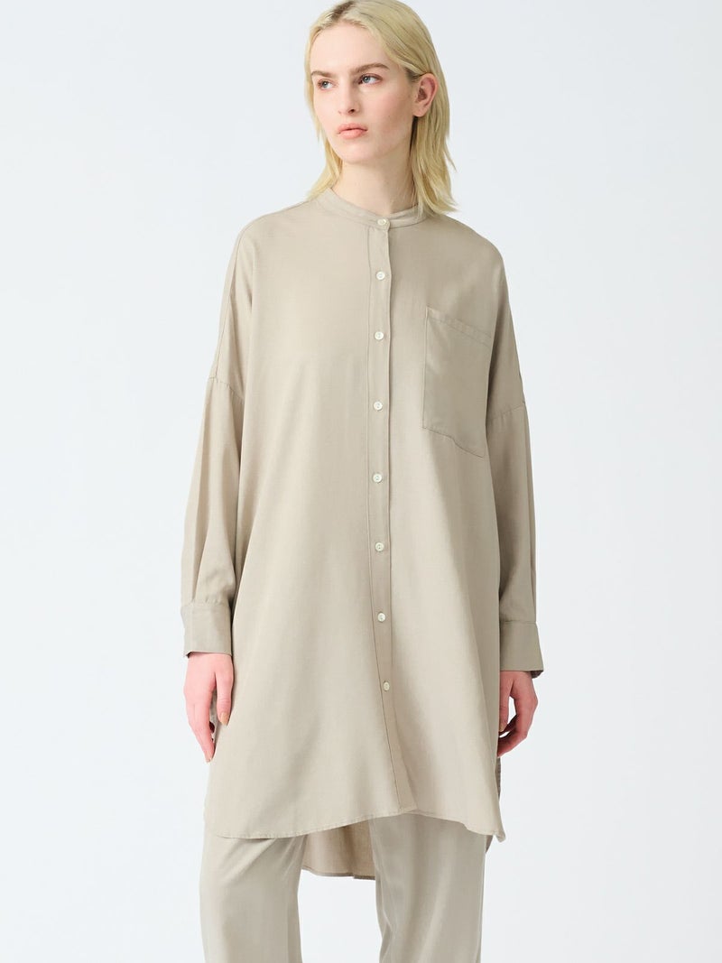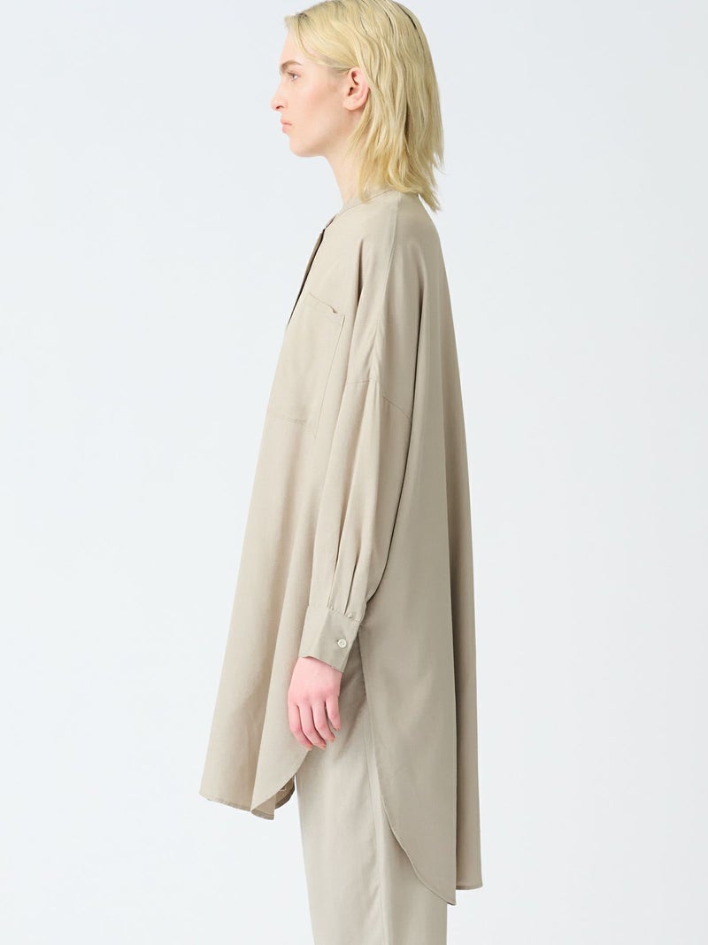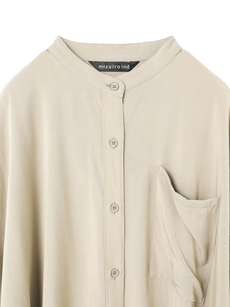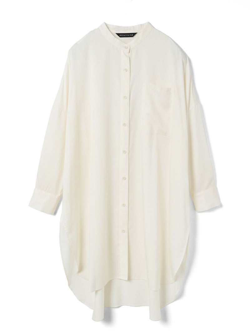 mizuiro indのロングセラーアイテムでもあるバンドカラーロングシャツです。今年の春もお勧めのアイテムとして再入荷いたしました。シワになりにくく手触りのよい風合いと上品な落ち感が特徴のTRツイルを使用。サラッとした肌触りの良い生地感を体感でき、シックな大人の雰囲気を演出します。サイドスリットが大きく入っており動きのあるデザイン。フロントボタンを外して羽織で着こなしても素敵です。相性のよい1-269062(T/Rタックイージーパンツ)とセットアップでコーディネートしてモード感溢れるかっこ良さを表現できる1枚です。