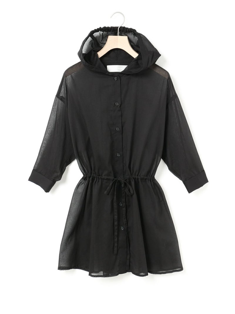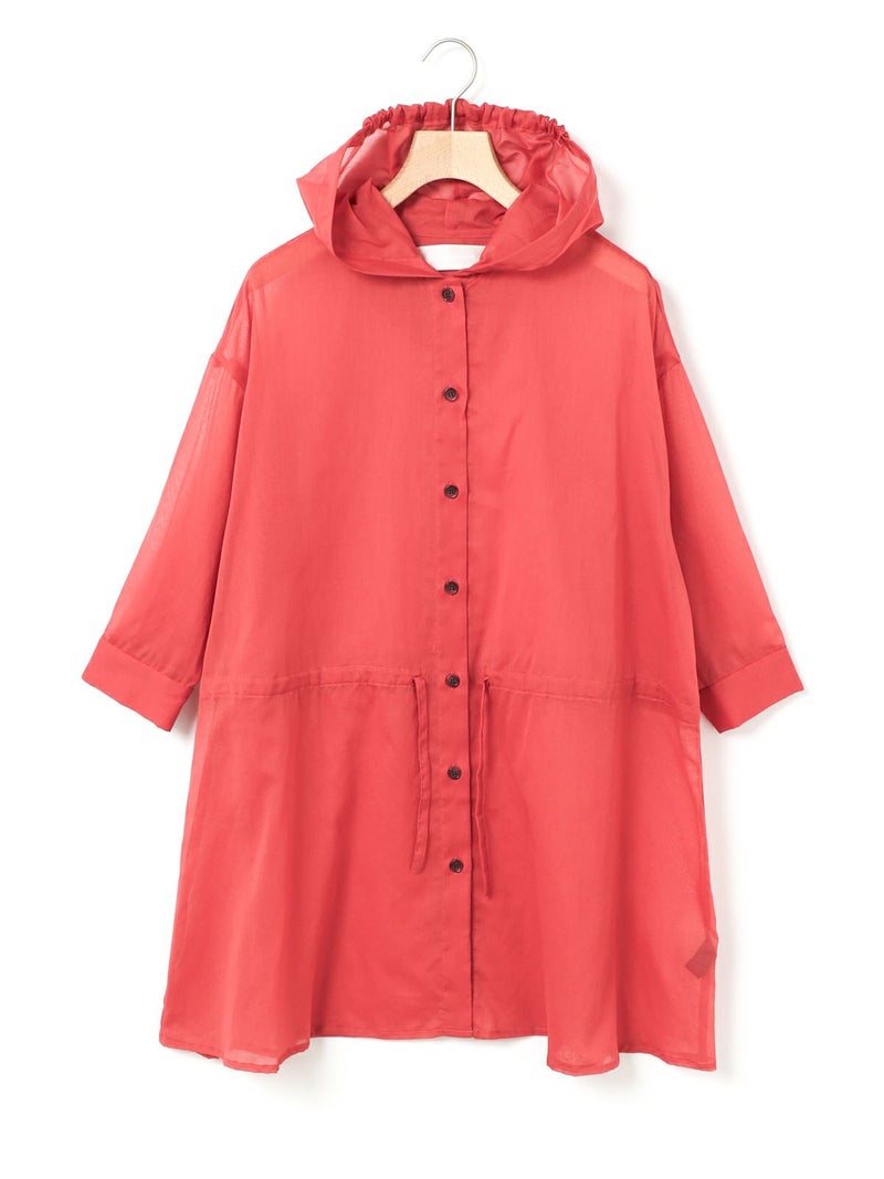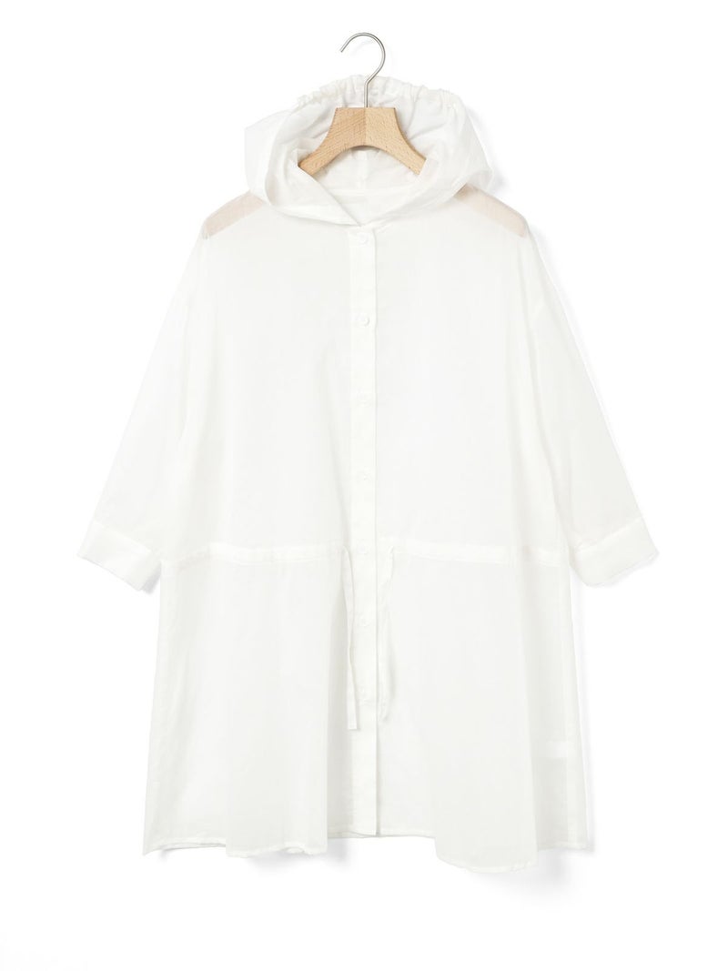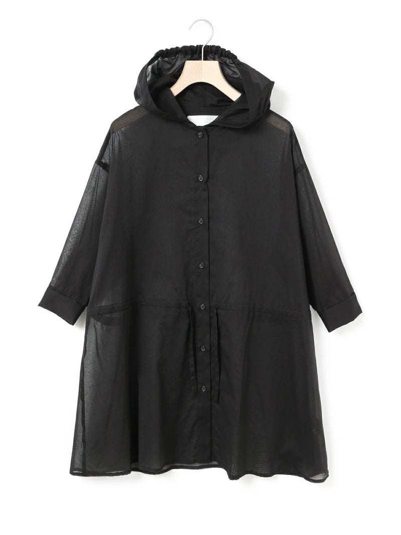 透け感ある80ボイル素材を使用したカジュアル感のあるフードシャツチュニックです。フードはワンポイントになるよう中央にのみギャザーを寄せ、フードを被らない状態でも見た目のポイントとなるようにしています。軽いシアー感ある素材なので羽織としても使いやすく、またシルエット変化を楽しんでいただけるようウエストをブラウジングができるようになっています。お好みでブラウジング分量を調節していただけるのもポイント。七分袖とチュニック丈にすることでもたつかずコーディネートに取り入れやすく仕上げた1枚です。