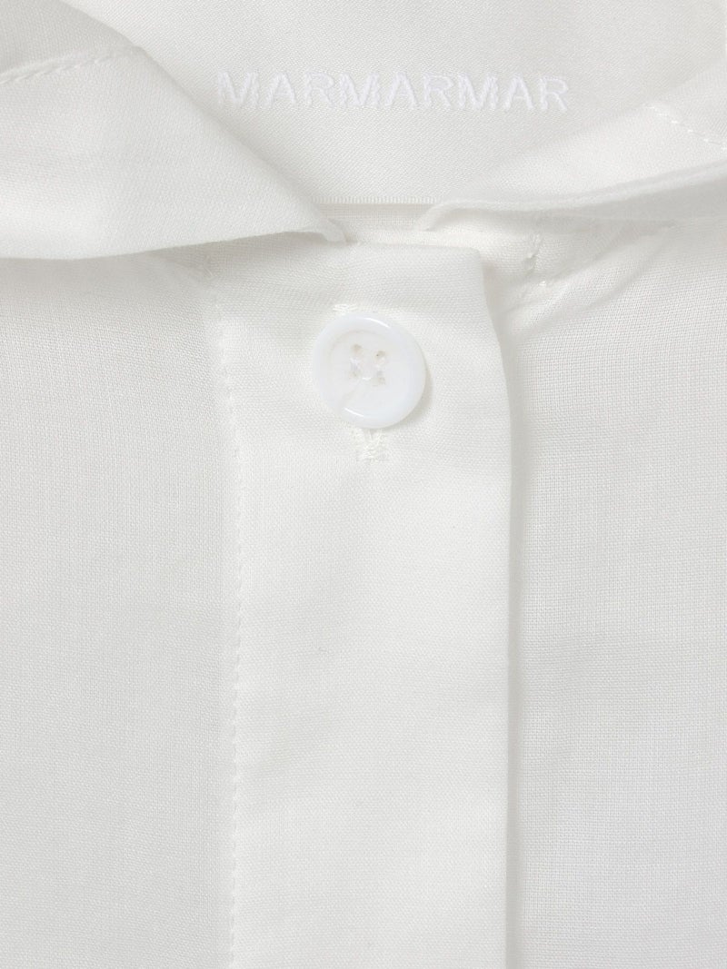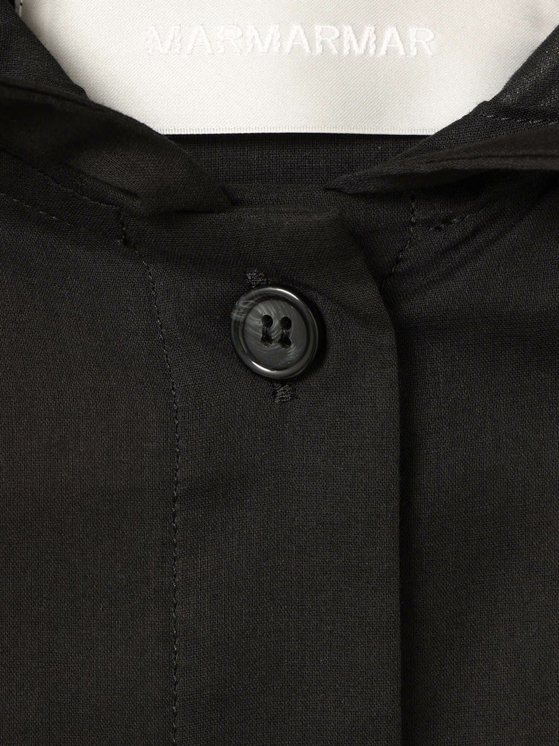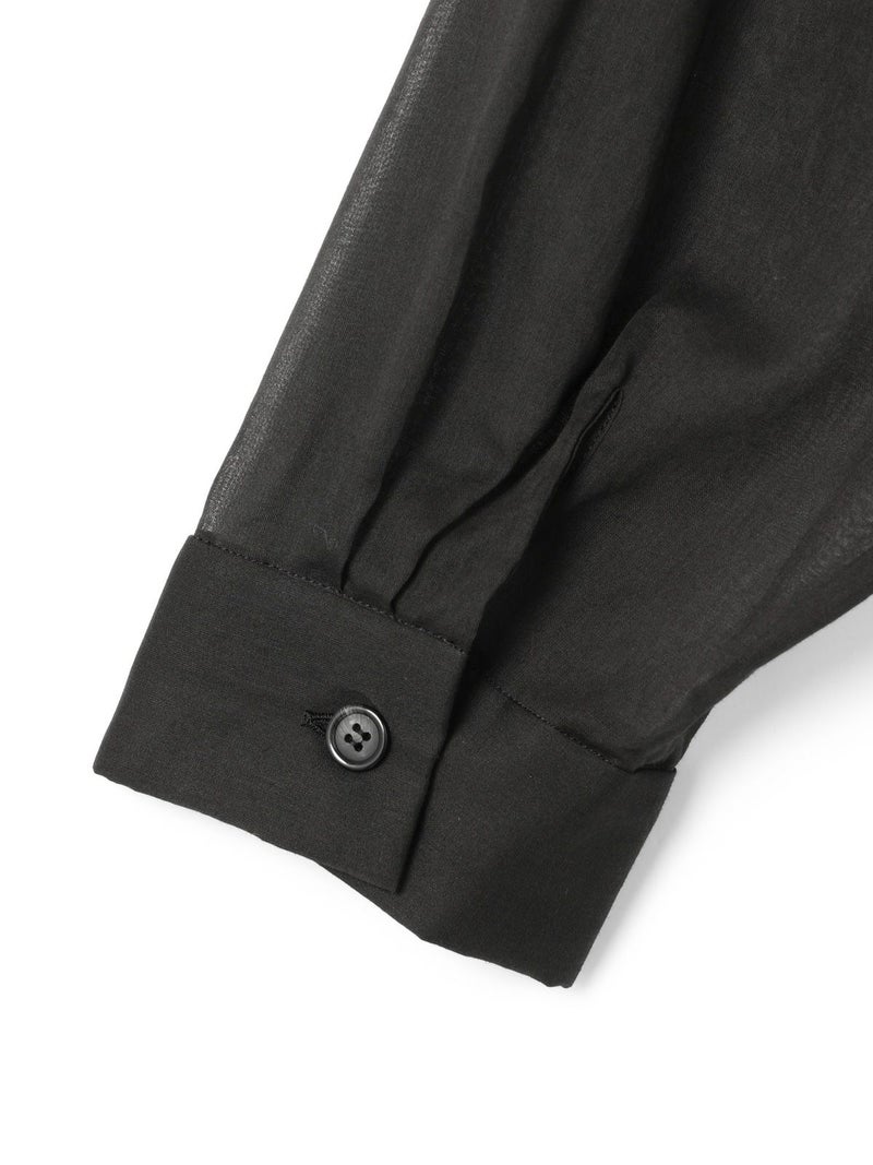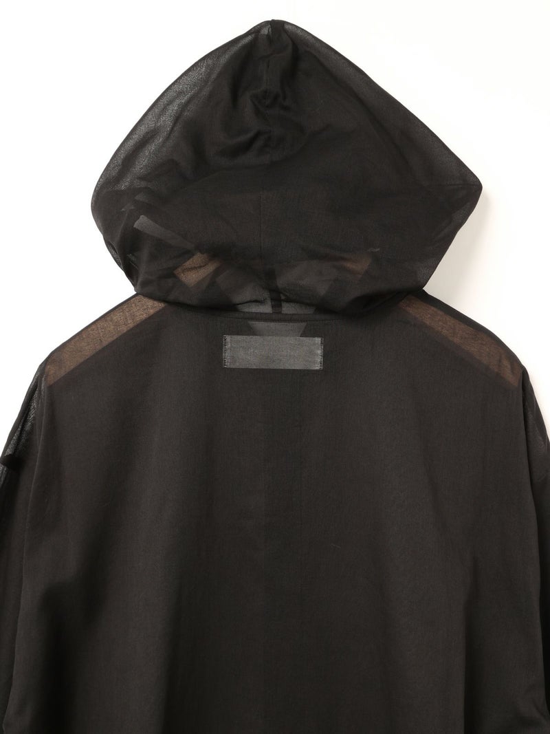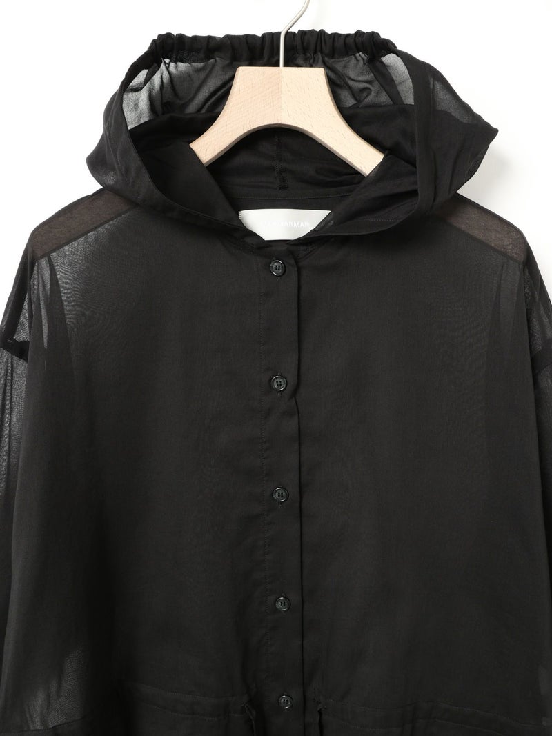透け感ある80ボイル素材を使用したカジュアル感のあるフードシャツチュニックです。フードはワンポイントになるよう中央にのみギャザーを寄せ、フードを被らない状態でも見た目のポイントとなるようにしています。軽いシアー感ある素材なので羽織としても使いやすく、またシルエット変化を楽しんでいただけるようウエストをブラウジングができるようになっています。お好みでブラウジング分量を調節していただけるのもポイント。七分袖とチュニック丈にすることでもたつかずコーディネートに取り入れやすく仕上げた1枚です。