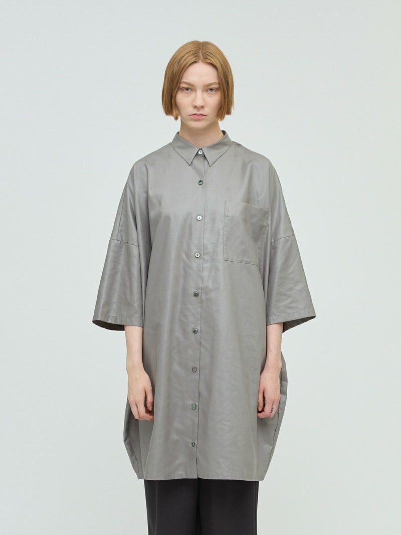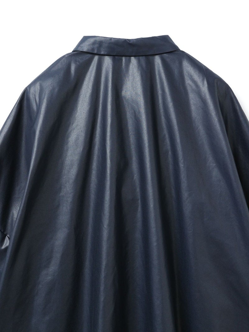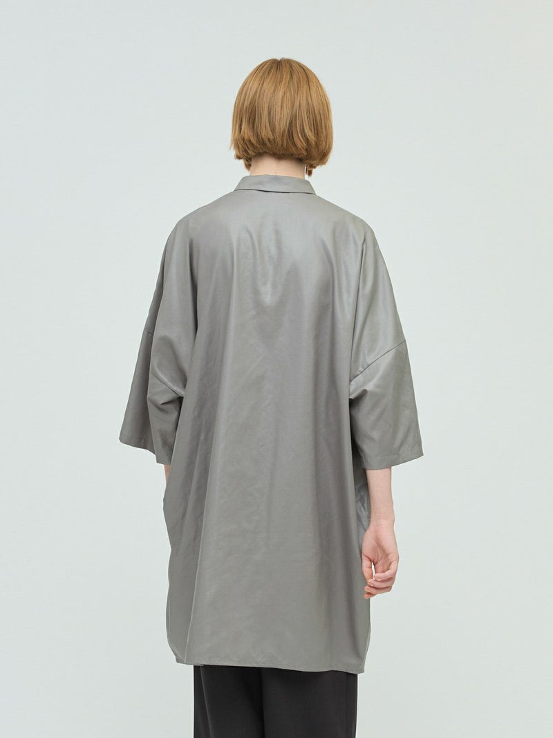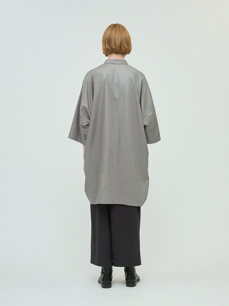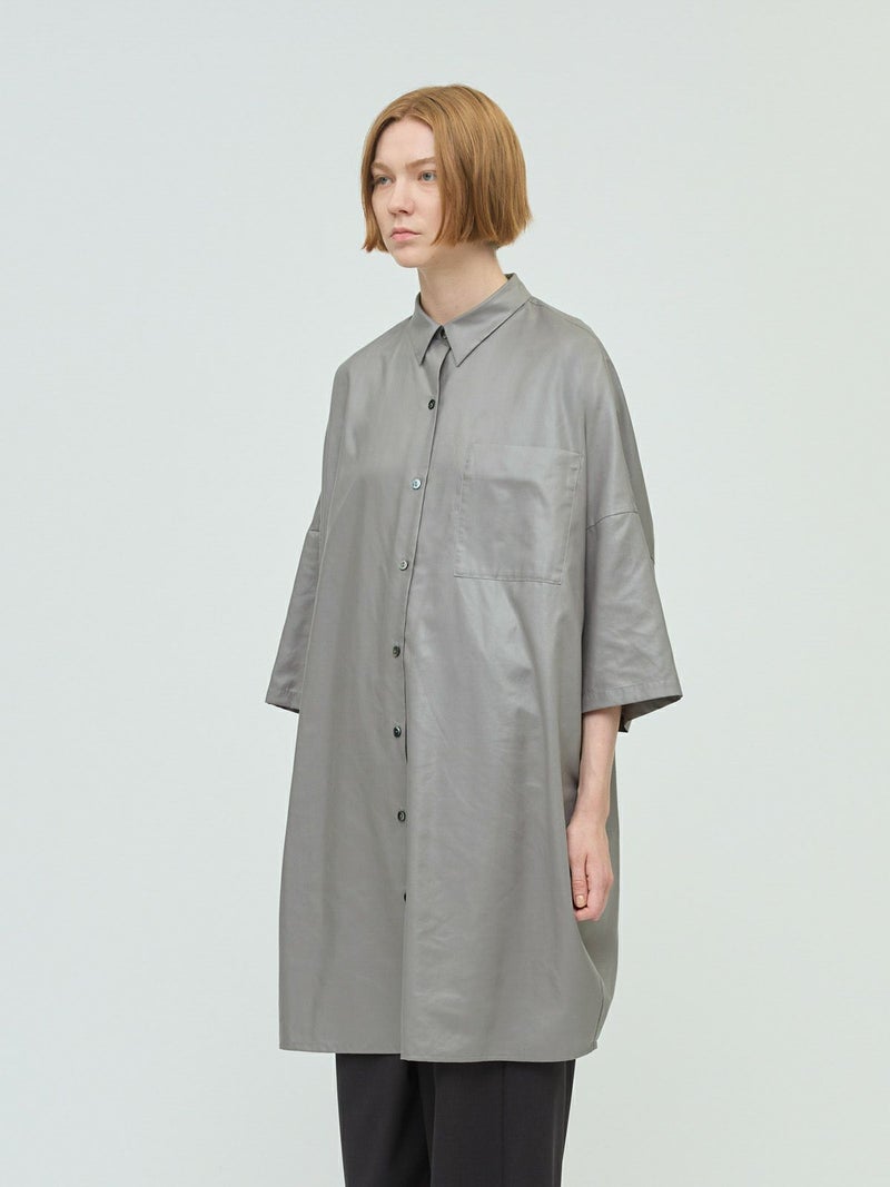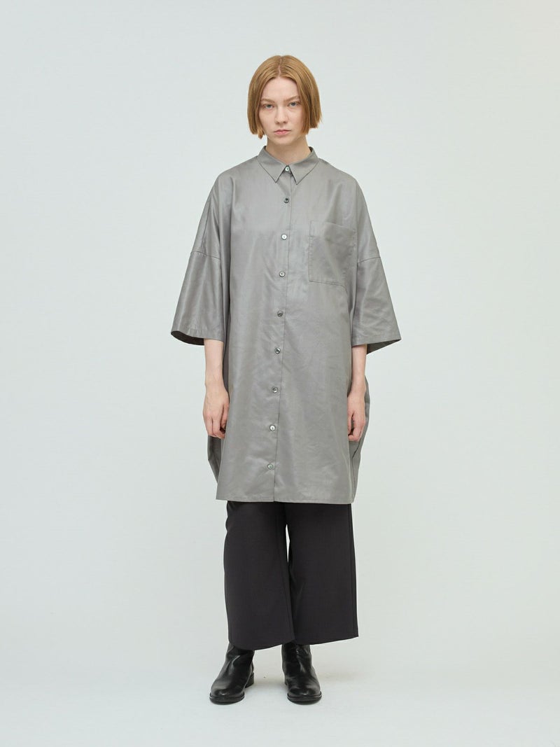 オイルドコットンのような、落ち着いた光沢感のあるグロッシーワイドハーフスリーブシャツワンピースです。ワックスオイルを塗りこんだようなイメージの軽やかな生地感が特徴でトラッドな雰囲気を印象付ける1枚です。レギュラーカラーのベーシックさと肘の隠れる袖丈、羽織りでもいけるデザインでワイドなmizuiro indらしいワンピースとなっています。シックで着回しのしやすい3色の定番カラーで展開です。