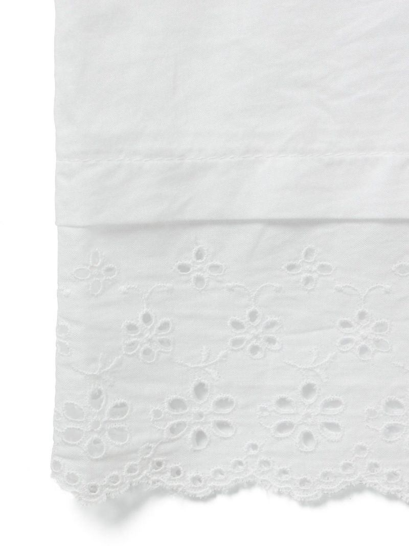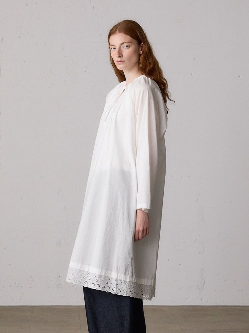 上品なレースの60ローンエンブロイダリーを使用したヘムレーススモックワンピースです。洗い加工を施したことでヴィンテージ感のあるデザインに仕上げました。裾にレースをあしらっています。透け感があり晩夏から秋~冬にかけ長く愛用していただけます。上からニットを着るレイヤードもおすすめです。
