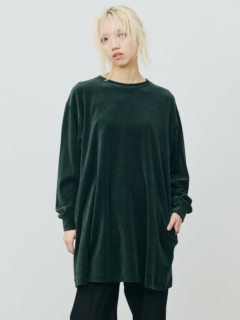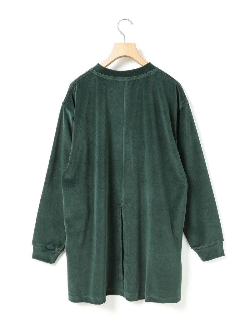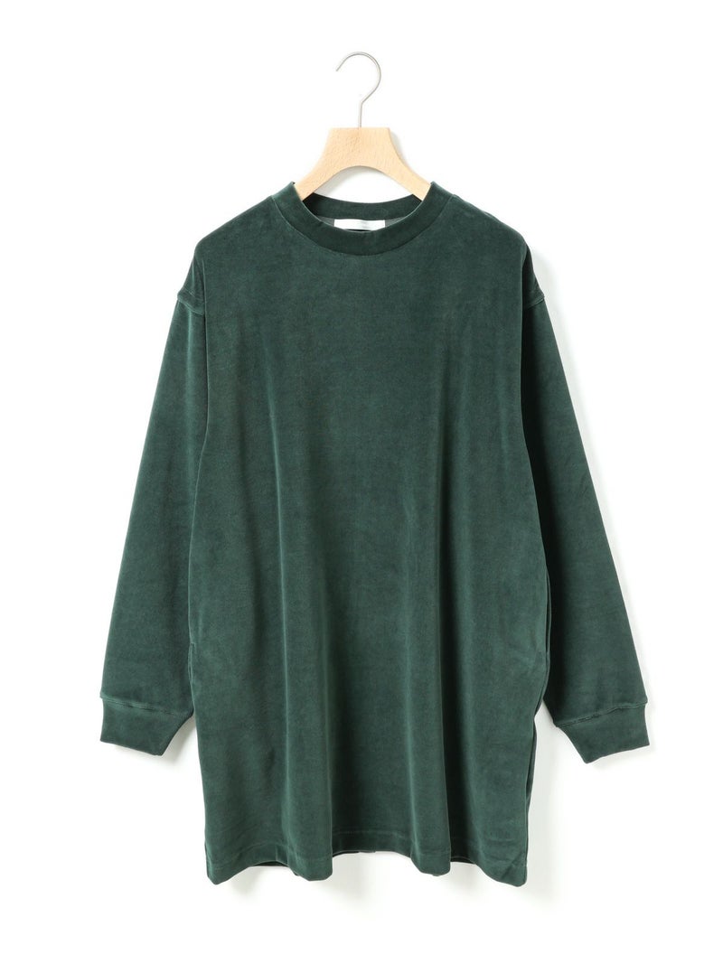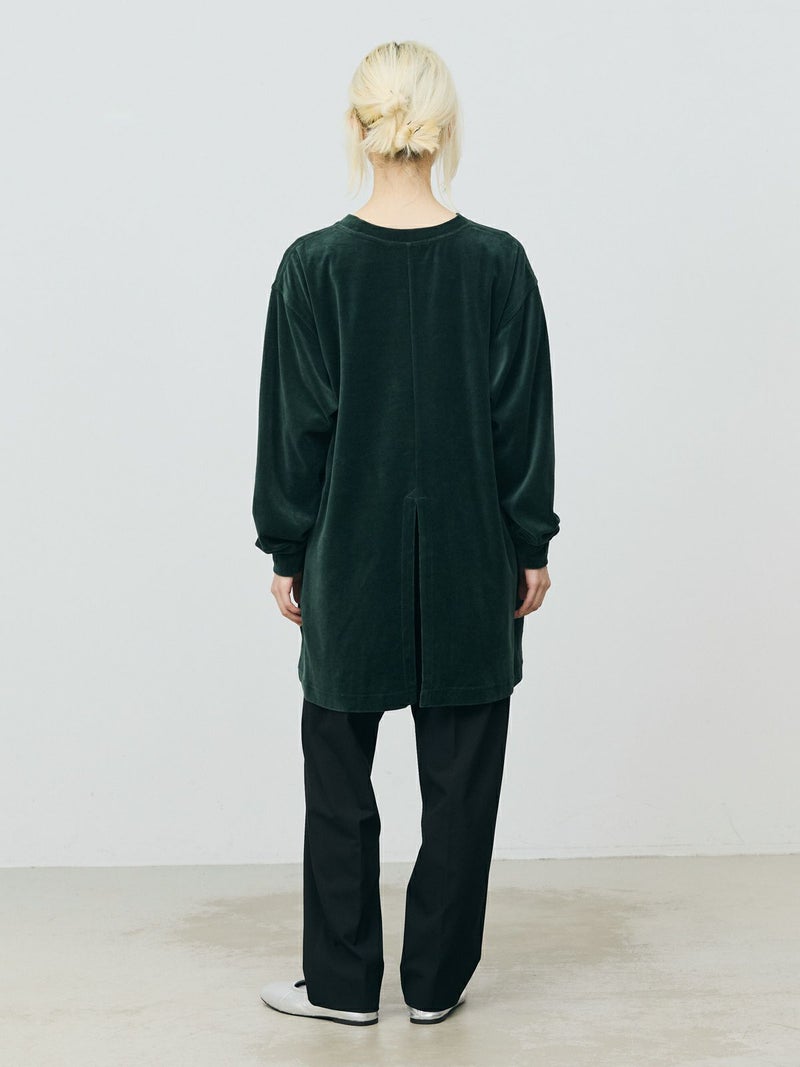 バックヘムに大きくスリットが入ったデザインスウェットトップス、ベロアドレス。メンズのスウェットトップスを元に丈を伸ばしてレディースライクでワンピースのようなデザインに仕上げました。素材にベロアを使用することでカジュアルすぎずウィメンズのアイテムらしいフェミニンな雰囲気を加えております。スラックスに合わせればカッコよく、スカート等と合わせればフェミニンに着ていただけるアイテムです。