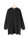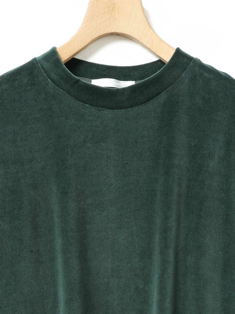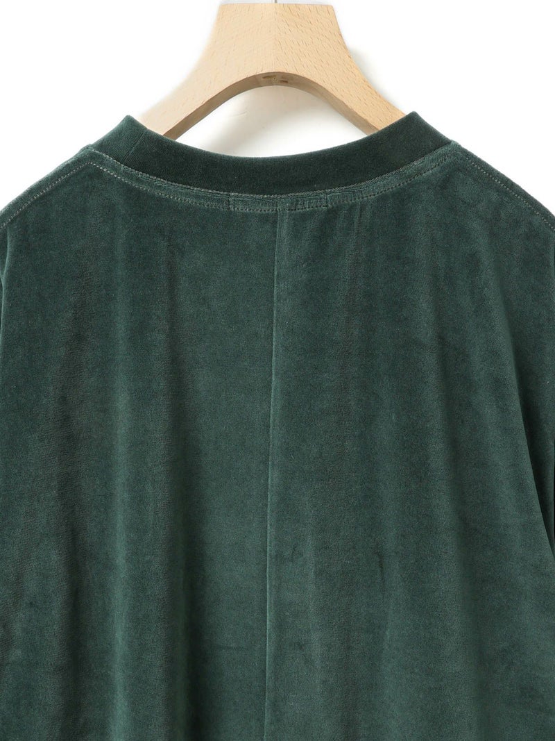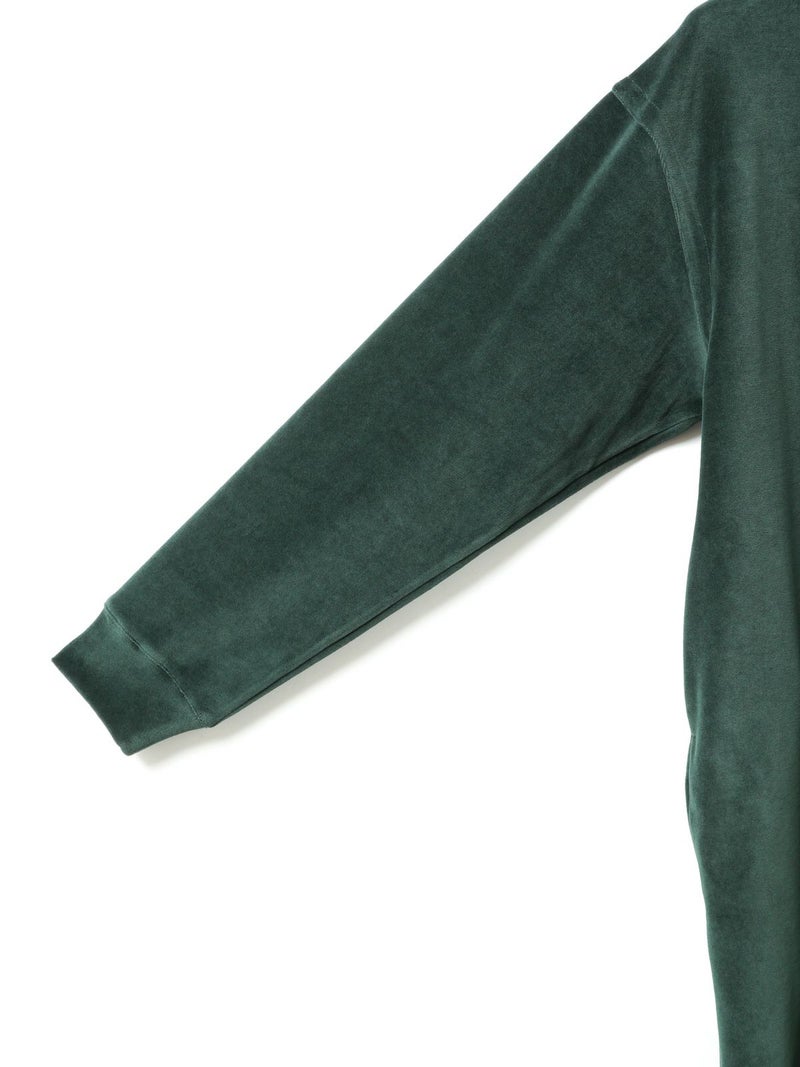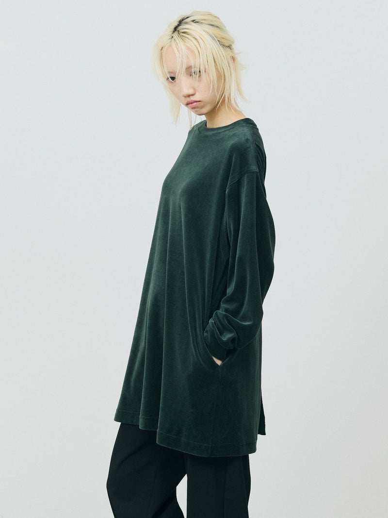 バックヘムに大きくスリットが入ったデザインスウェットトップス、ベロアドレス。メンズのスウェットトップスを元に丈を伸ばしてレディースライクでワンピースのようなデザインに仕上げました。素材にベロアを使用することでカジュアルすぎずウィメンズのアイテムらしいフェミニンな雰囲気を加えております。スラックスに合わせればカッコよく、スカート等と合わせればフェミニンに着ていただけるアイテムです。