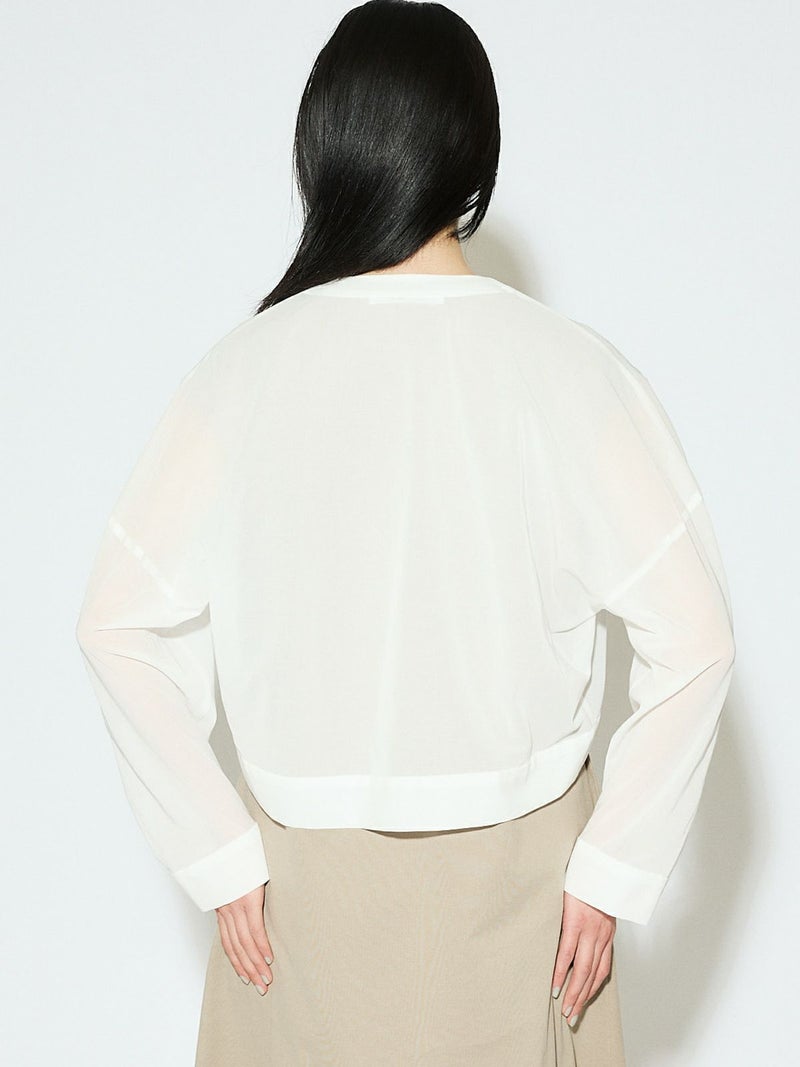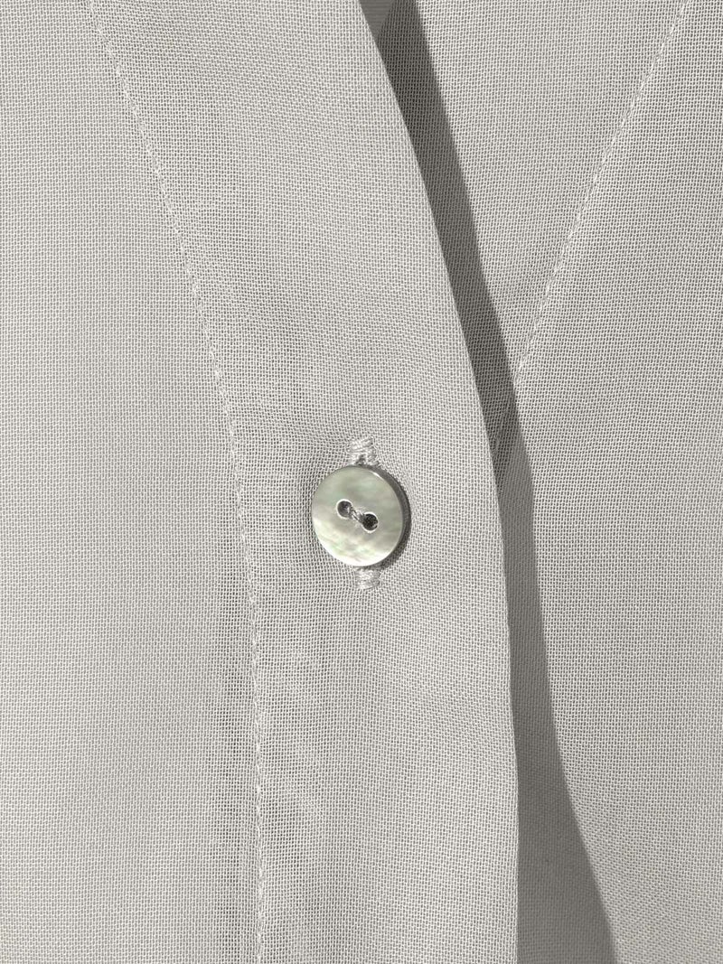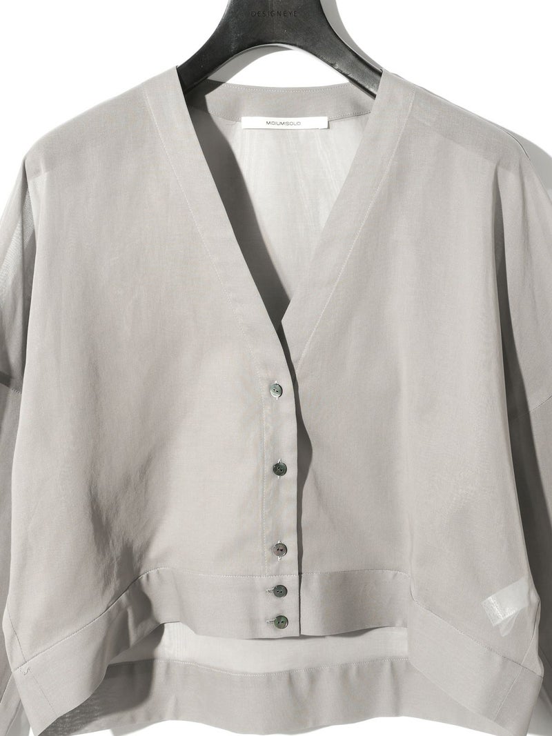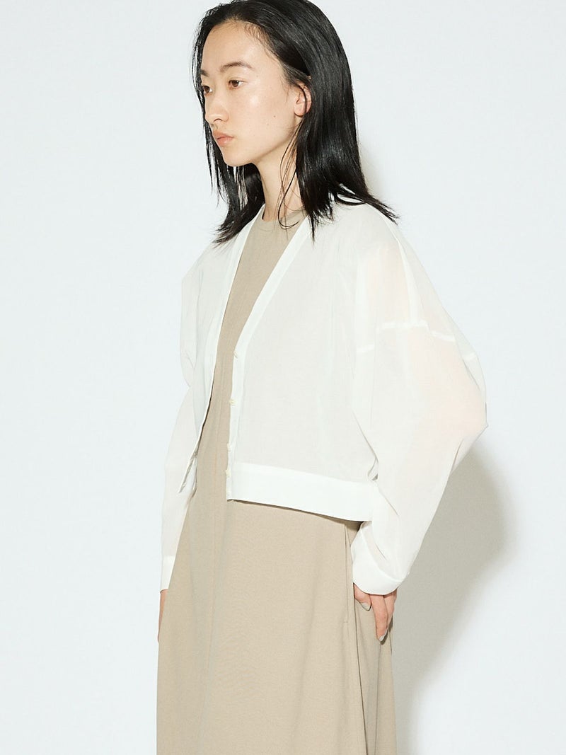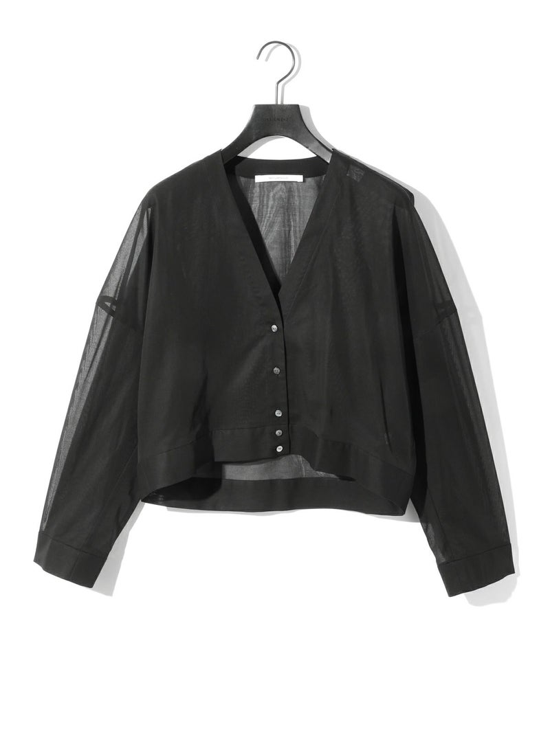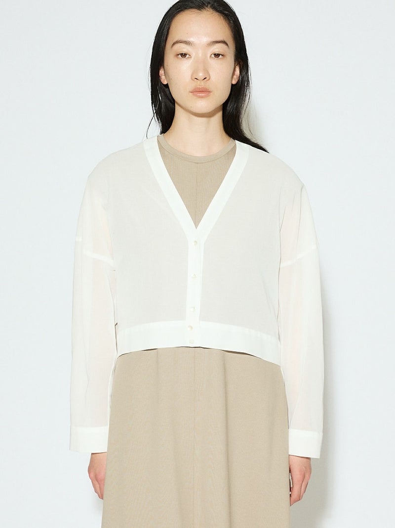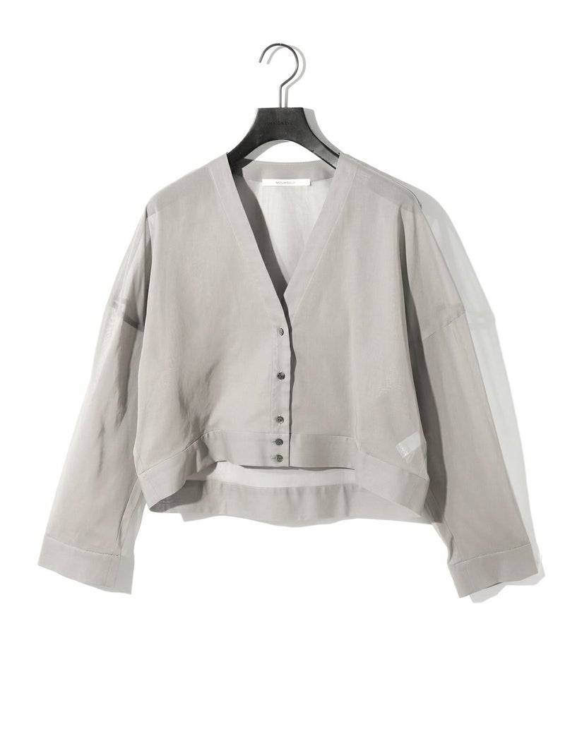 MIDIUMISOLID定番商品でもあるシアーボイルVネックカーディガンが再入荷しました。ガス焼きして毛羽をなくしシャリ感を出した上品な透け感が特徴の100/2ボイル生地を使用。合繊のようにキレイ見えする綿100%素材を選んでいます。 ニットカーデのようなディティールを取り入れシアー素材で布帛仕立てにしたシャツライクカーデ。カジュアルすぎず女性らしい印象で着こなせます。アーム部分で少しふくらみを出し素材との相性で絶妙な抜け感を出しているのがこだわりポイントです。