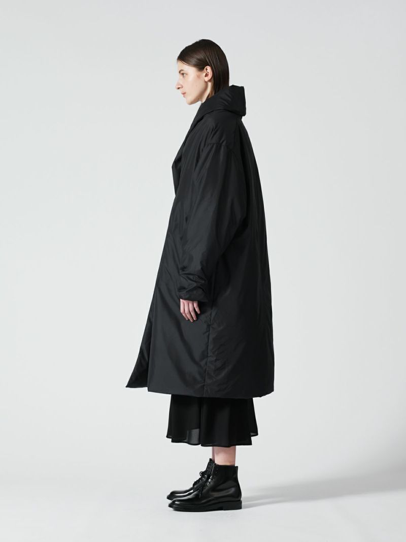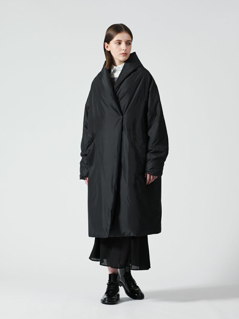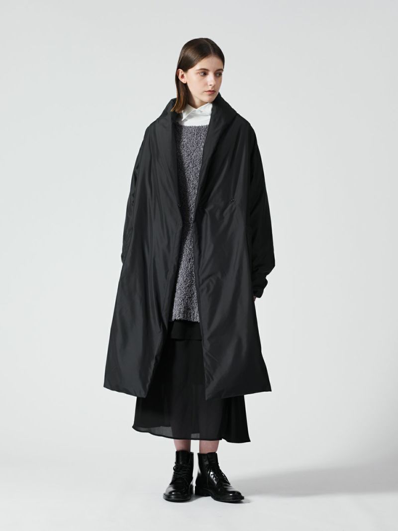 mizuiro indの定番となった人気のドレープライトダウンコートがアップグレードして再登場。ポケットがフロント仕様からサイドタイプに変わり、着膨れ感なくすっきり着用していただけるシルエットに仕上げました。マットなウォーム感のある光沢とタッチ、軽さと暖かさを兼ね備えたシックな雰囲気が印象的で、色々なコーディネートによく合う1枚。スナップボタンなので悴んだ指先でも留めやすい仕様になっています。マフラー無しでも首元を暖かく覆ってくれるかっこいいデザインが特徴。寒い冬の季節に暖かく身を包んでくれるmizuiro indおすすめの1枚です。今季はシックなチャコールグレーとブラックの2色展開です。