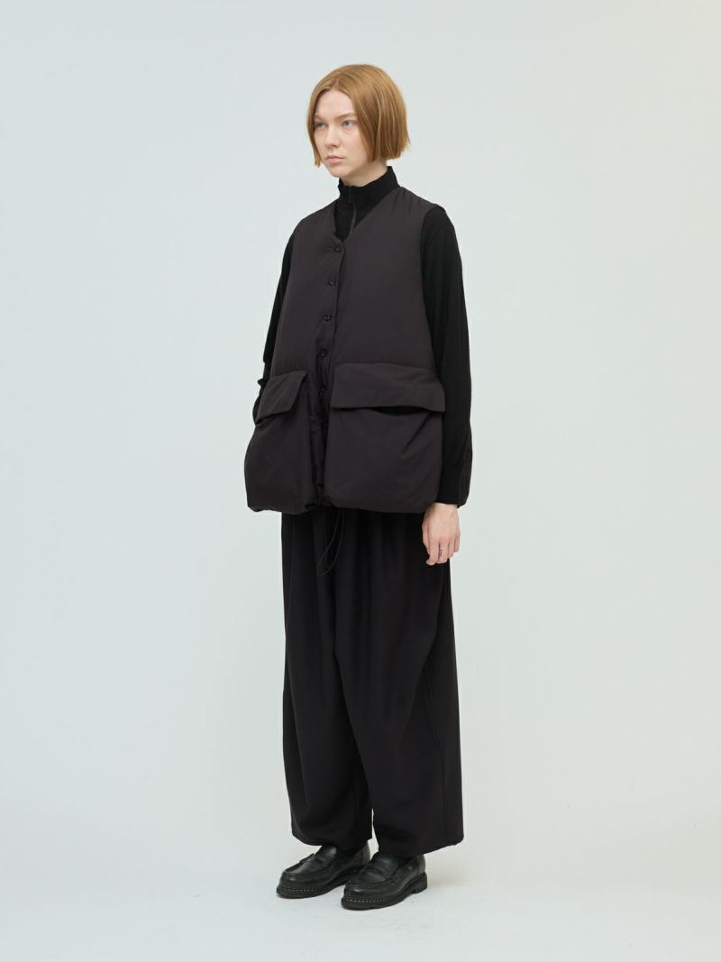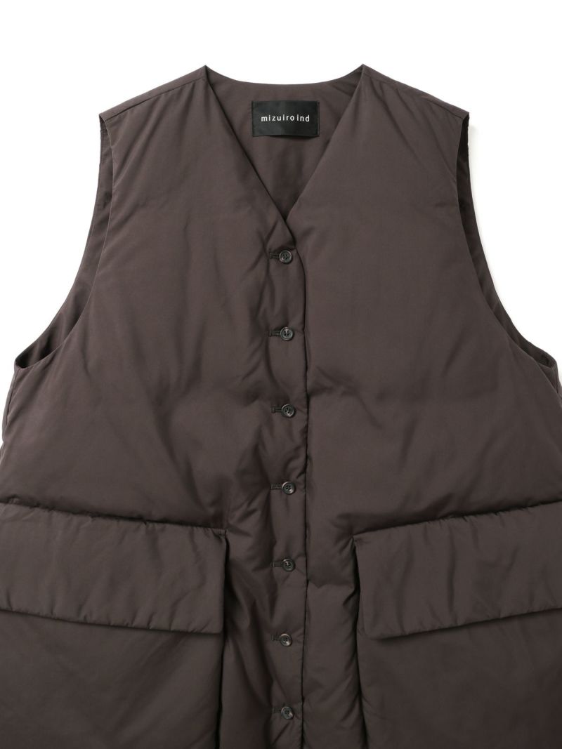 大きなポケットが特徴のダウンベストです。その下にはフロントポケットとは別にサイドポケットもあり拘りのデザインに。Vネックからフロントボタン使用になっており、裾にかけボリューム感のデザインを表現しました。裾にはドロストコードが付いており絞ることで、立体的なシルエットを演出していただけます。スポーティなデザインでアクティブに動きやすいのもポイント。インナーの重ね着がしやすいのでコーディネートの調整もしやすい1枚です。