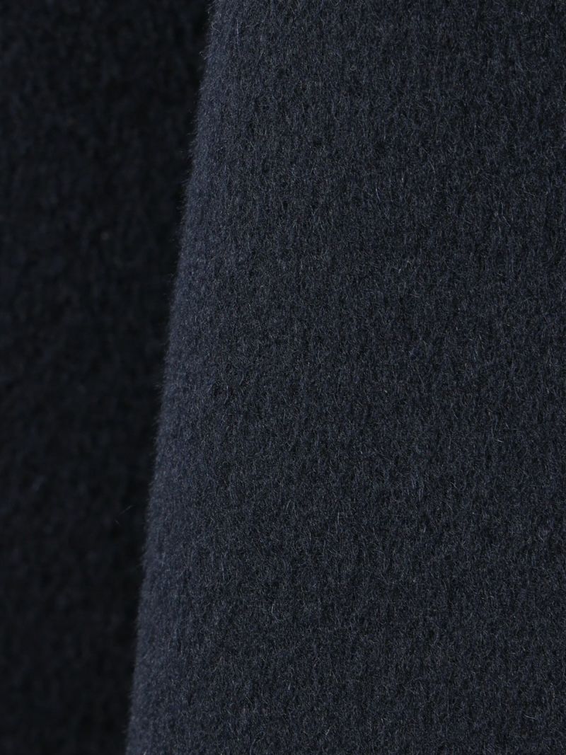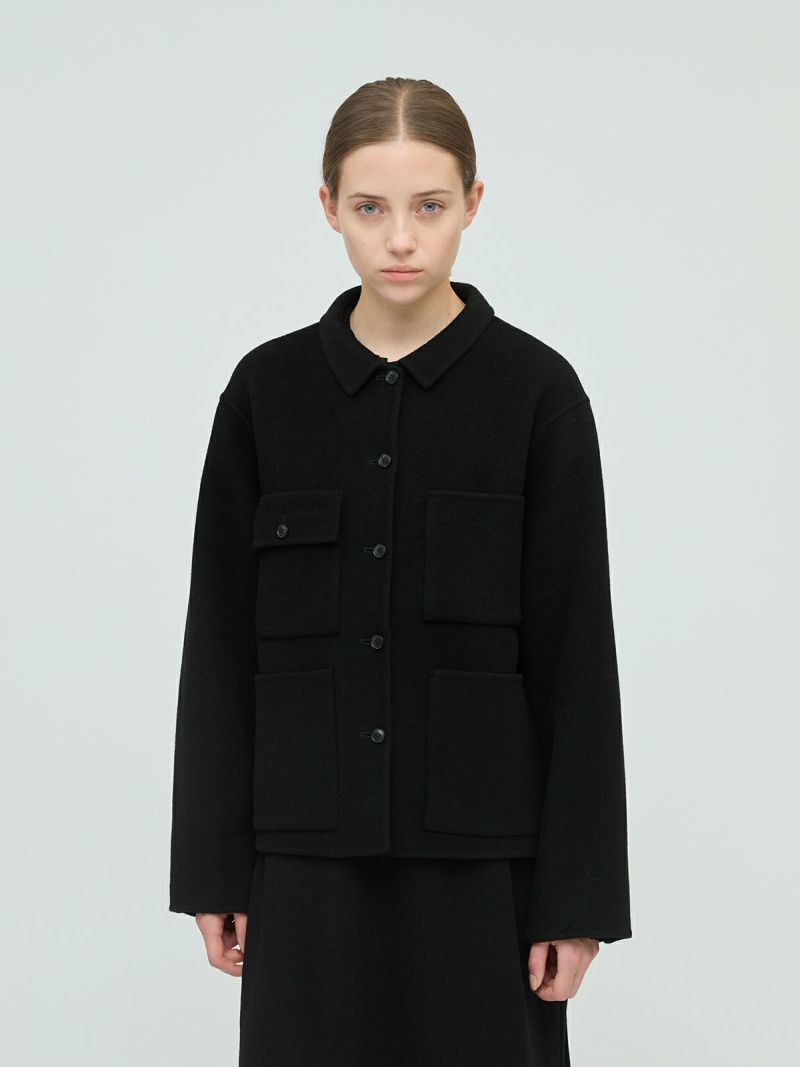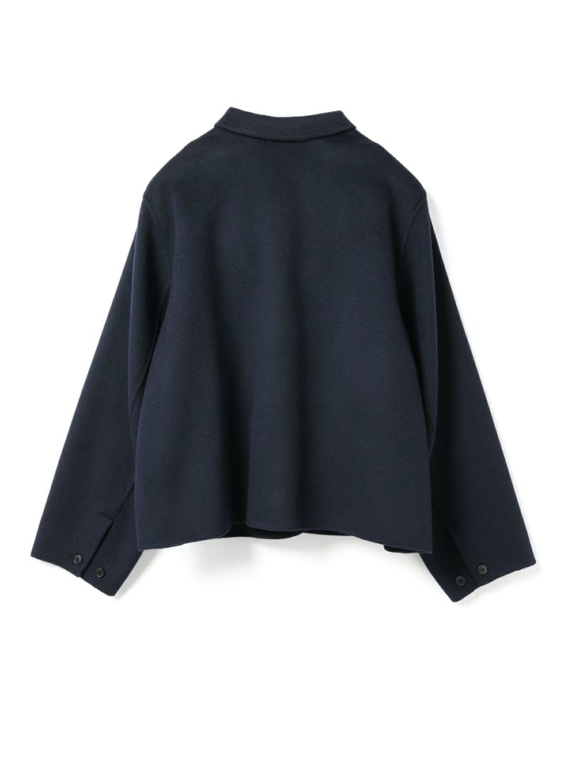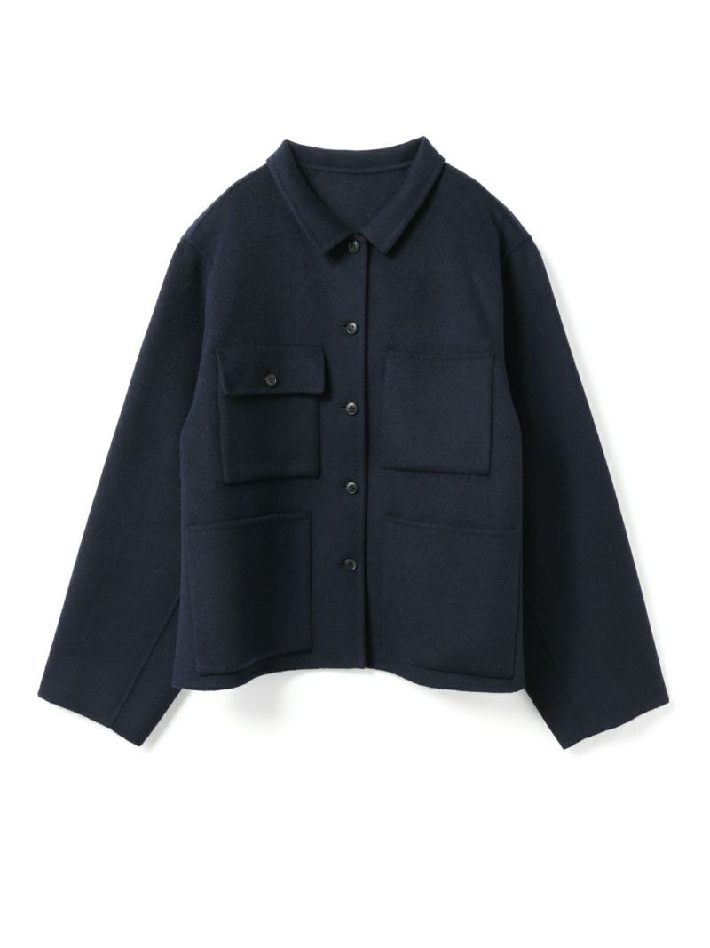 リバーフェイス素材を使用したウールユーティリティジャケットです。mizuiro ind新型のアウターで、メンズライクなカバーオールのデザインを表現しました。一枚仕立てで軽さと保温性の高さが魅力。手作業で縫い合わせた手間と時間がかかる、高級な仕立てで仕上げています。フロントボタン使用、フロントポケットが特徴的。ネイビーとブラックの2色に絞ったトラッドなアウターで長く愛用していただける1枚です。