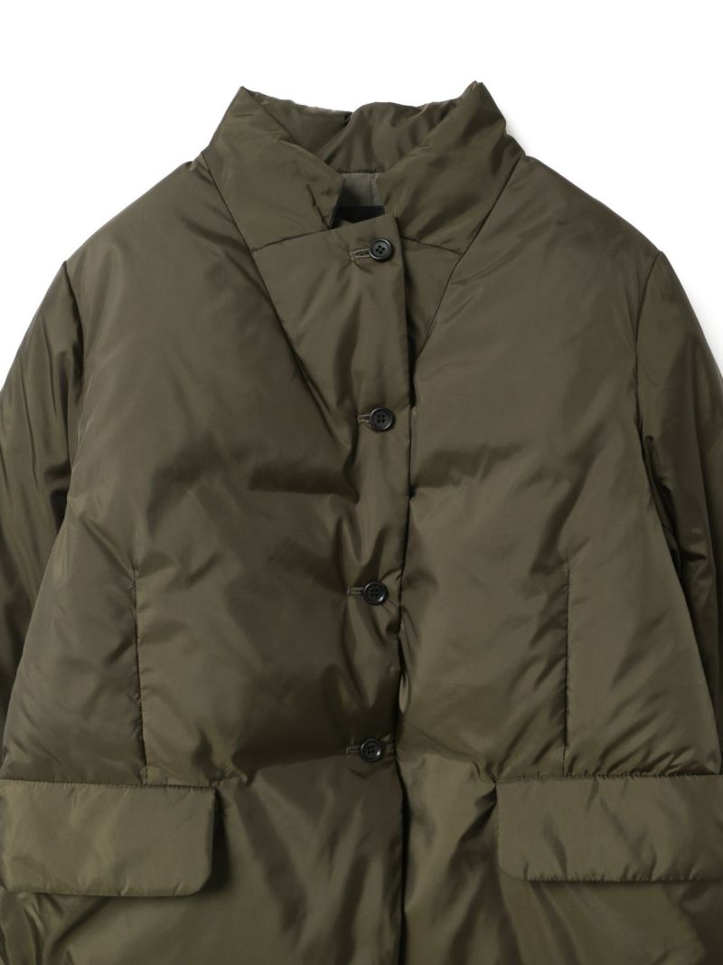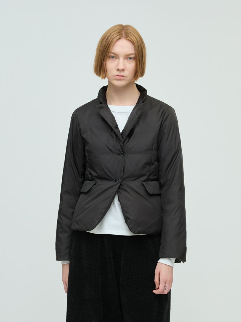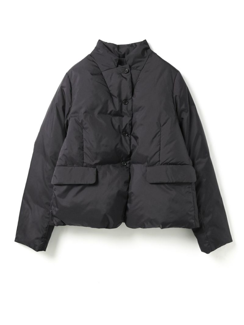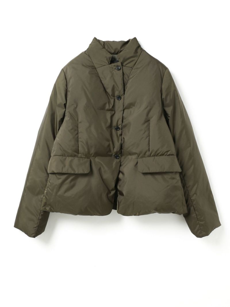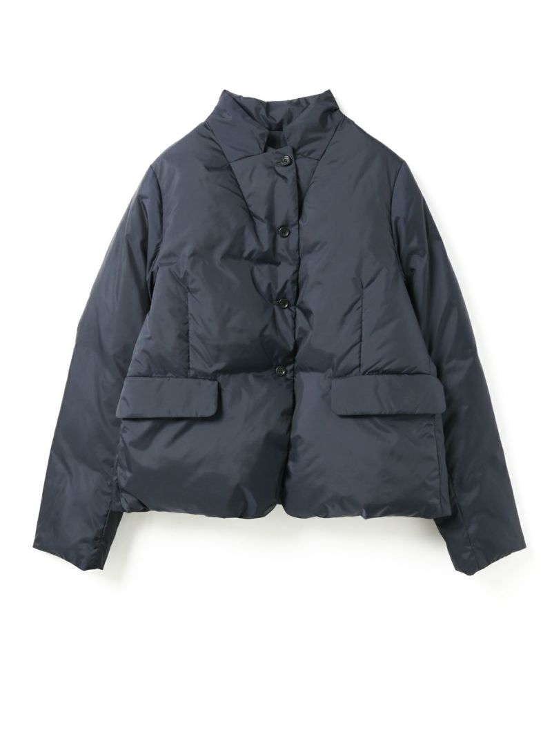 テーラージャケットをダウン仕立てでデザインしたダウンテーラードジャケットです。コンパクト目なジャストサイズで仕上げています。保温性が高く軽さのあるアウターで、寒い時期に大変重宝します。首は襟を立てても素敵です。フロントボタン仕様なのでテーラードジャケットのきちんと感を表現しています。合わせやすく温かい1枚です。