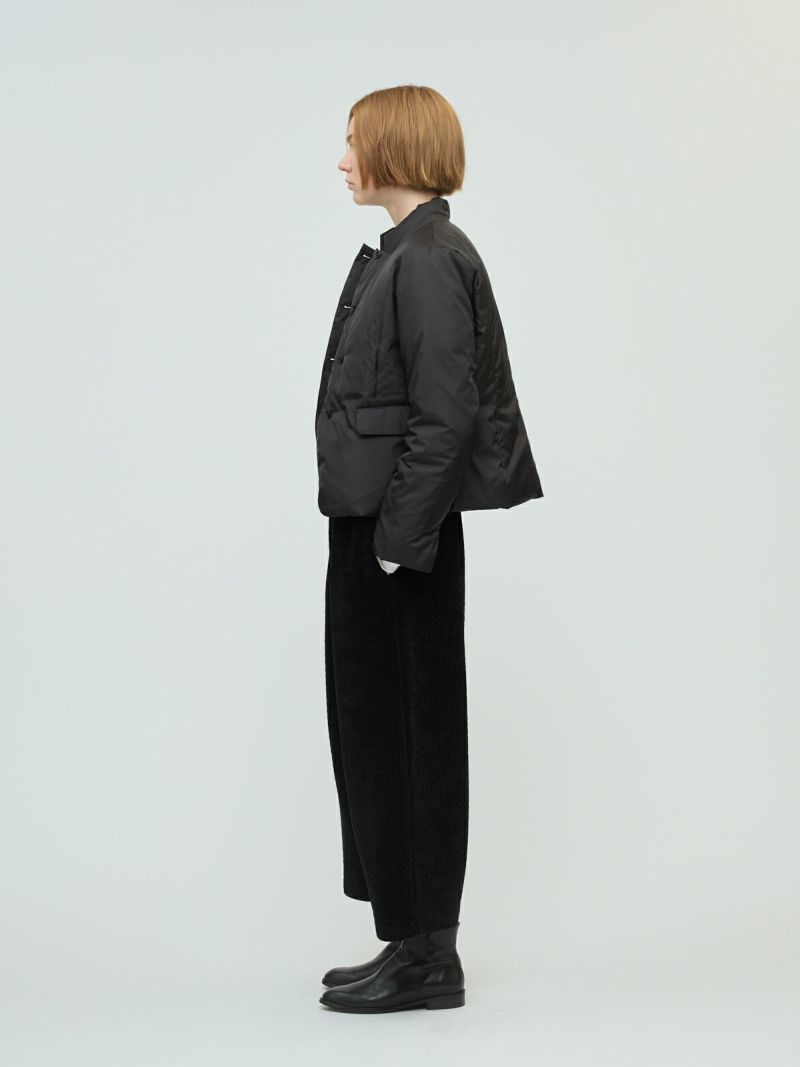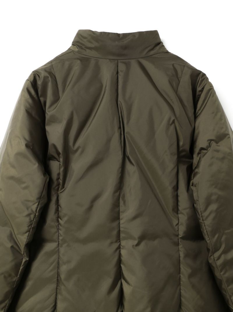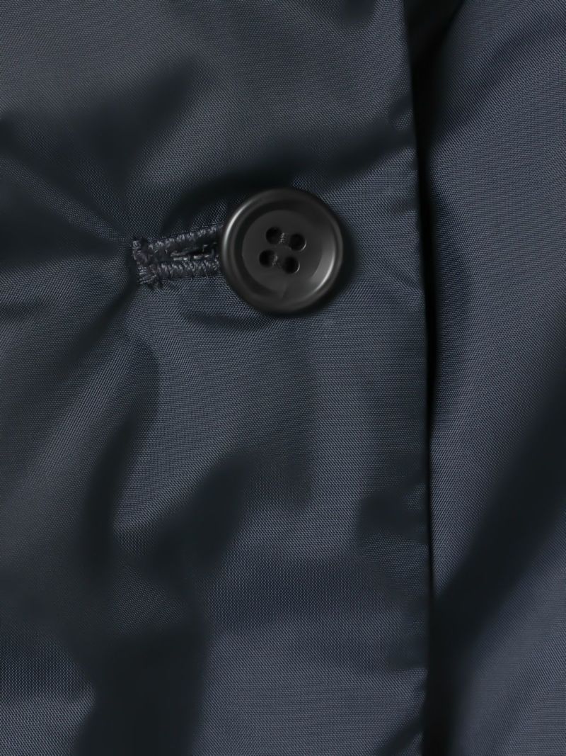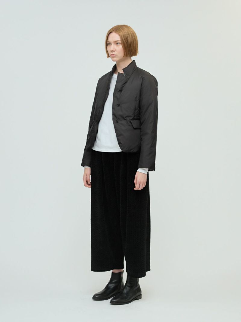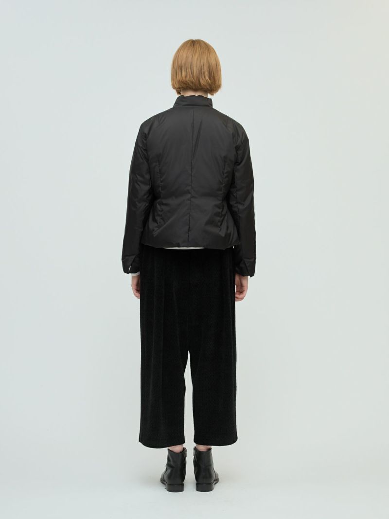 テーラージャケットをダウン仕立てでデザインしたダウンテーラードジャケットです。コンパクト目なジャストサイズで仕上げています。保温性が高く軽さのあるアウターで、寒い時期に大変重宝します。首は襟を立てても素敵です。フロントボタン仕様なのでテーラードジャケットのきちんと感を表現しています。合わせやすく温かい1枚です。