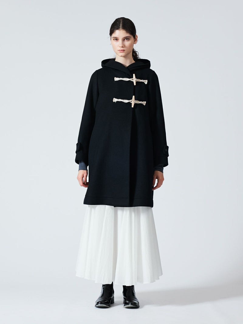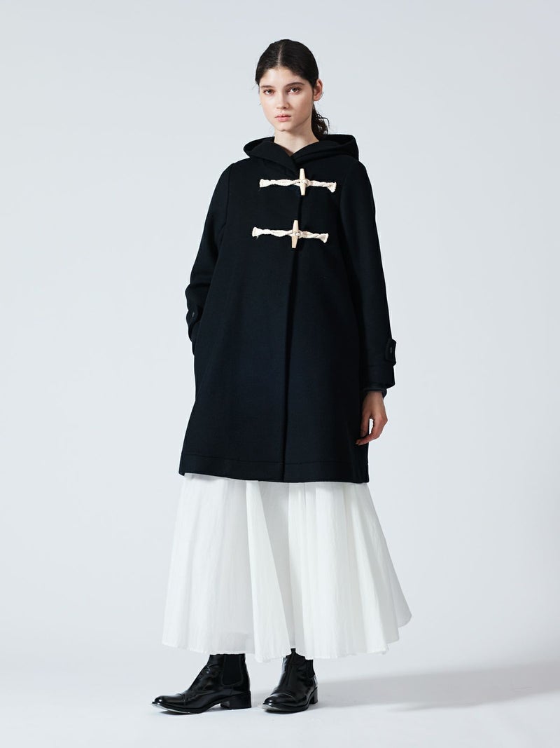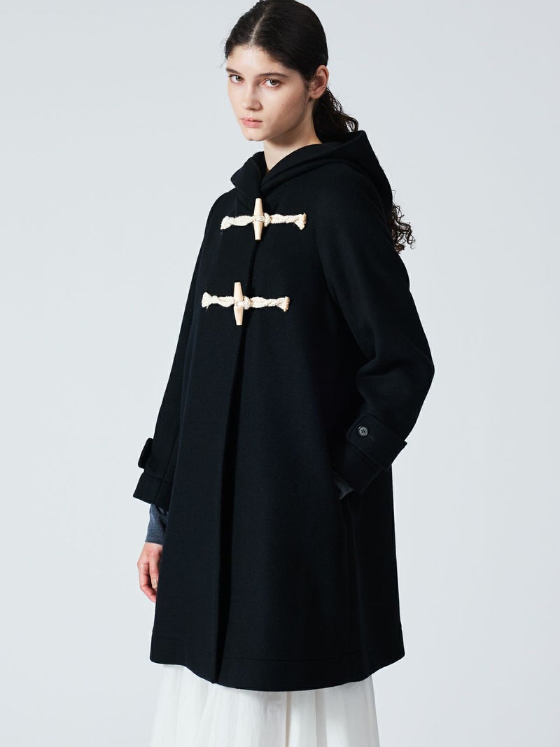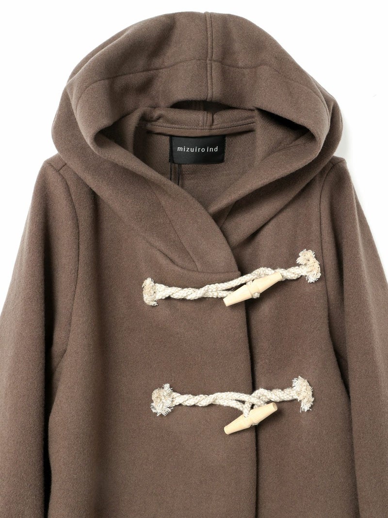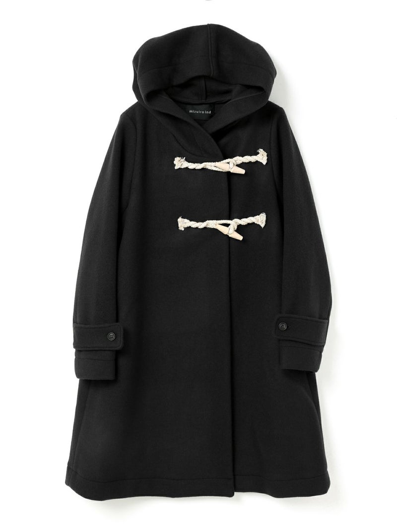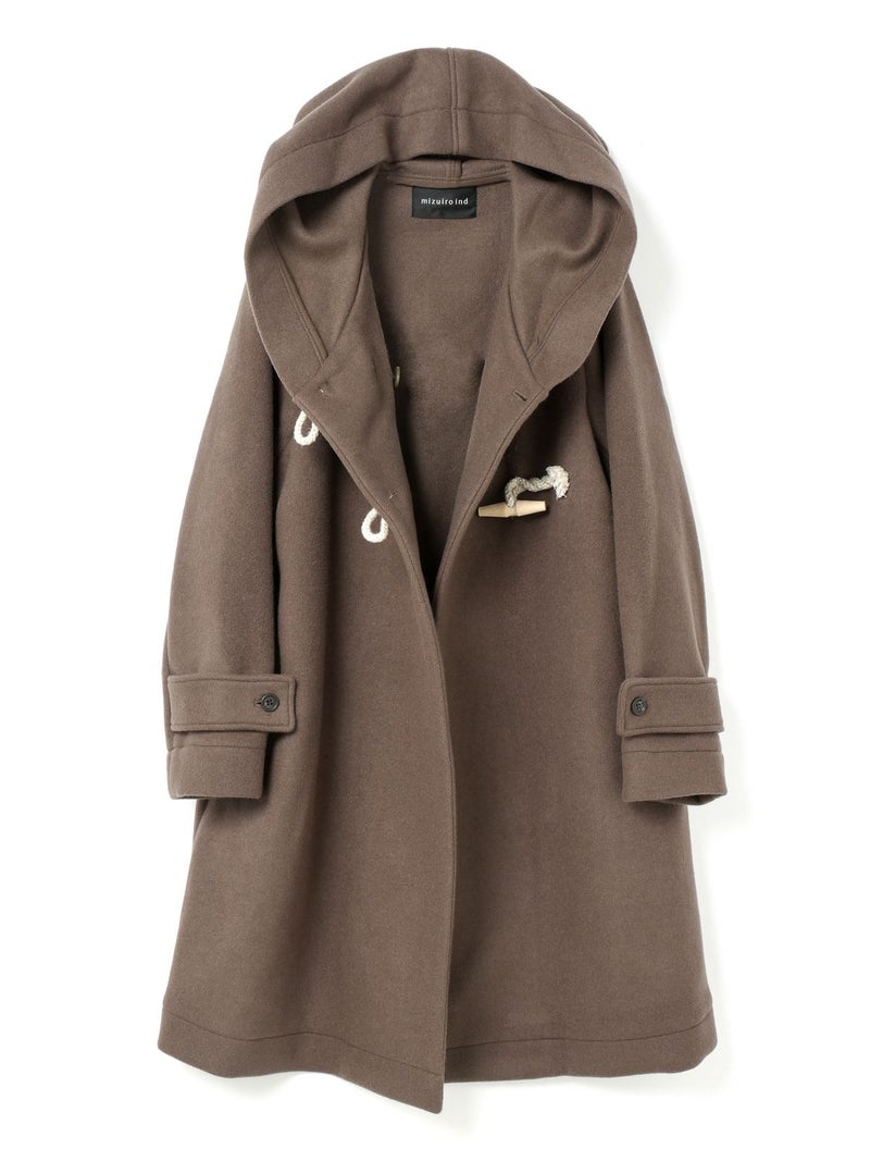mizuiro ind人気のAラインフード付きコート。ライトな素材に替え、トグルと留め紐はオールホワイトに。カラーは3色展開で魅力的になってご提案。二重織りスーパー100ウールを使用した暖かさが特徴。トグル位置は上に二か所のみで留めやすく、上品なAラインがスッキリ感を感じられるシルエットです。裏地は付いておりません。毎年長く愛用できるお勧めのコートなので冬の寒さが待ち遠しくなる1枚です。