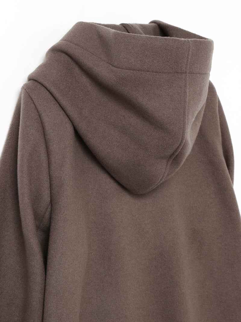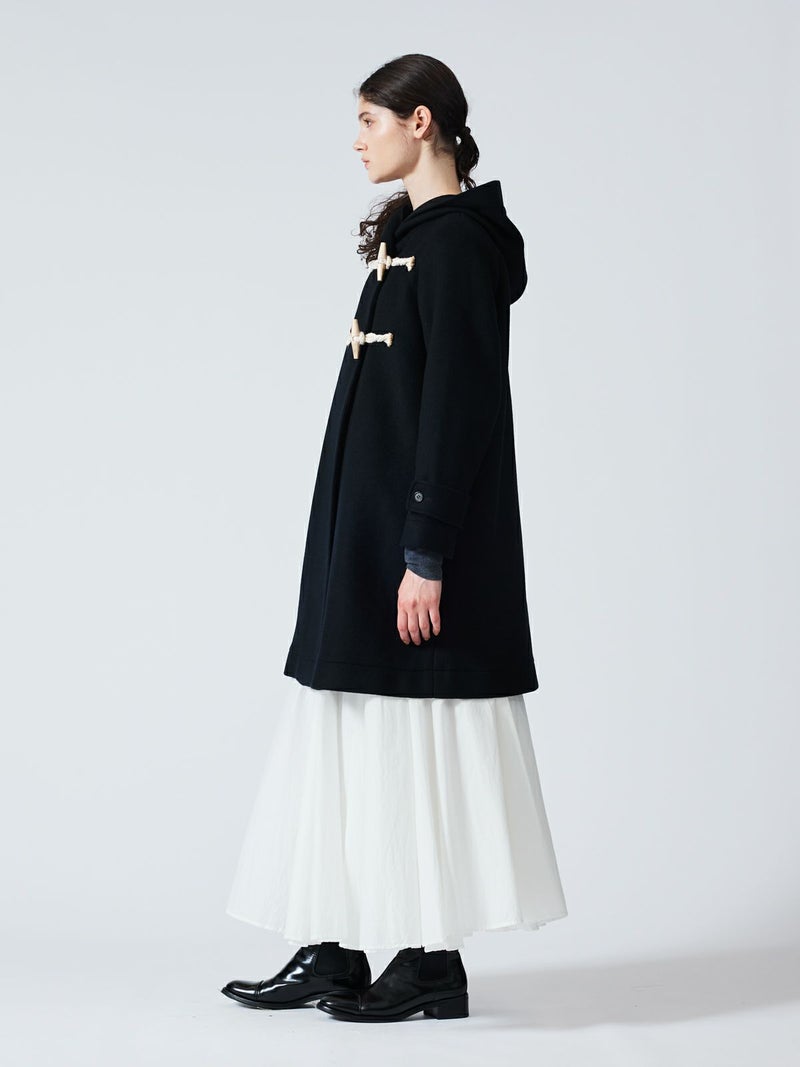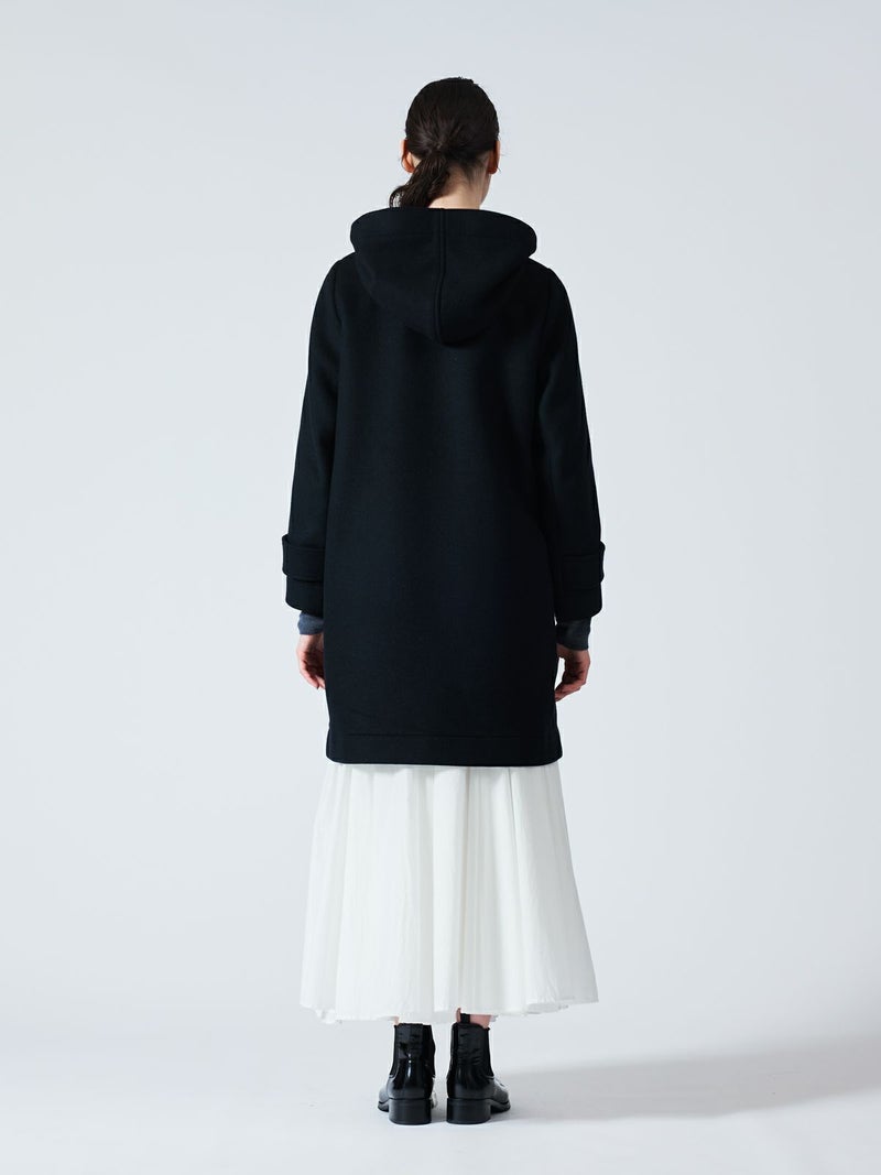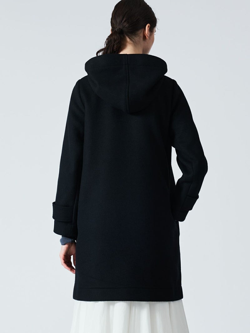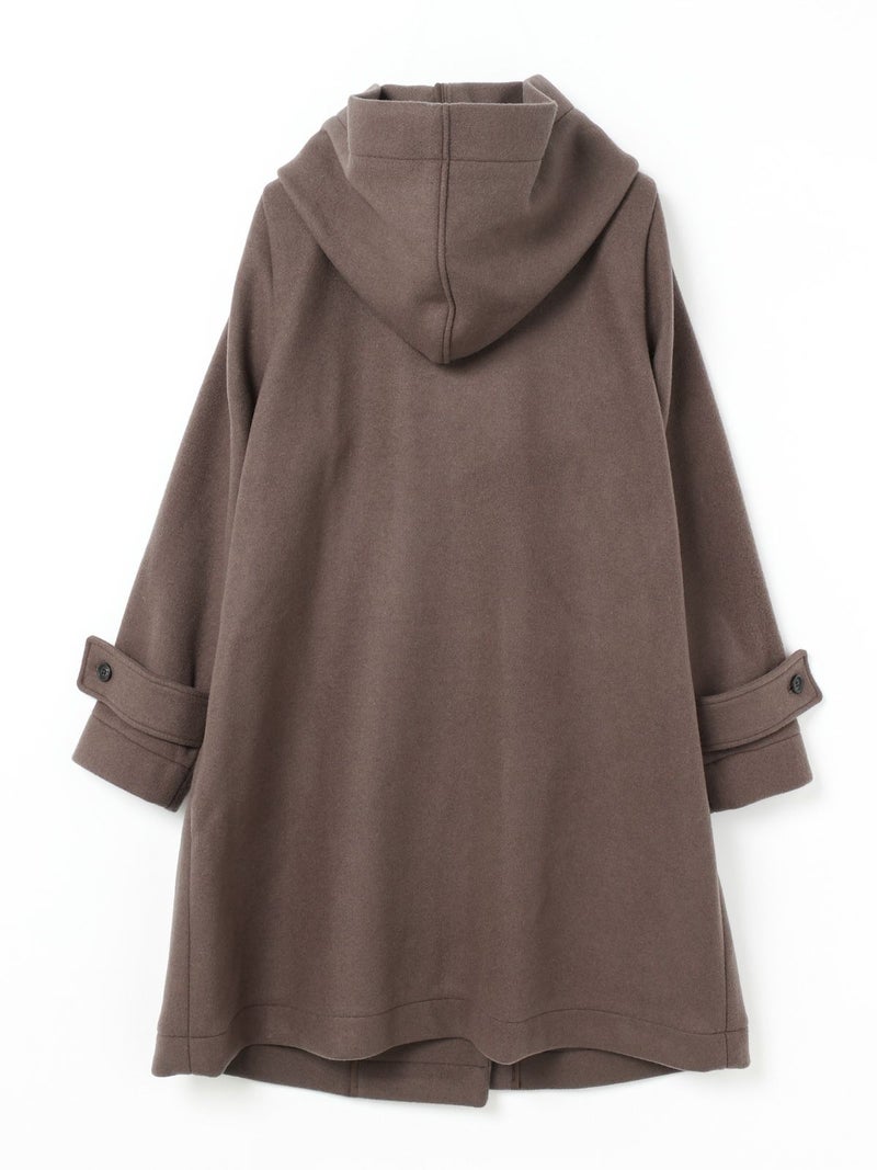 mizuiro ind人気のAラインフード付きコート。ライトな素材に替え、トグルと留め紐はオールホワイトに。カラーは3色展開で魅力的になってご提案。二重織りスーパー100ウールを使用した暖かさが特徴。トグル位置は上に二か所のみで留めやすく、上品なAラインがスッキリ感を感じられるシルエットです。裏地は付いておりません。毎年長く愛用できるお勧めのコートなので冬の寒さが待ち遠しくなる1枚です。