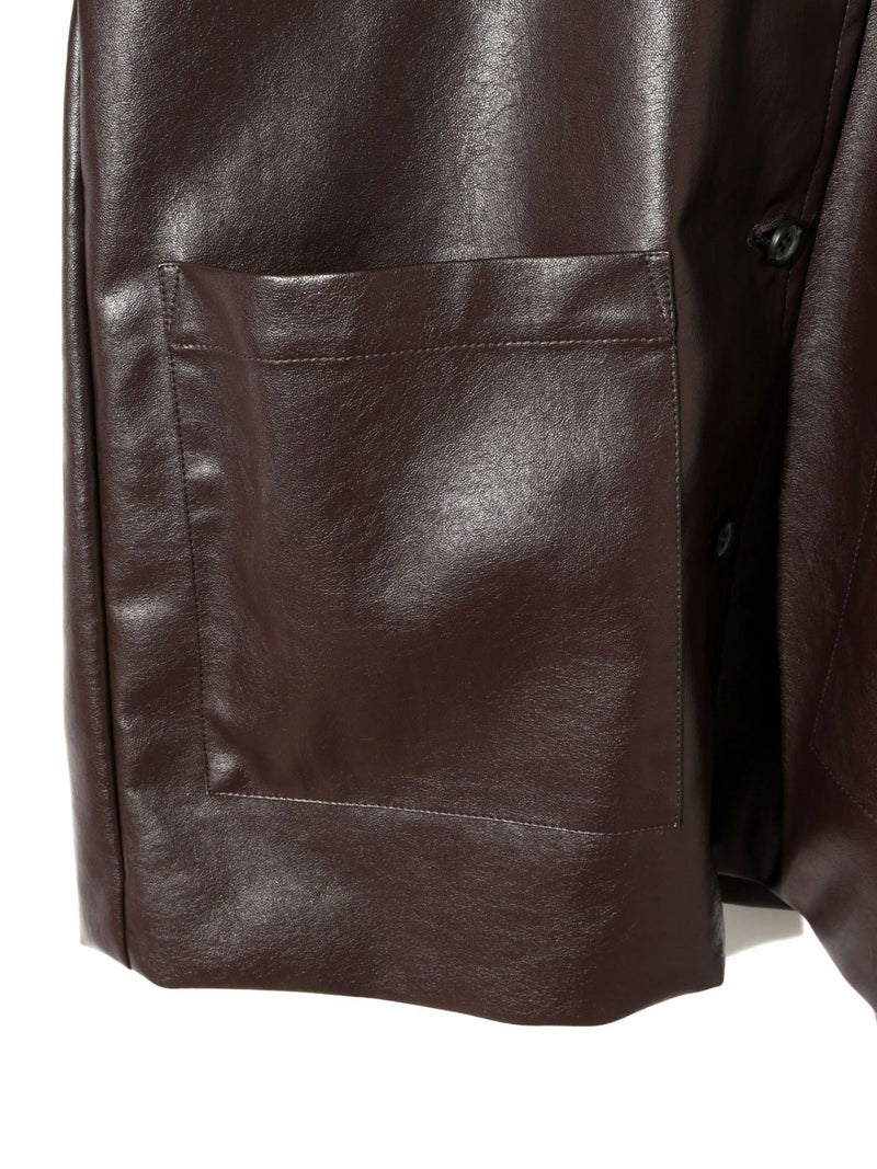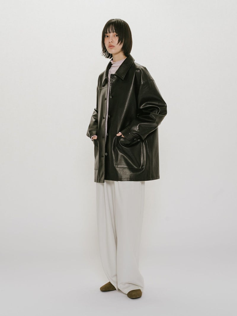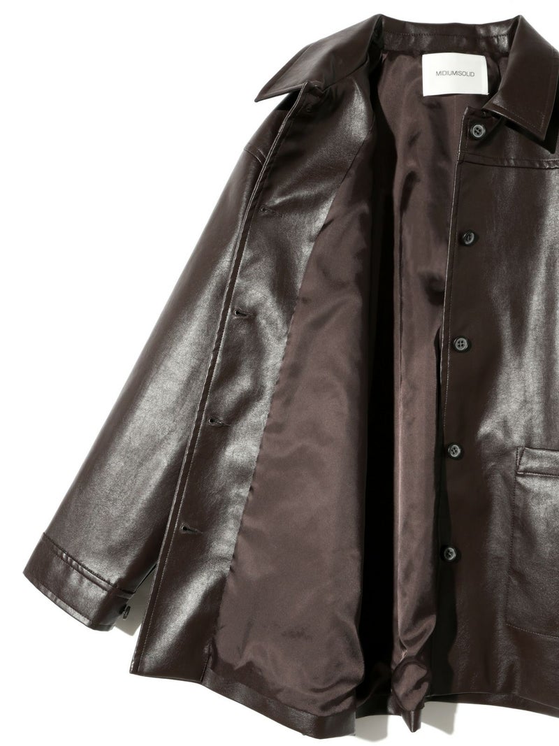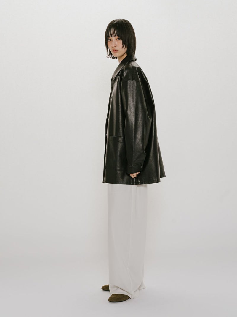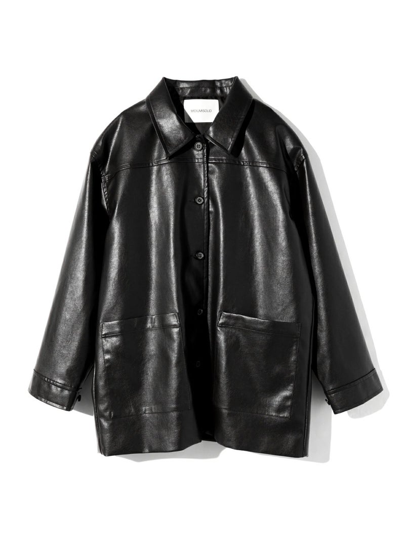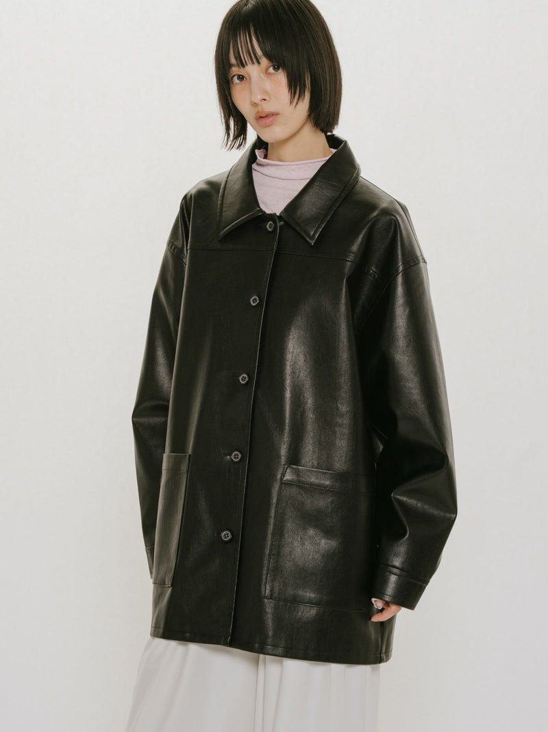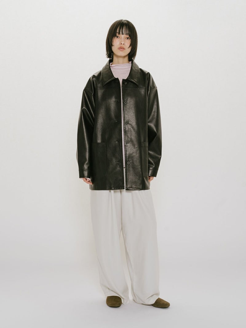 肉感のあるフェイクレザーのブルゾン、シンセティックレザーオーバーサイズブルゾンです。縦長のゆったりしたシルエットで、前下がりの襟など女性らしいデザインで小柄な方にもおすすめのアウターとなっています。中に肉厚なニットやパーカーも着用いただけるので寒い時期でも気にせず着用できます。女性らしい抜け感のあるインナーやボトムスとの合わせがお勧め。フェイクレザーなので雨雪を気にせず着用いただけるのも嬉しいポイントです。