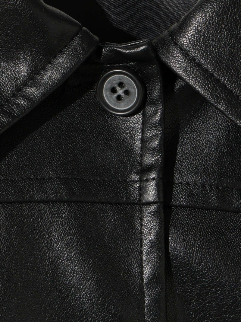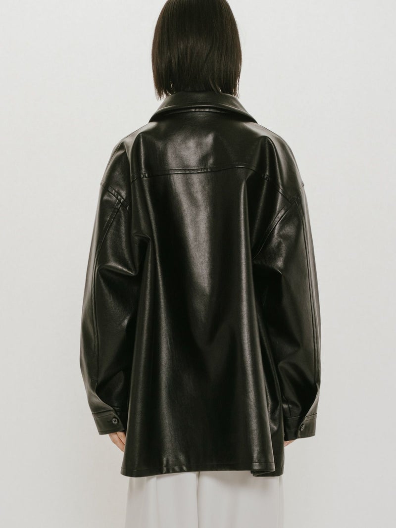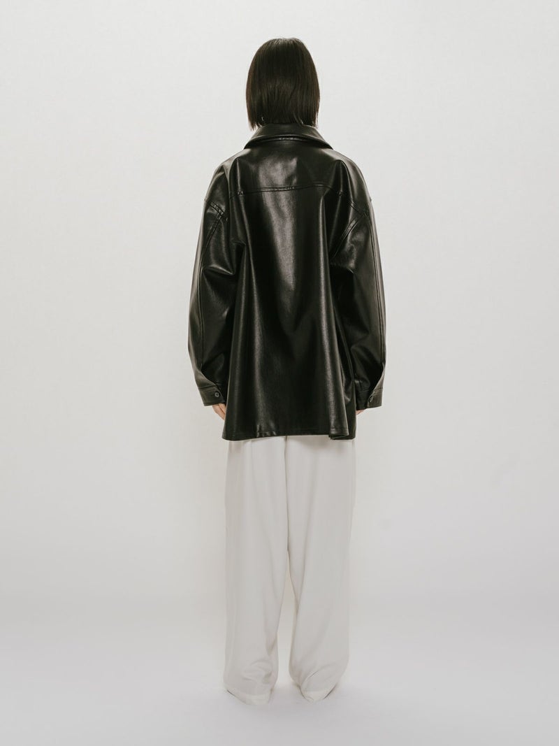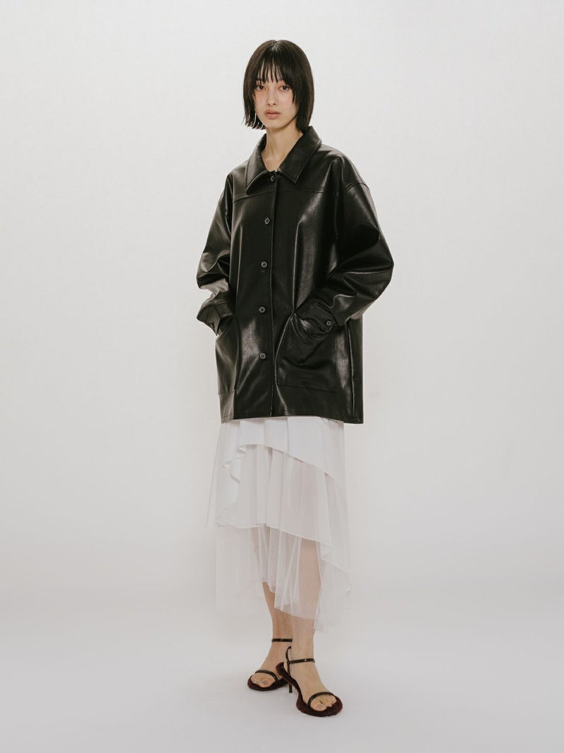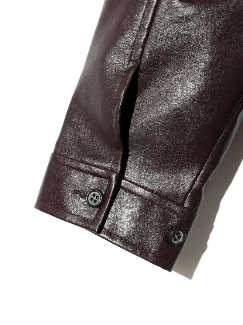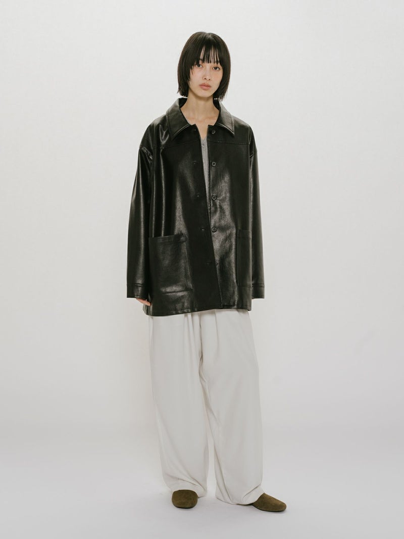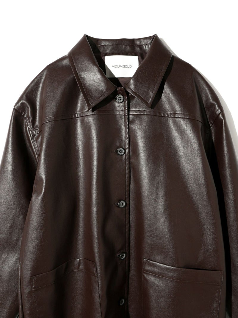 肉感のあるフェイクレザーのブルゾン、シンセティックレザーオーバーサイズブルゾンです。縦長のゆったりしたシルエットで、前下がりの襟など女性らしいデザインで小柄な方にもおすすめのアウターとなっています。中に肉厚なニットやパーカーも着用いただけるので寒い時期でも気にせず着用できます。女性らしい抜け感のあるインナーやボトムスとの合わせがお勧め。フェイクレザーなので雨雪を気にせず着用いただけるのも嬉しいポイントです。