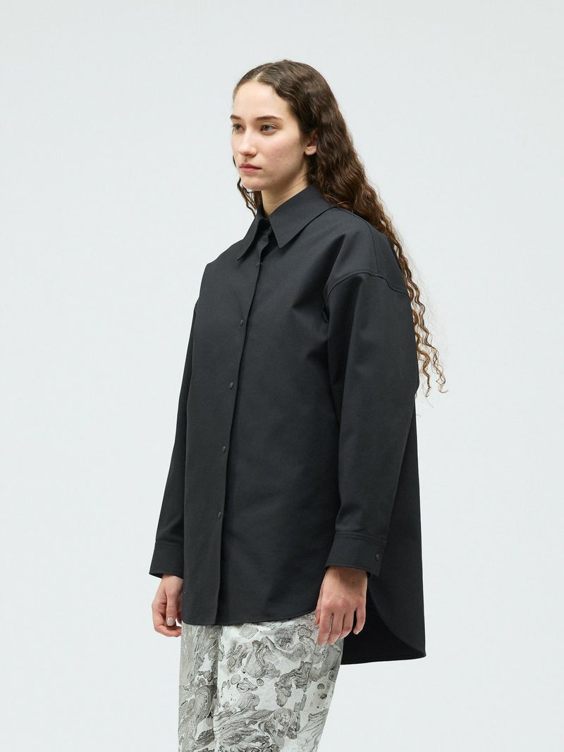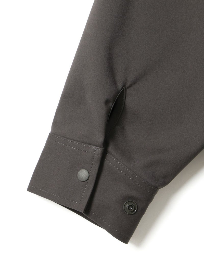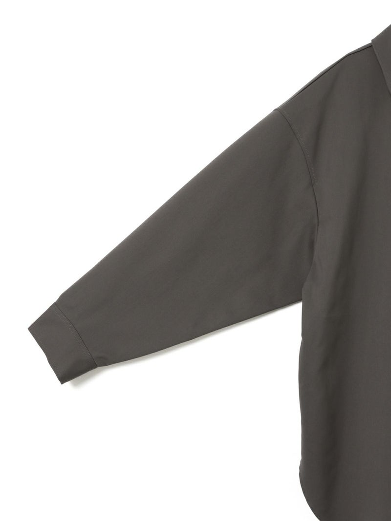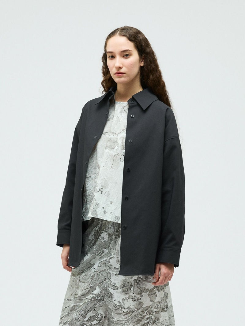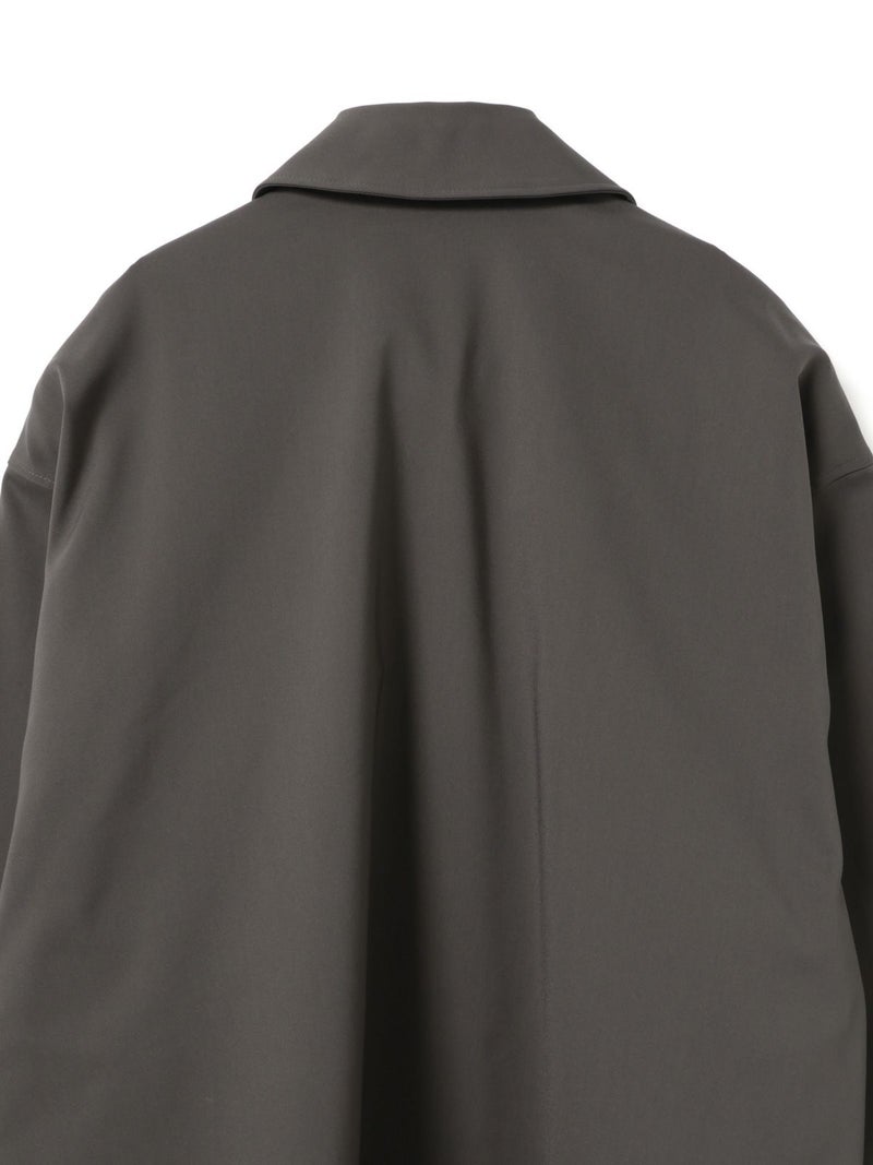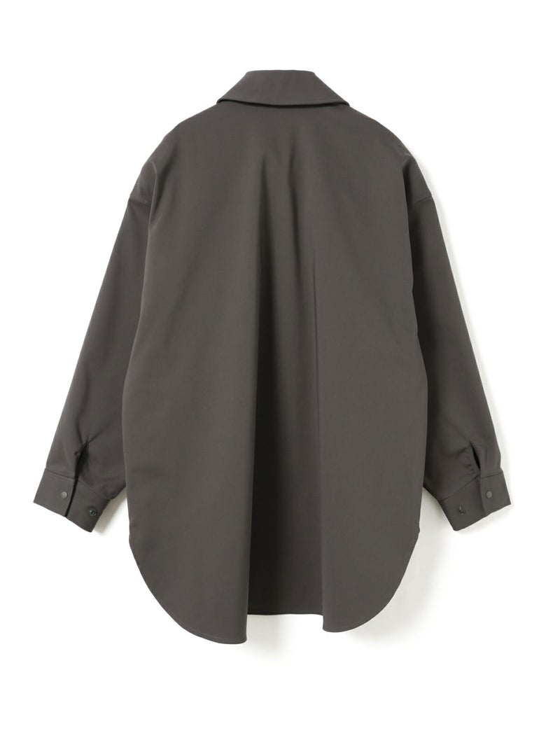 ハリ感のあるメンズライクな素材を使用したダブルクロスワイドシャツブルゾンです。襟は大きく高さのあるデザインが特徴。前後差を付けた丸い裾ラインはシャツのような軽さのあるデザインに仕上がっています。ストレッチもきいているので動きやすい生地もポイント。フロントはスナップボタン仕様。シャツジャケットの雰囲気で気軽に羽織れるアウターとなっています。
