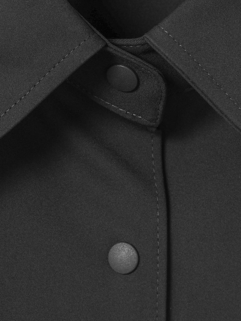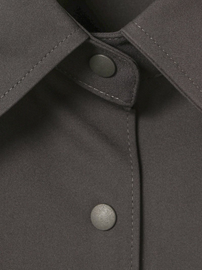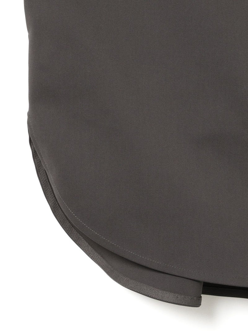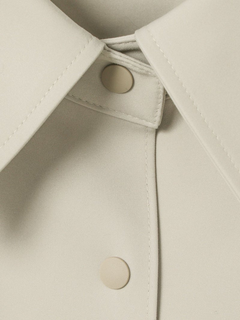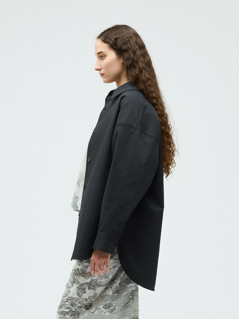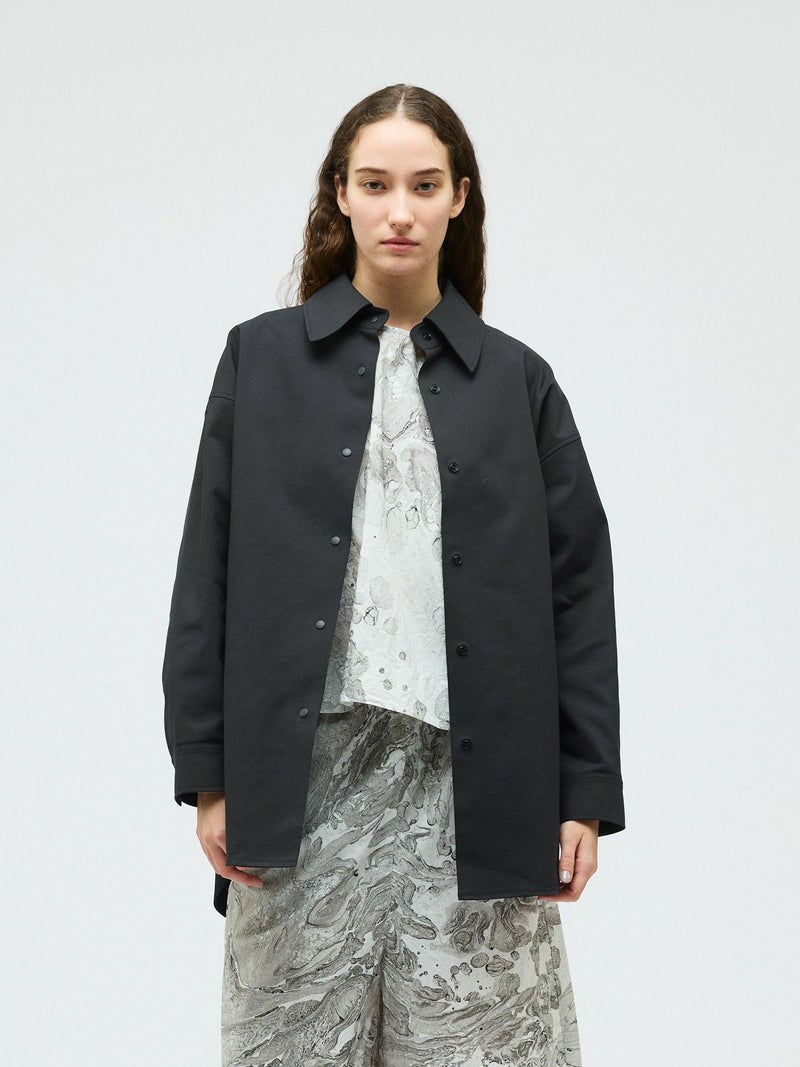 ハリ感のあるメンズライクな素材を使用したダブルクロスワイドシャツブルゾンです。襟は大きく高さのあるデザインが特徴。前後差を付けた丸い裾ラインはシャツのような軽さのあるデザインに仕上がっています。ストレッチもきいているので動きやすい生地もポイント。フロントはスナップボタン仕様。シャツジャケットの雰囲気で気軽に羽織れるアウターとなっています。