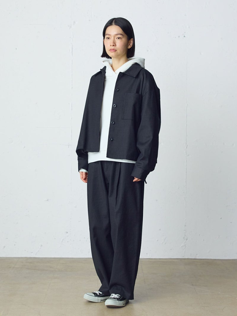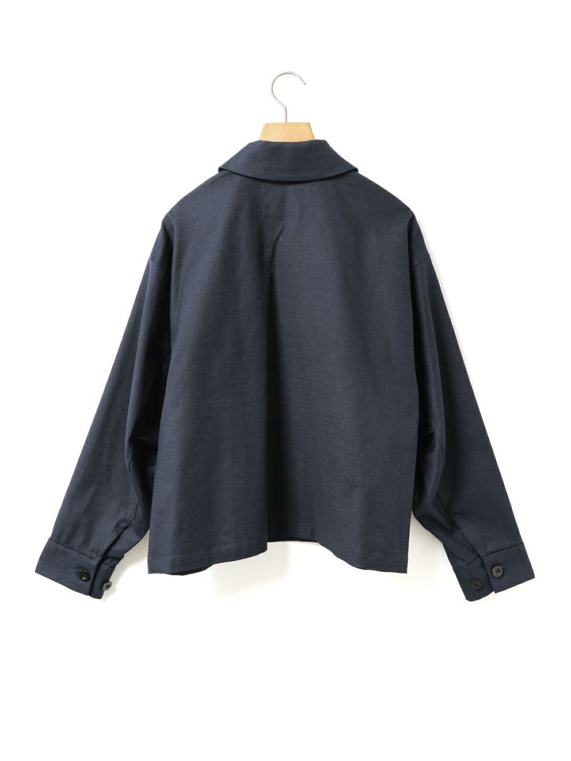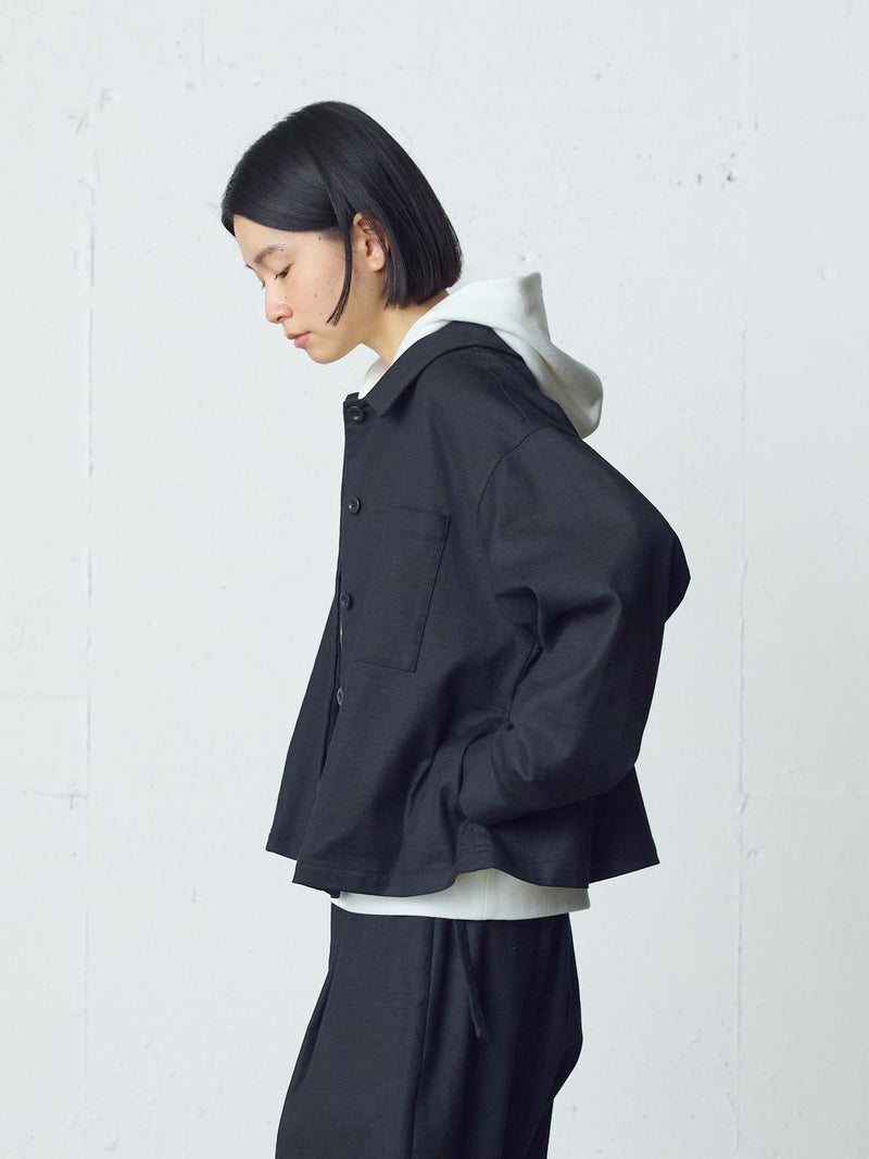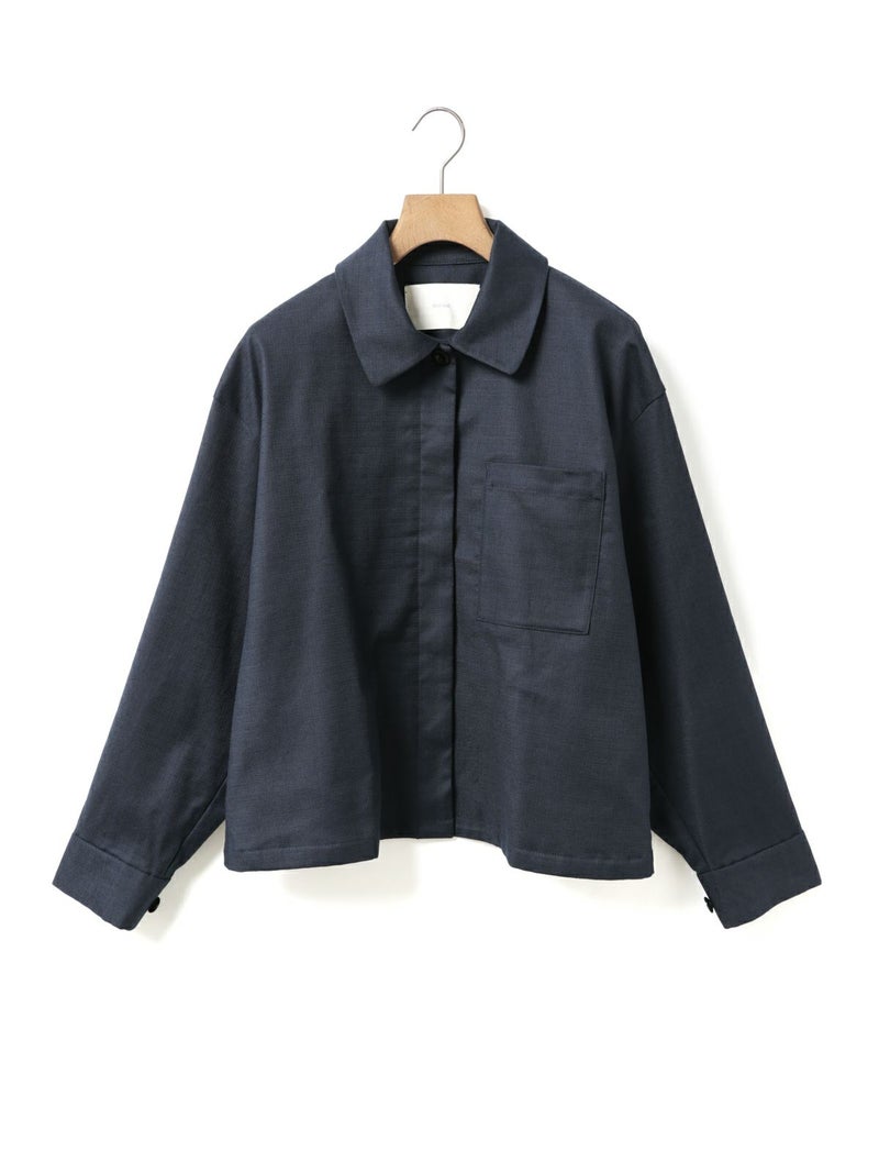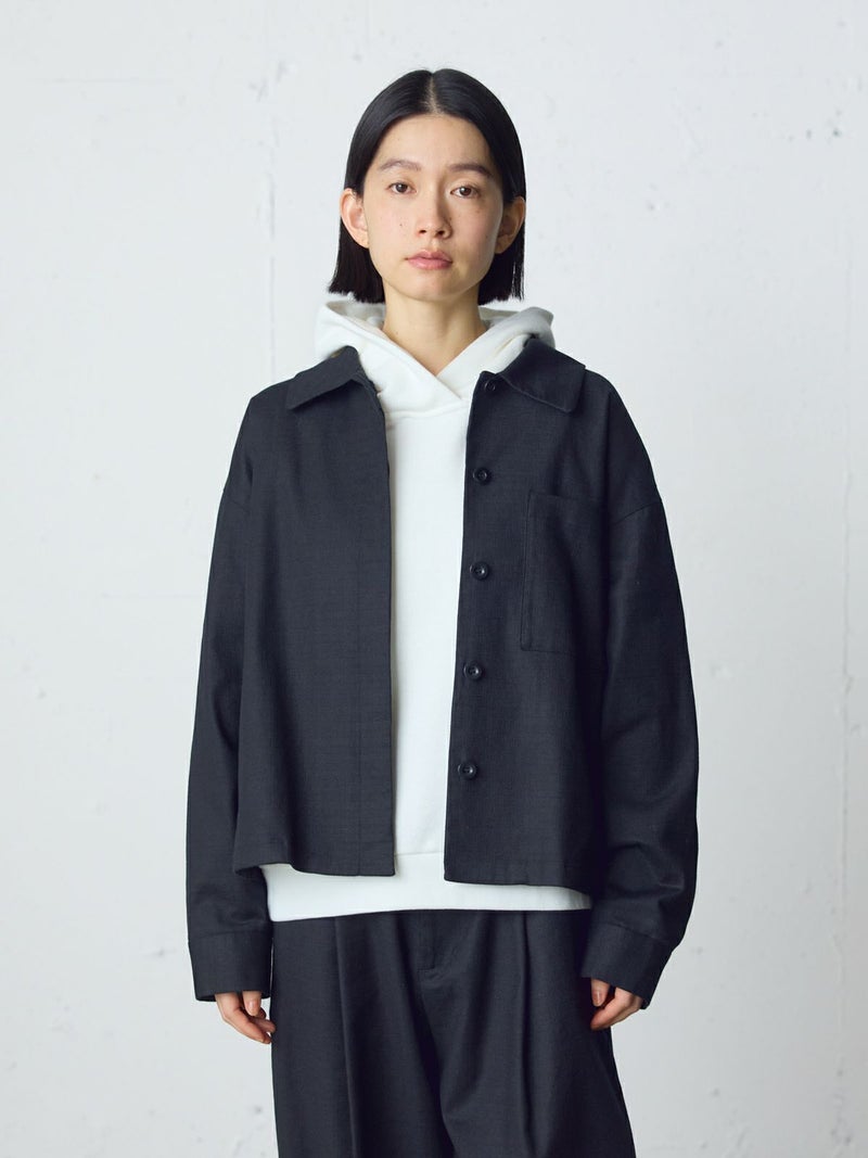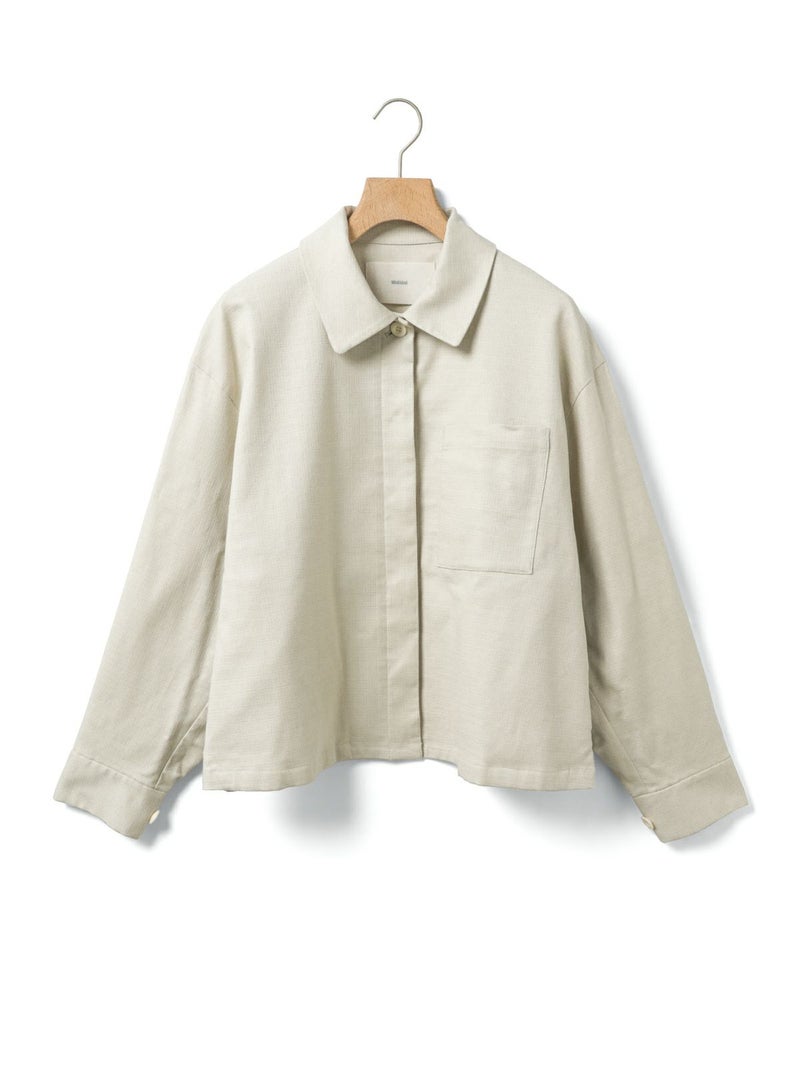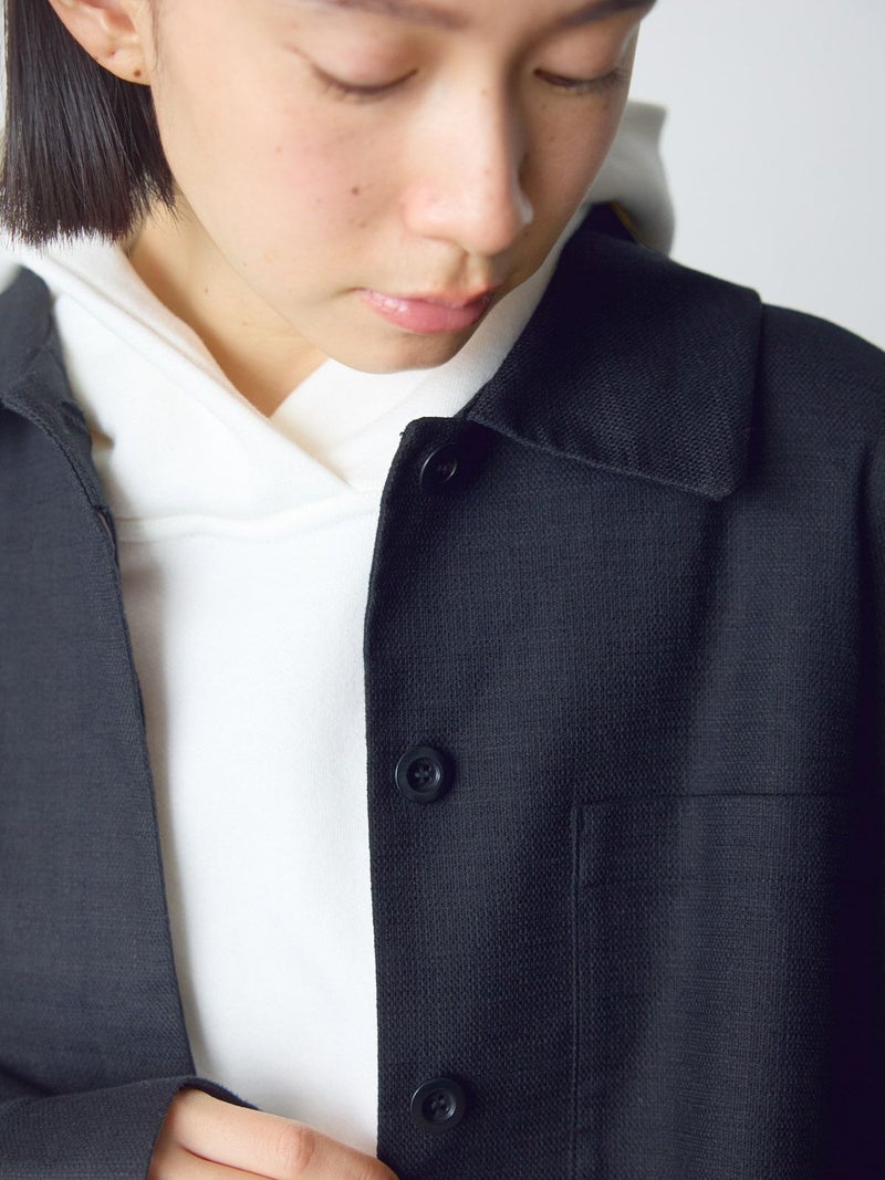 麻のような凹凸感がある素材をセミフォーマルな雰囲気に落とし込んだショートシャツジャケットです。袖にボリューム感を持たせ、ワーク感と上品さをミックスさせたジャケットです。フロントは比翼仕立てですっきりとしたデザイン。ヒップ上の短め丈でストレッチがきいて動きやすいのがポイント。フロントボタンを開けてラフに羽織っていただける1枚です。同シリーズ1-760124/ベルト付きスラックス、1-750116/バルーンサロペットも展開。