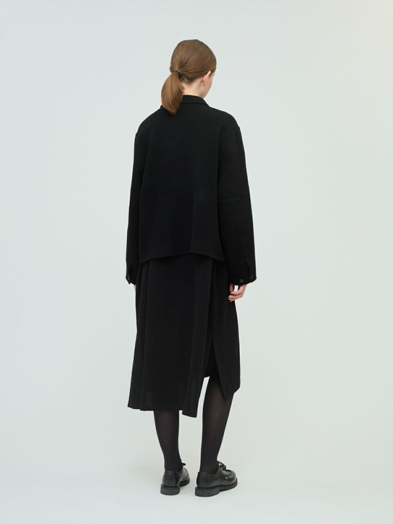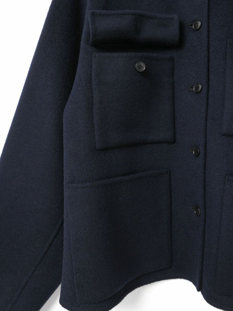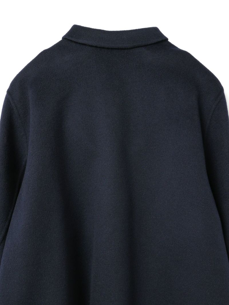 リバーフェイス素材を使用したウールユーティリティジャケットです。mizuiro ind新型のアウターで、メンズライクなカバーオールのデザインを表現しました。一枚仕立てで軽さと保温性の高さが魅力。手作業で縫い合わせた手間と時間がかかる、高級な仕立てで仕上げています。フロントボタン使用、フロントポケットが特徴的。ネイビーとブラックの2色に絞ったトラッドなアウターで長く愛用していただける1枚です。