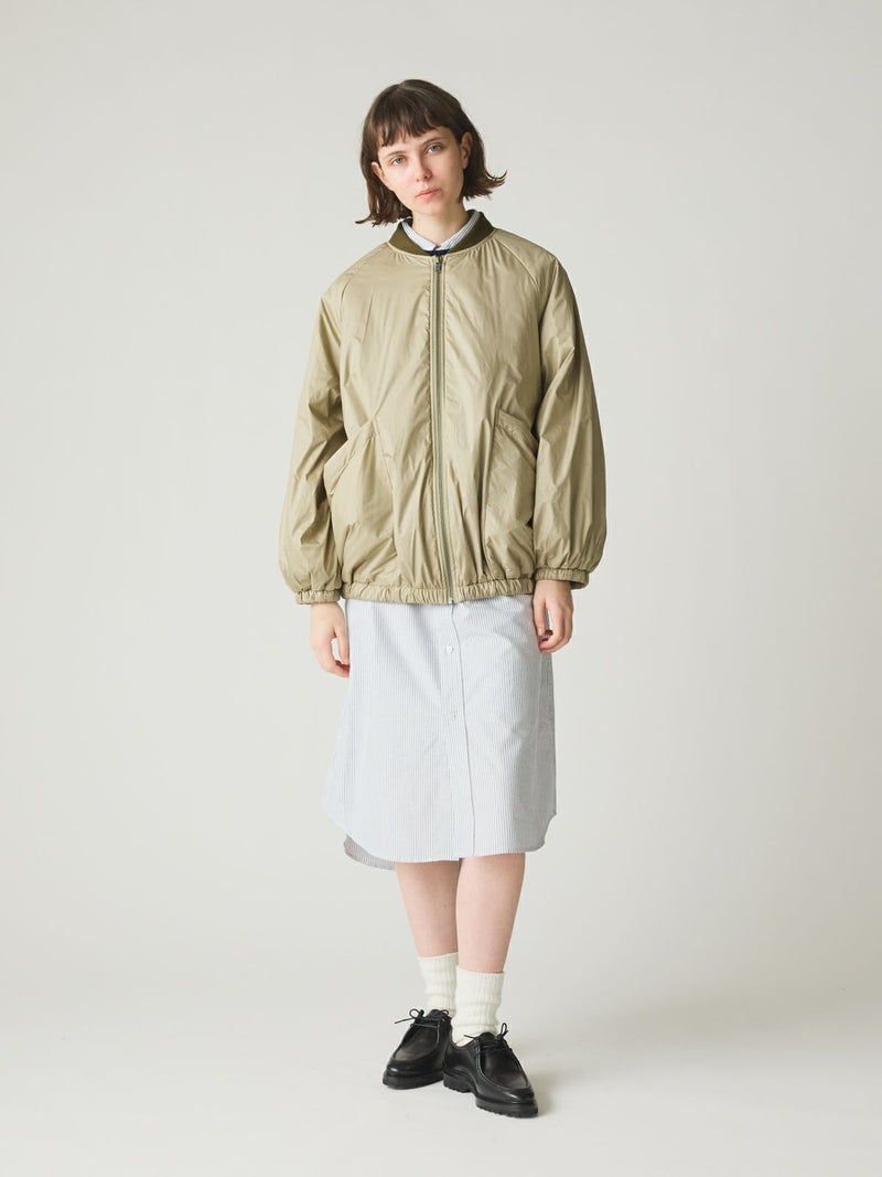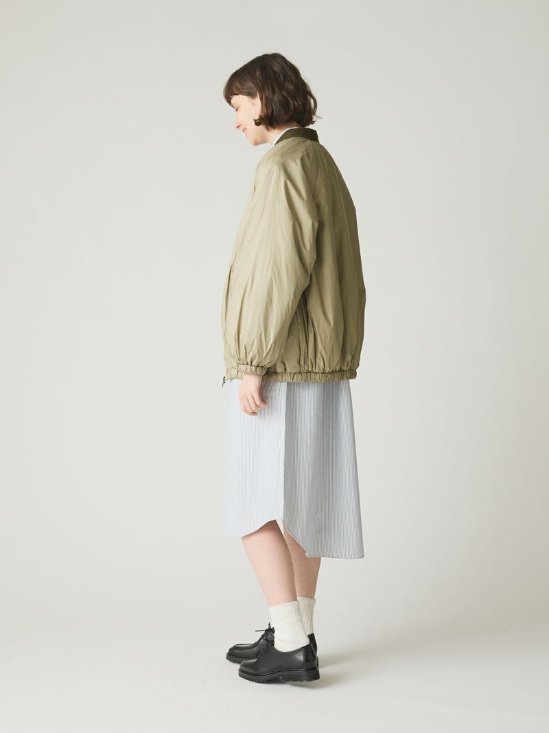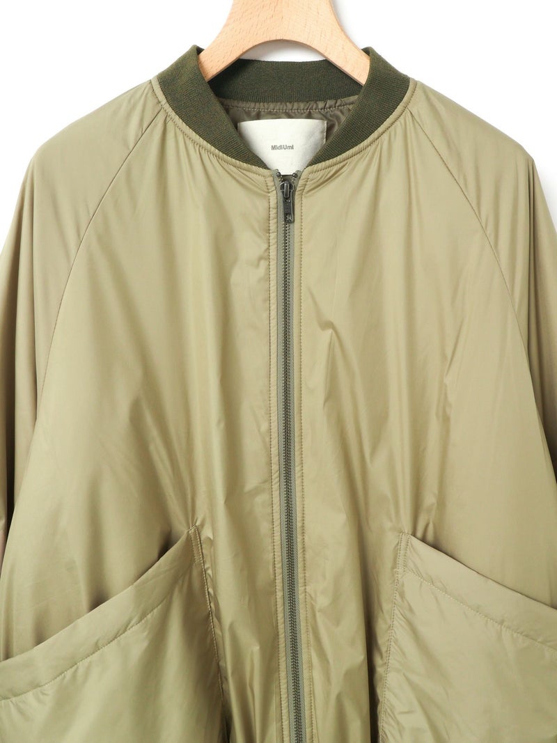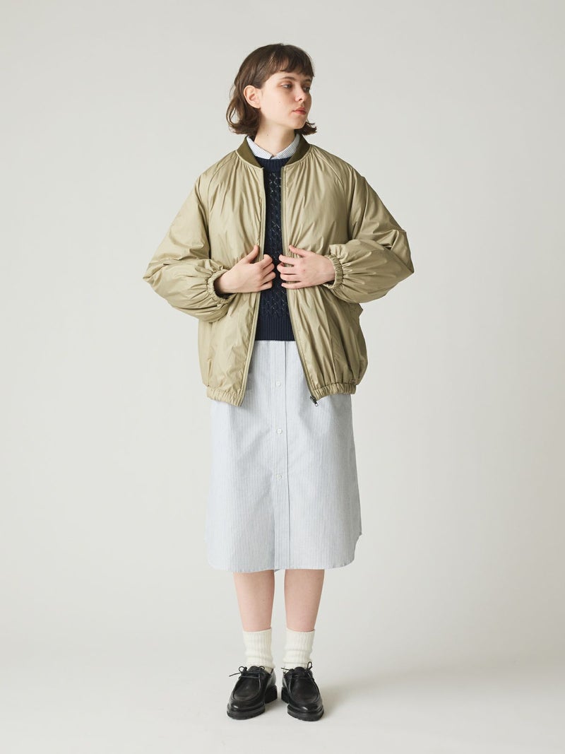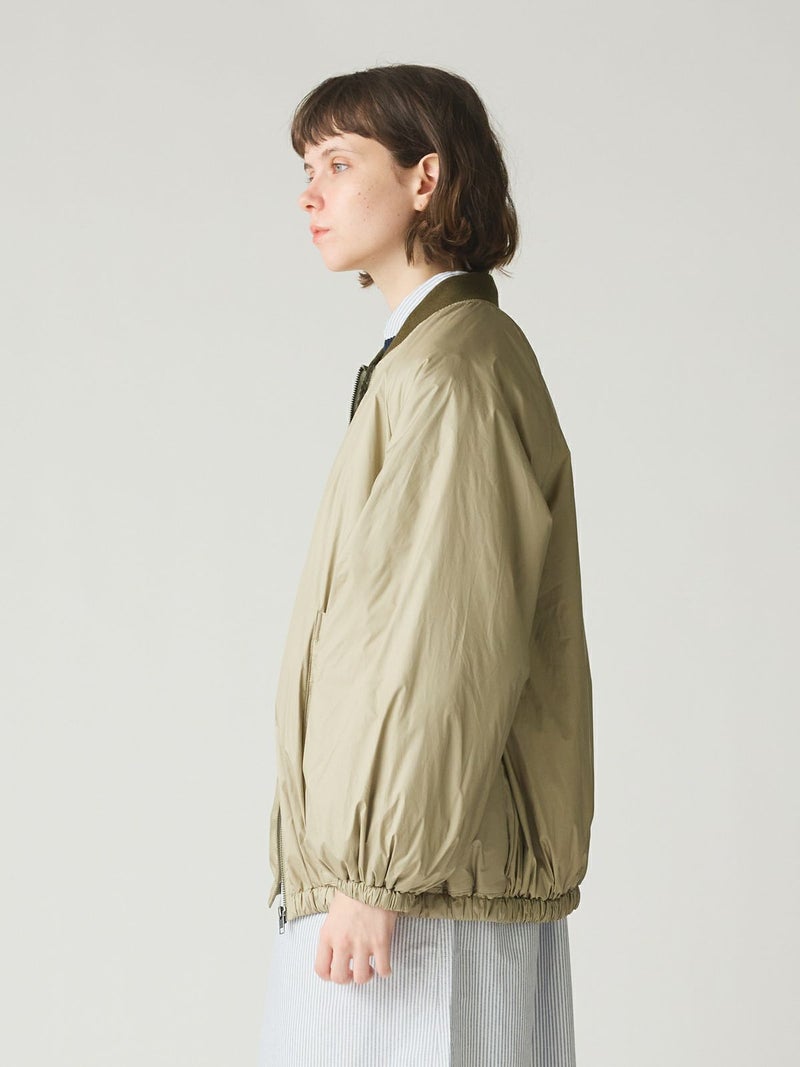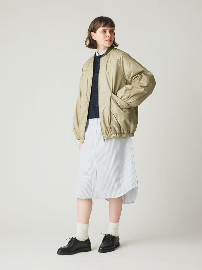 MidiUmiのリピート商品としてアイボリーを追加して再入荷した中綿ブルゾンです。薄い中綿を使用したボリューム感のあるライトアウターです。袖にボリューム感があります。袖口と裾はゴム使用。ヒップの隠れる着やすい着丈です。スカートとのコーディネートも素敵で女性らしいカジュアルな着こなしなど、色々なボトムと相性よくコーディネートしていただけます。中綿を使用していることでボリュームがありながら大変軽い1枚。手がすっぽりと入る大きなポケットもポイントです。