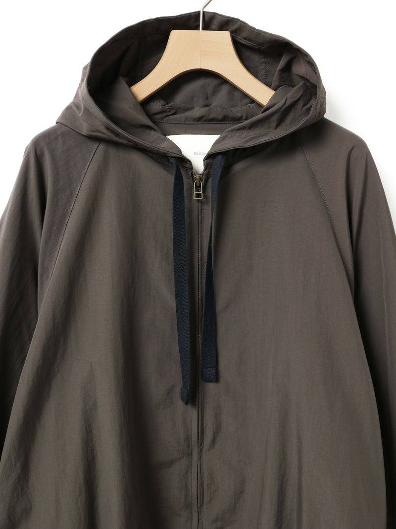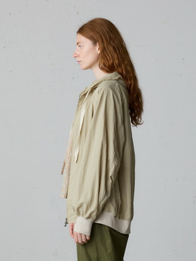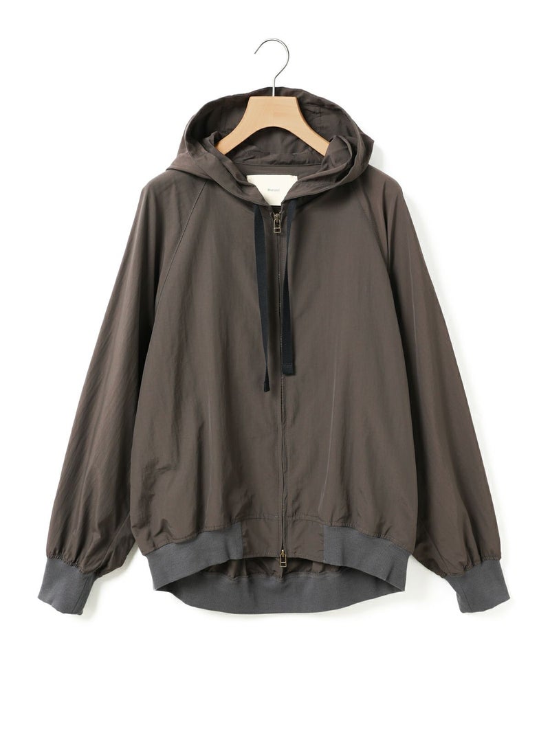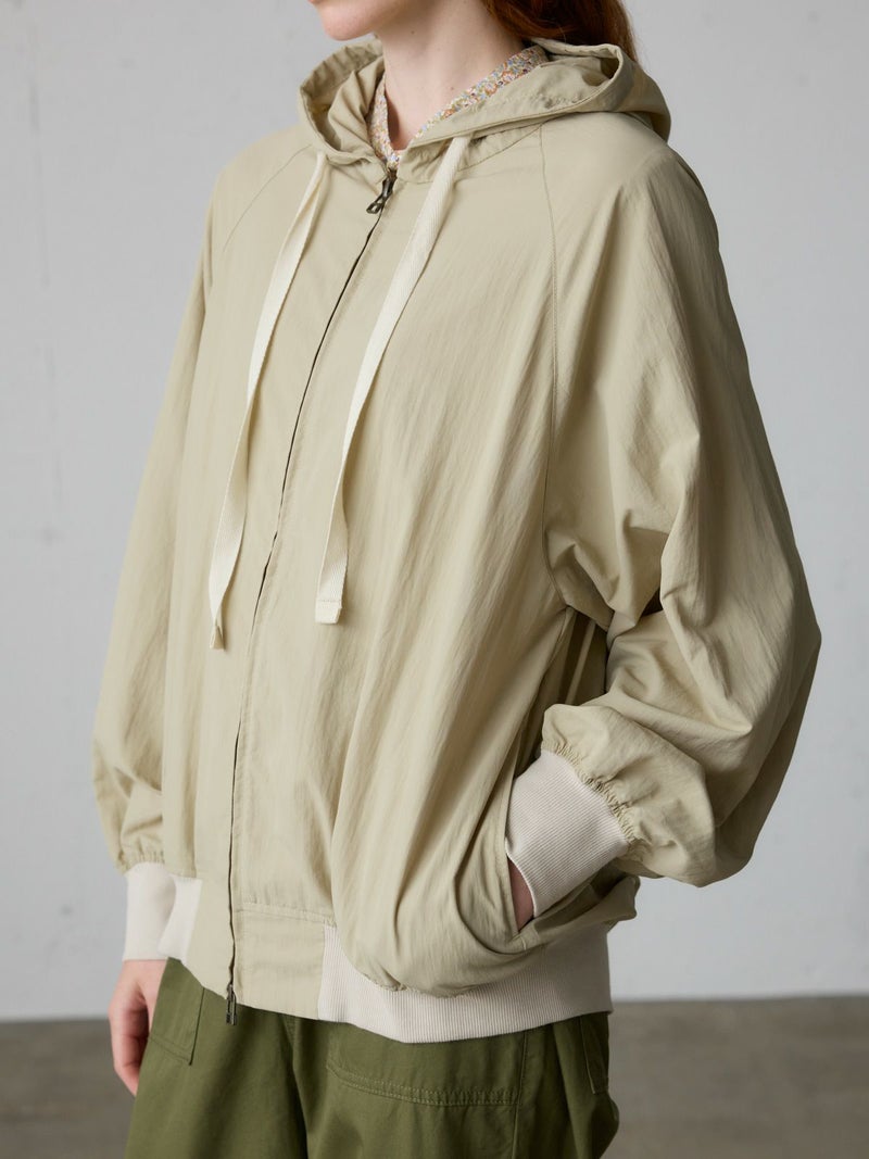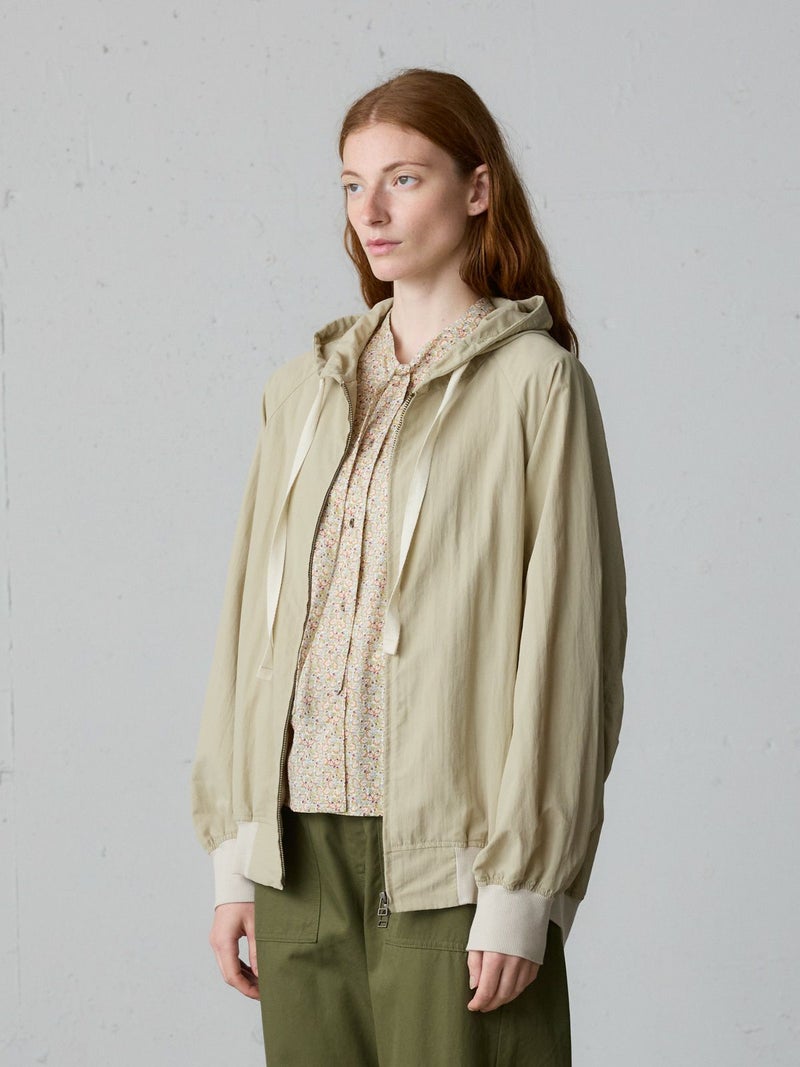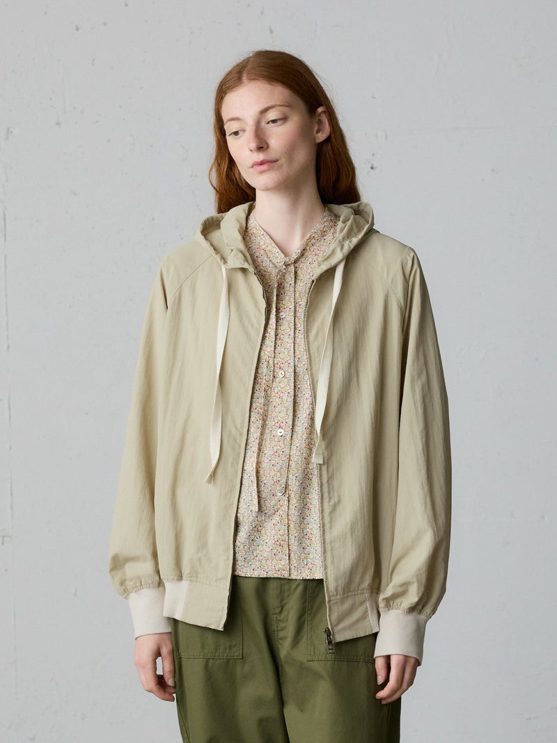 タスラン糸を使用したフード付きブルゾンです。タスラン糸は、ナイロンを高圧の空気で撚り合わせることで、コットンのような柔らかな風合いとナイロン特有の耐久性を兼ね備えた高品質な素材です。軽量でありながら強度が高く、風を通しにくい特性を持ち、軽い雨からも身を守る耐水性があります。Wファスナー仕様で、前を開けて着たり、リブを生かして裾をブラウジングしたりと、着こなしの幅が広がります。後ろに丸みを持たせたコクーンシルエットが、かわいらしい印象を演出。袖口と裾にはリブを施し、フィット感を高めています。コンパクトにたたんで持ち運びもできるため、急な寒さ対策にも便利です。落ち着きのある優しいカラー展開で、デイリーコーディネートに自然に馴染む一着です。ワイドパンツやスカートとのナチュラルスタイルや、ワンピースの上に軽く羽織るレイヤードスタイルなど、さまざまな着こなしを楽しめます。