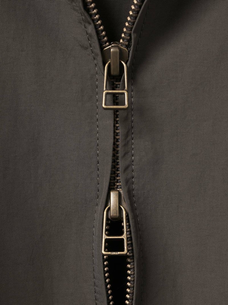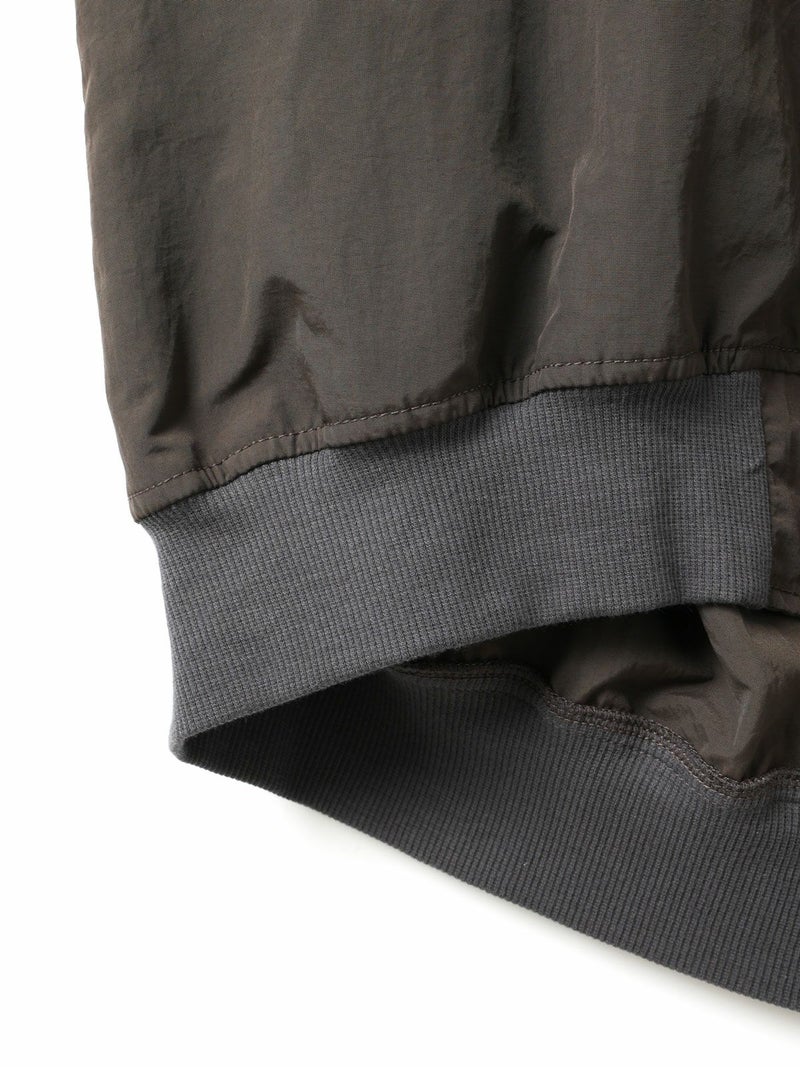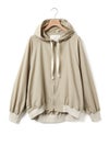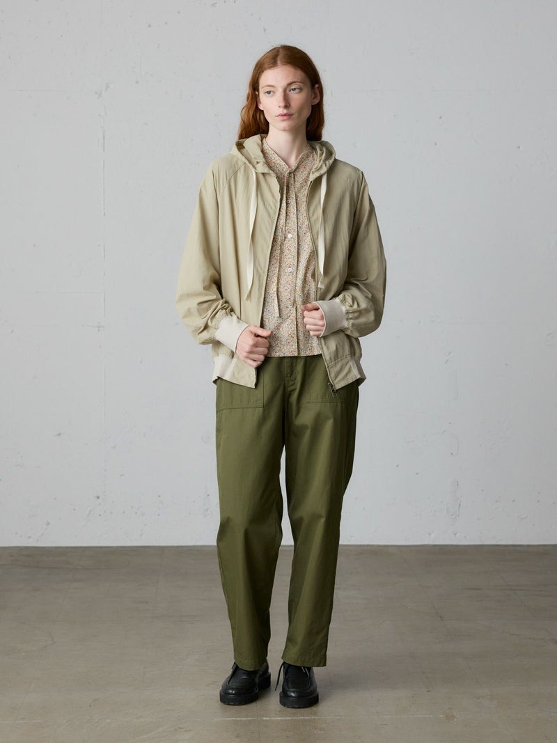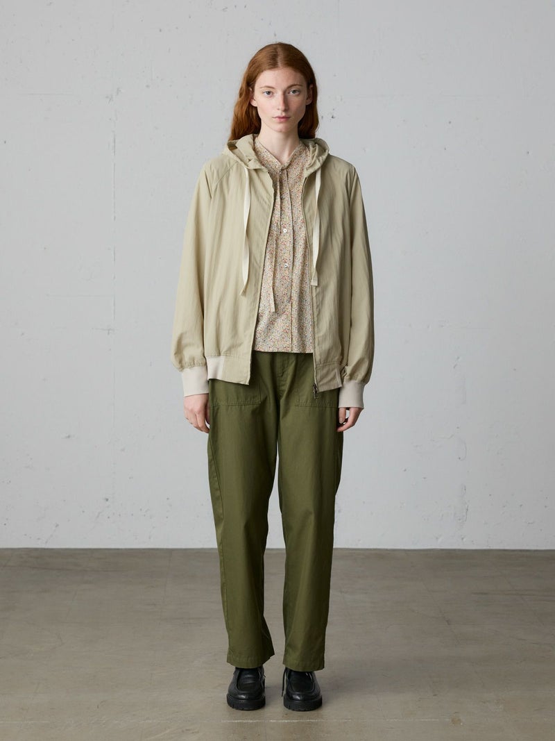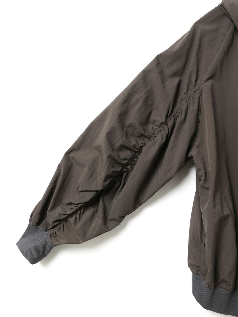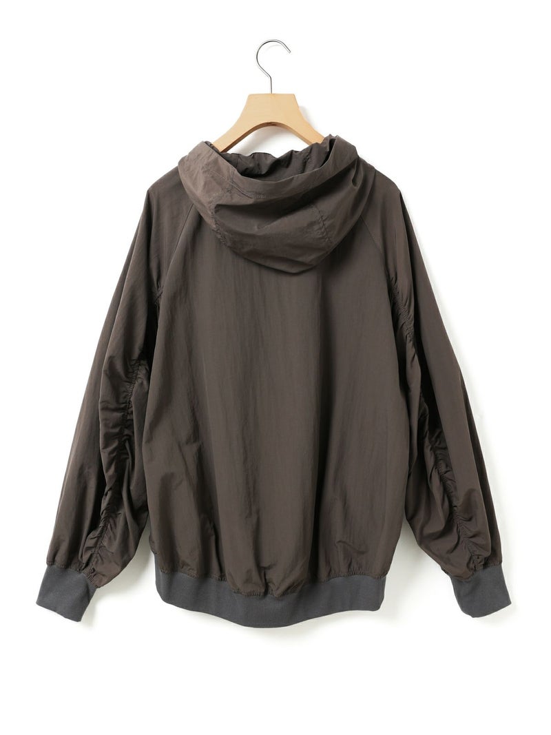 タスラン糸を使用したフード付きブルゾンです。タスラン糸は、ナイロンを高圧の空気で撚り合わせることで、コットンのような柔らかな風合いとナイロン特有の耐久性を兼ね備えた高品質な素材です。軽量でありながら強度が高く、風を通しにくい特性を持ち、軽い雨からも身を守る耐水性があります。Wファスナー仕様で、前を開けて着たり、リブを生かして裾をブラウジングしたりと、着こなしの幅が広がります。後ろに丸みを持たせたコクーンシルエットが、かわいらしい印象を演出。袖口と裾にはリブを施し、フィット感を高めています。コンパクトにたたんで持ち運びもできるため、急な寒さ対策にも便利です。落ち着きのある優しいカラー展開で、デイリーコーディネートに自然に馴染む一着です。ワイドパンツやスカートとのナチュラルスタイルや、ワンピースの上に軽く羽織るレイヤードスタイルなど、さまざまな着こなしを楽しめます。