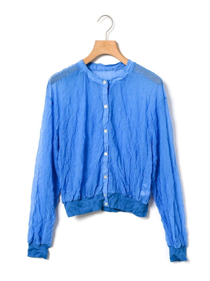 クラッシュワッシャー加工を施したワッシャープロセスカーディガンです。特徴のある光沢感と透け感のある繊細な生地を使用しており、縫製に技術と手間を惜しまず使って仕上げました。しなやかでほどよいストレッチがきいているので動きやすく着心地の良さを体感していただけます。身頃はキレイなシアー素材に仕上げており、袖カフス部と裾がコットンリブを使用したメリハリのあるデザインが特徴。全体的にコンパクトですっきりとしたサイズ感仕上げで、羽織りアイテムとしてもプルオーバーとしてコーディネートしても素敵です。色鮮やかなブルーを差し色にした3色展開です。同シリーズ1-810072/ワッシャープロセスTシャツも展開。