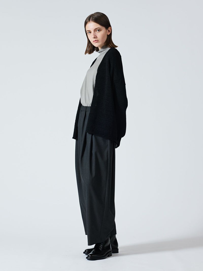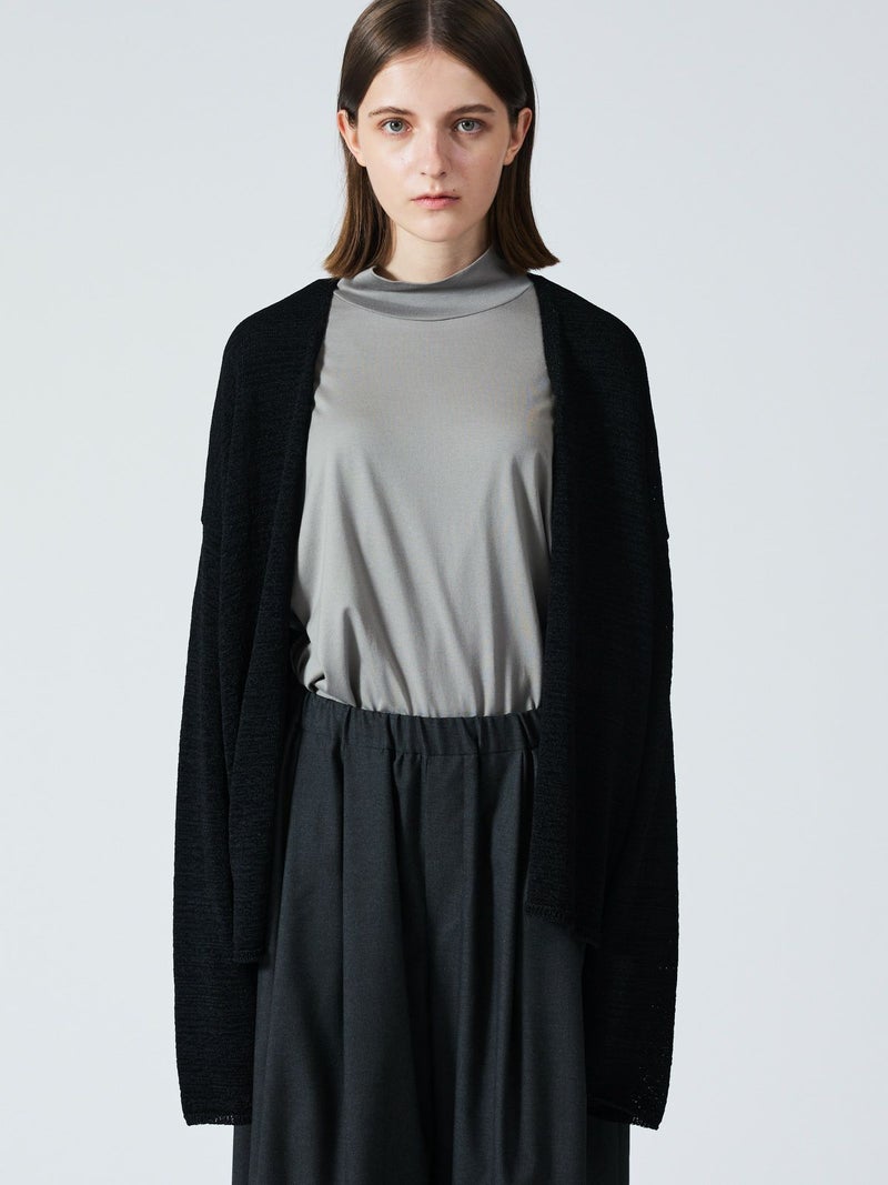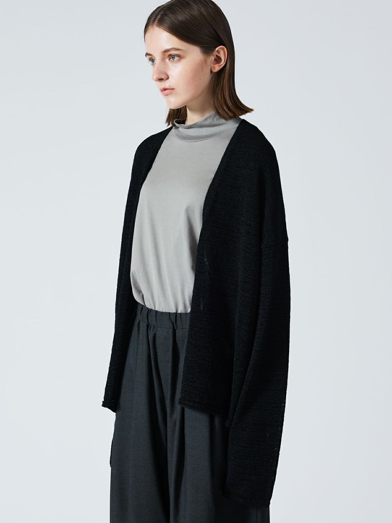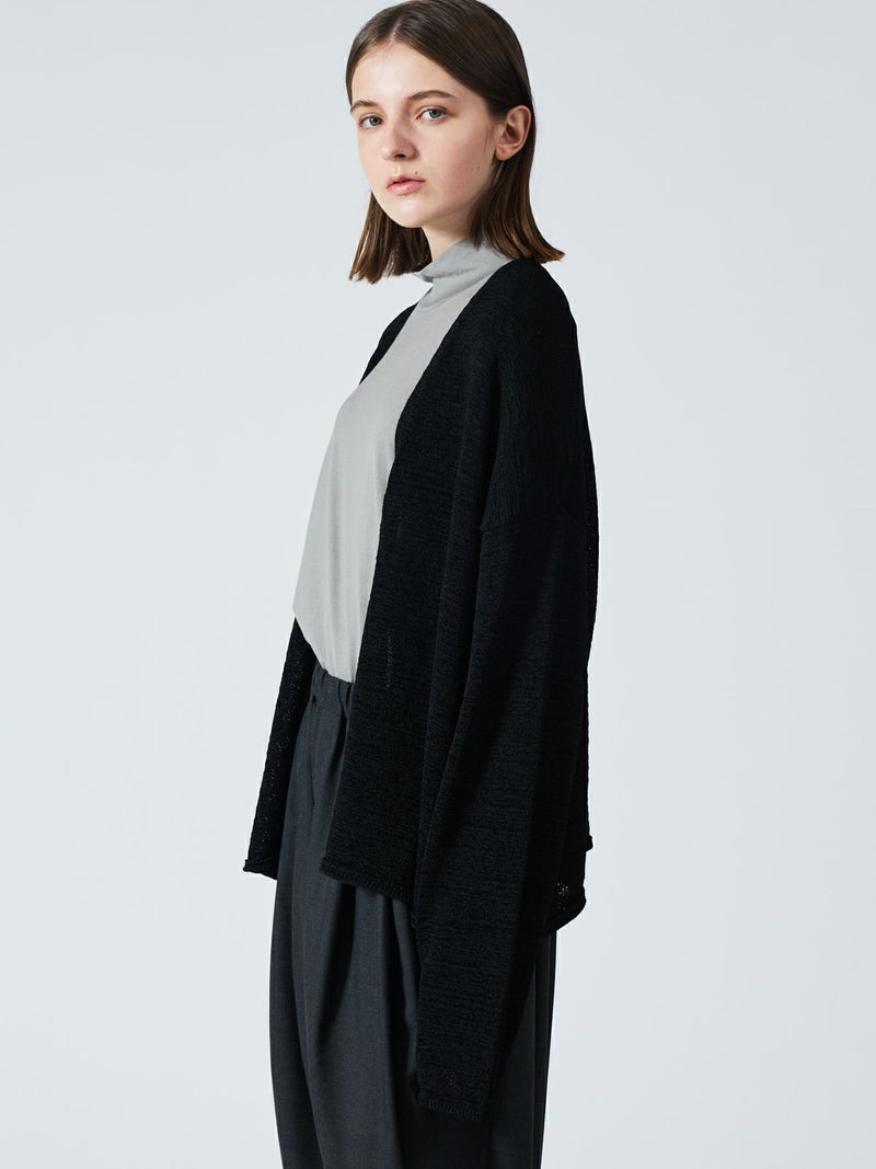 テープヤーンを使用したテープヤーンカーディガンです。麻ライクでシャリ感のある肌当たりが特徴。フロントボタンを使わないスッキリとしたデザインでしなやかに動きのあるシルエットを表現します。ヒップの隠れる丈感、ゆとりのあるサイズ感で気軽に羽織っていただけ季節の変わり目や気温の変化にも対応できる羽織アイテムです。シックなミックス色とブラックの2色展開。同シリーズの3-220069/テープヤーン襟付きプルオーバーも展開。