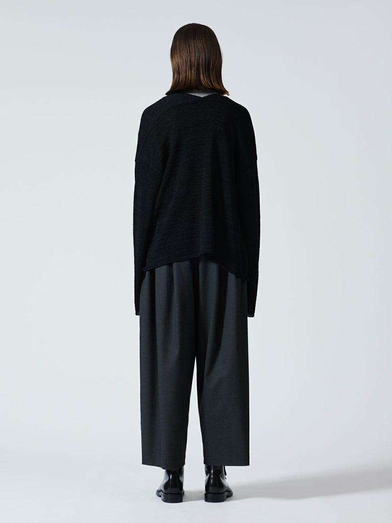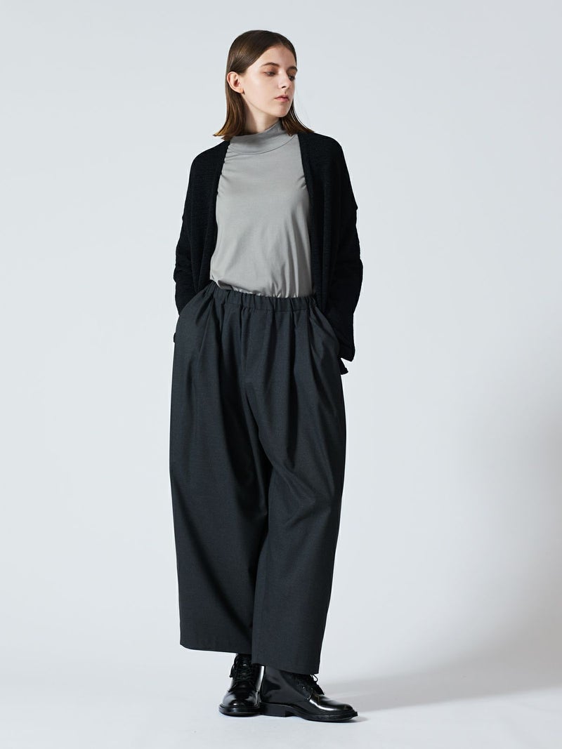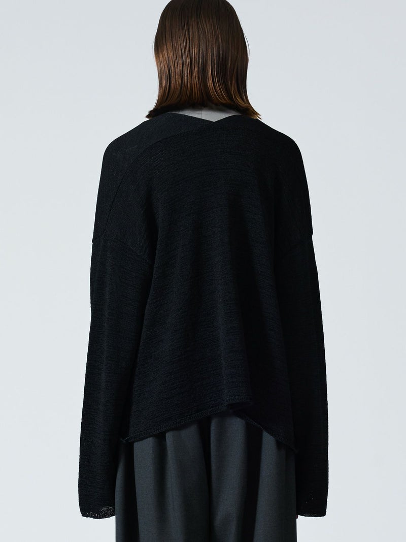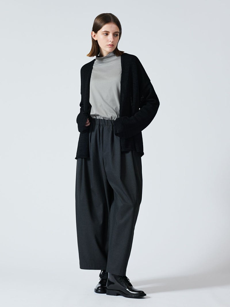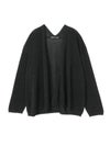 テープヤーンを使用したテープヤーンカーディガンです。麻ライクでシャリ感のある肌当たりが特徴。フロントボタンを使わないスッキリとしたデザインでしなやかに動きのあるシルエットを表現します。ヒップの隠れる丈感、ゆとりのあるサイズ感で気軽に羽織っていただけ季節の変わり目や気温の変化にも対応できる羽織アイテムです。シックなミックス色とブラックの2色展開。同シリーズの3-220069/テープヤーン襟付きプルオーバーも展開。