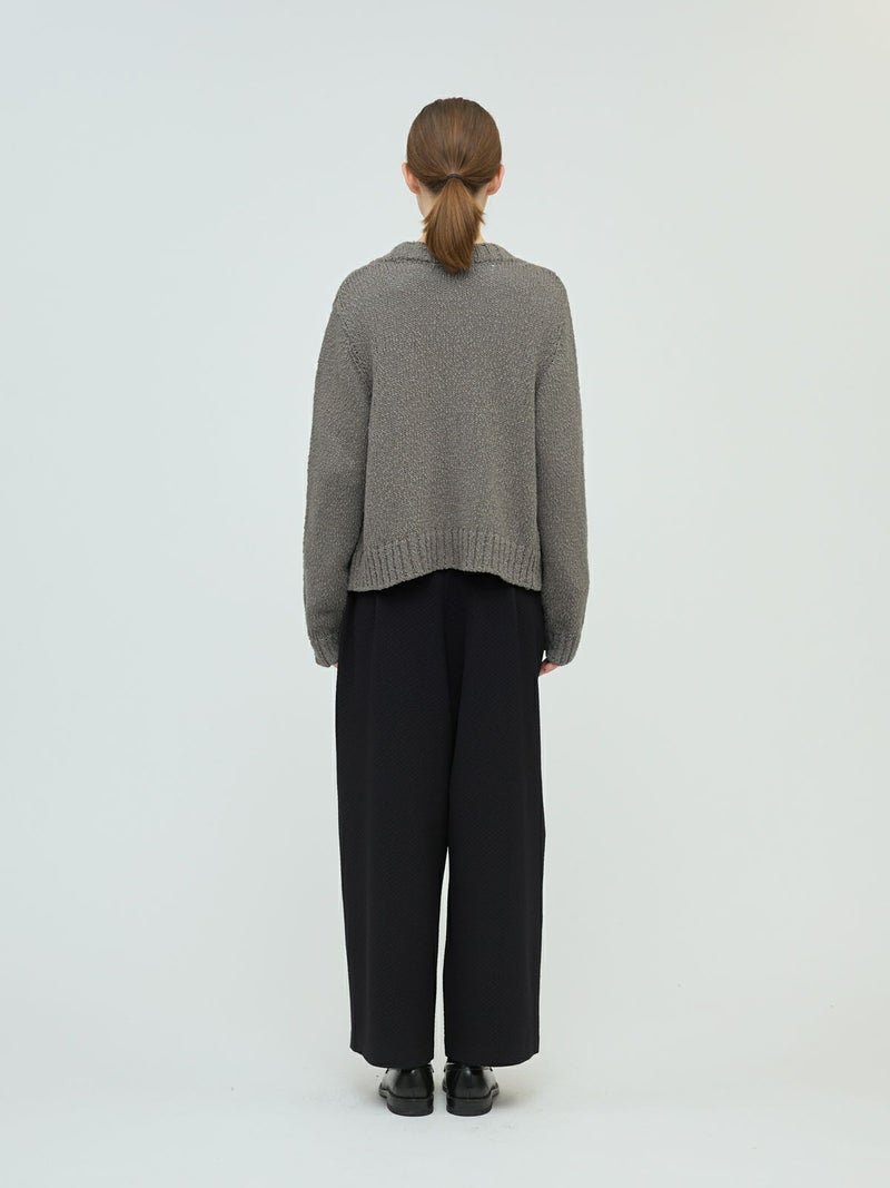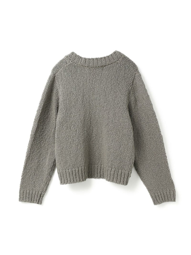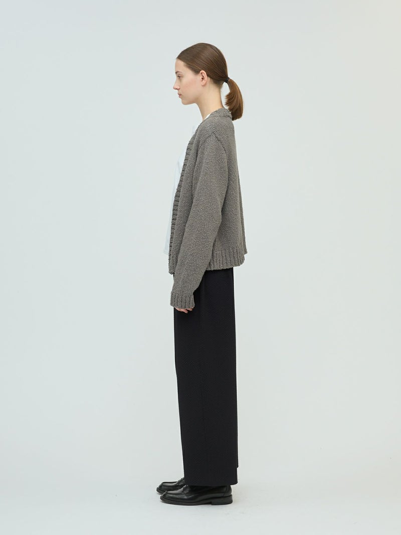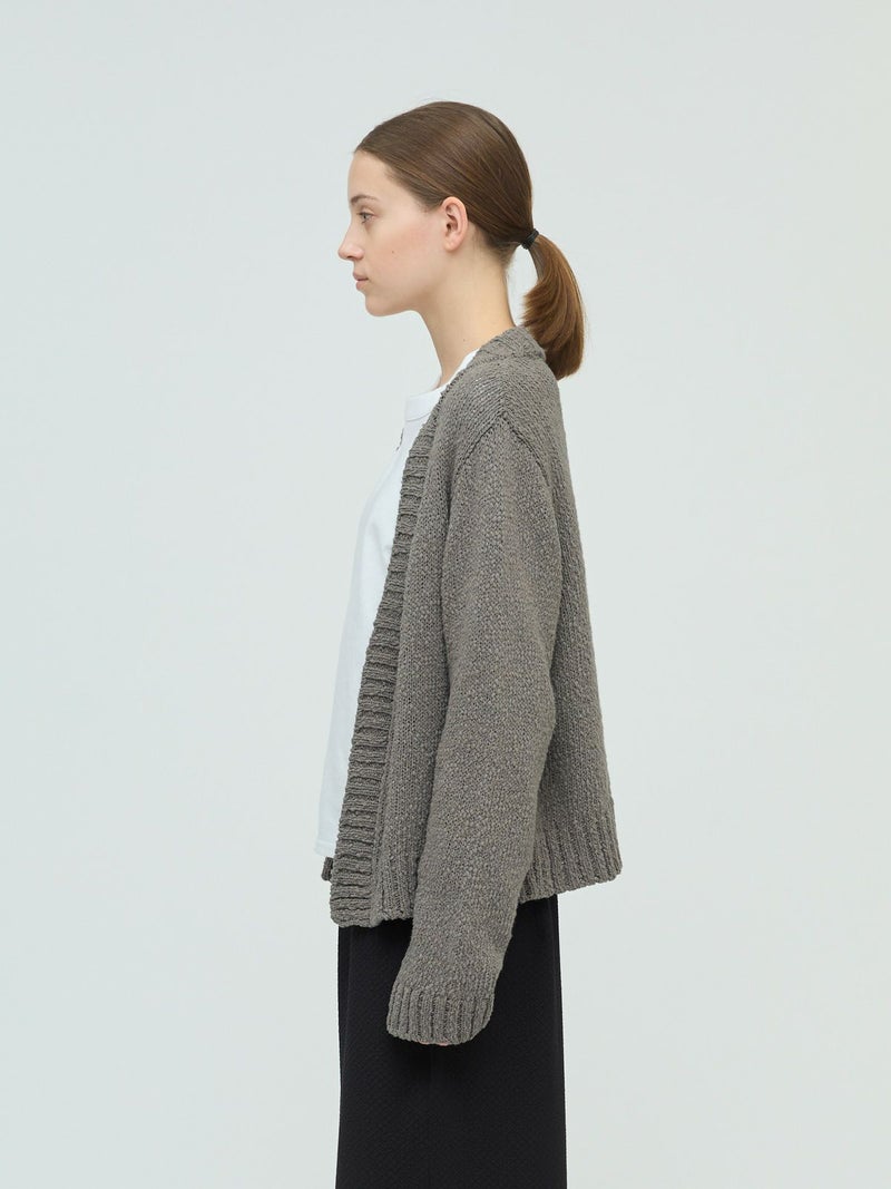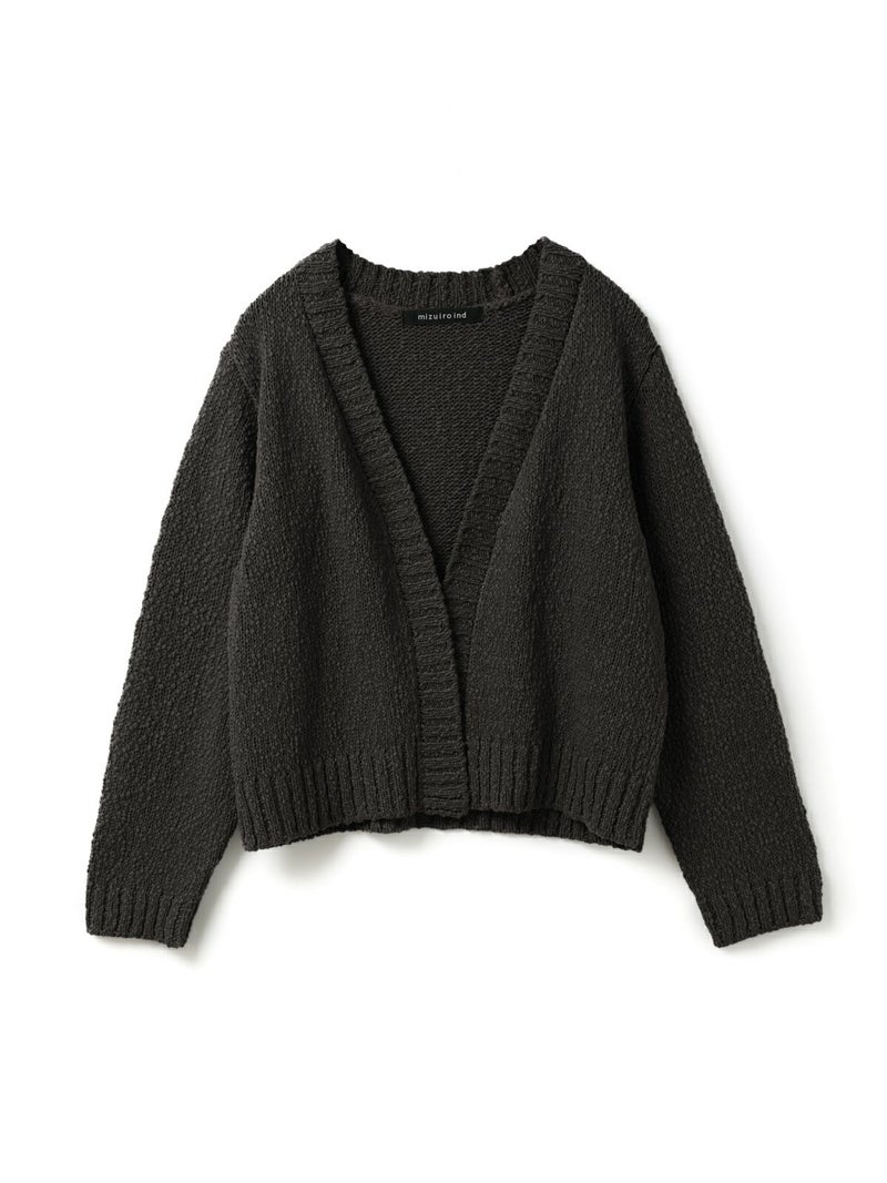 肉厚でスラブ感のあるリリーヤーンVネックカーディガンです。パイル調のスラブ糸の凸凹とした生地感が特徴。ショートでワイドなサイズ感を提案。フロントボタンをなくしサラッと羽織っていただけるカーディガンを表現しました。落ち着きのある優しい色合いも大人の魅力を引き出しています。秋冬のニットシリーズとして同じスラブニットを使用した3-220118/リリーヤーンベストも展開。