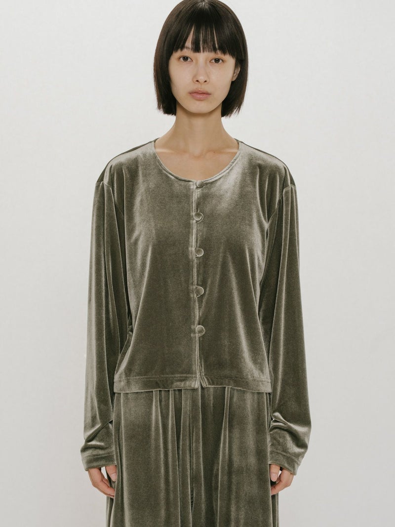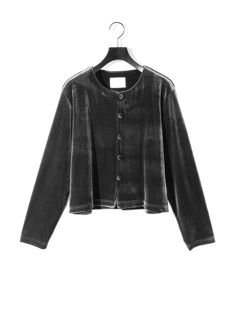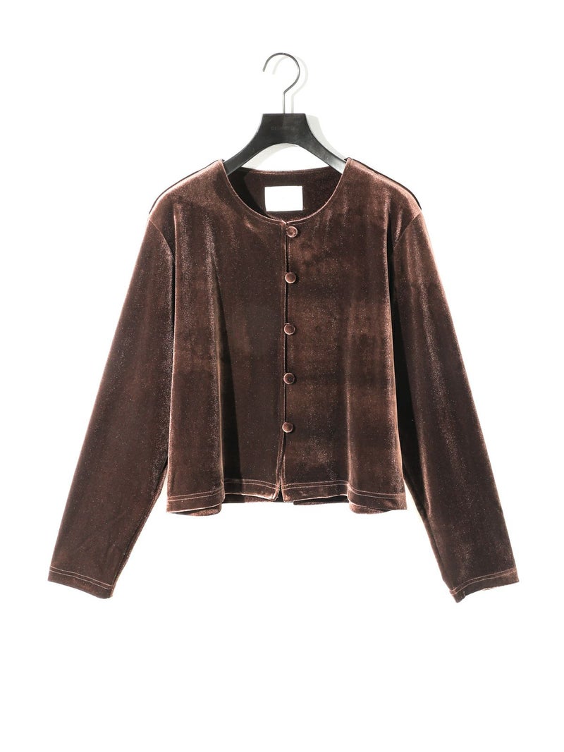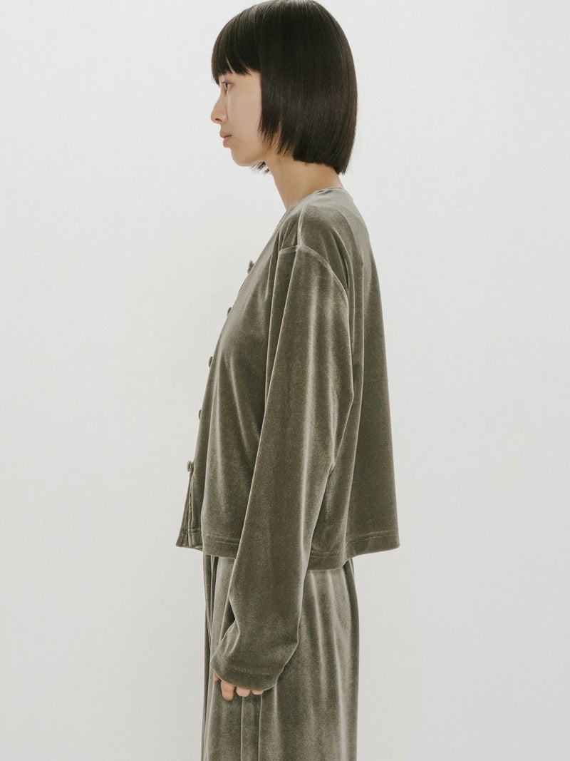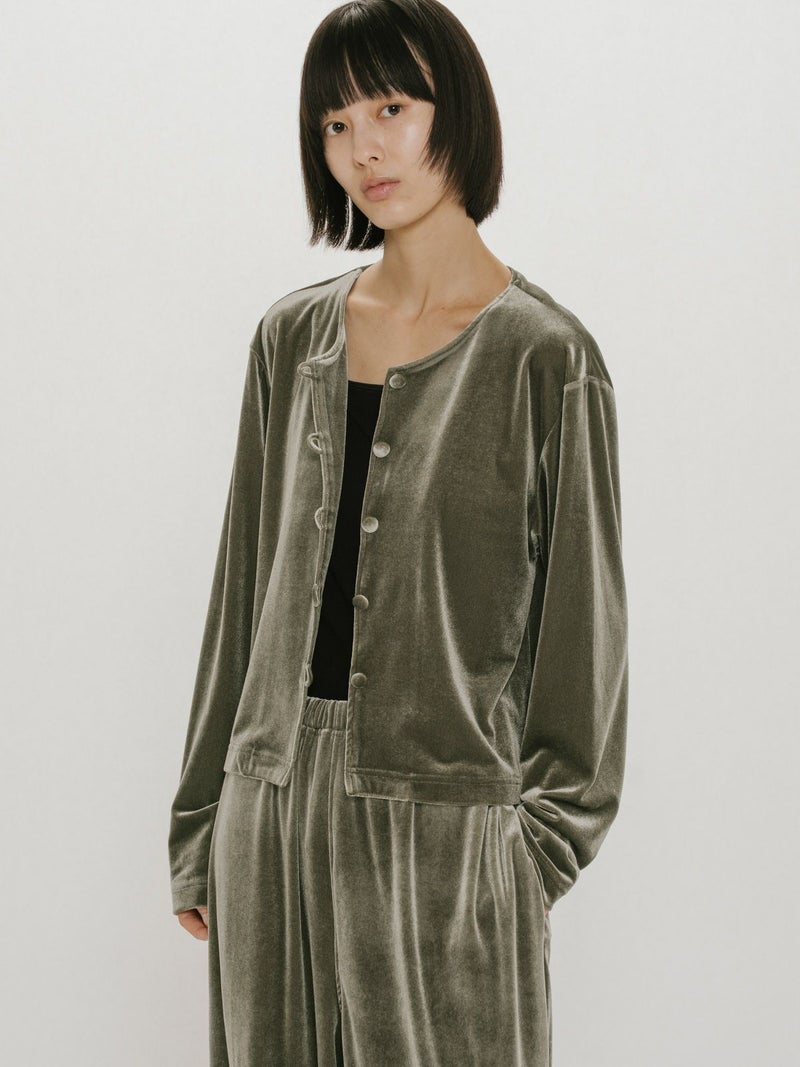煌びやかな光沢が美しいベロア素材を使用したクルーネックカーディガン。丸いループ留めボタンがさりげないポイントに。すっきりとしたショート丈と、ジャストすぎないほどよいワイドシルエットで、どんなボトムともバランスよく合わせられます。もっちりとした伸縮性のある素材で着心地も抜群。一枚で華やかに決まり、ニットやシャツを合わせるだけでシーズンムード漂う大人のスタイリングが完成します。